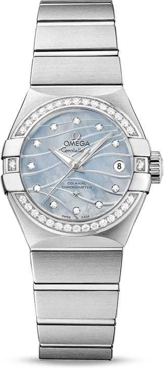 The diamond-set bezel is mounted on a 27 mm stainless steel case and is presented on a stainless steel bracelet. This timepiece is powered by the OMEGA Co-Axial calibre 8520.