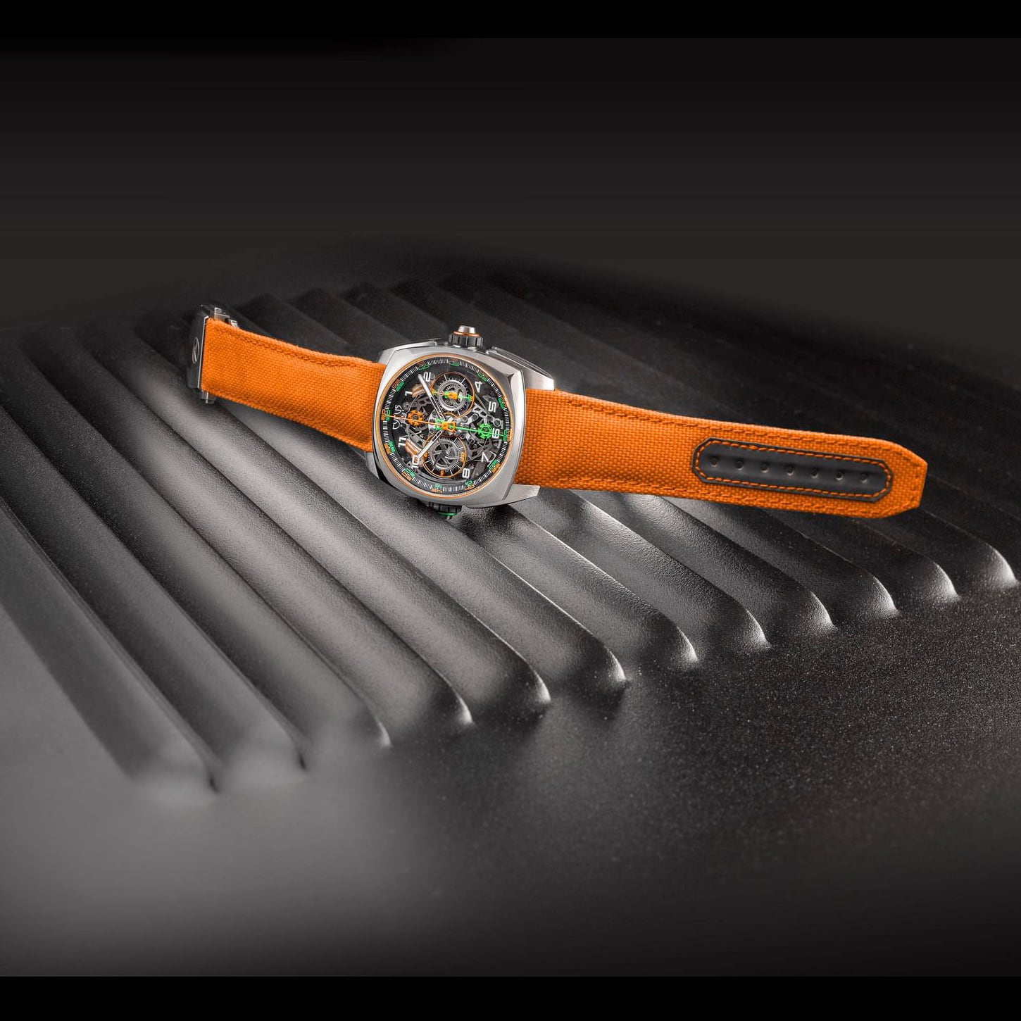 The timepiece is equipped with two independent monopusher chronographs for measuring two short time intervals independently or in synchrony, all housed in a single manufactured mechanical self-winding movement. Its star function, the 30-minute counter at 3 o'clock, features two mirrored orange and green hands. The same colour scheme is applied to the two central seconds hands, which track the seconds on the flange printed with two parallel scales in the same colours.