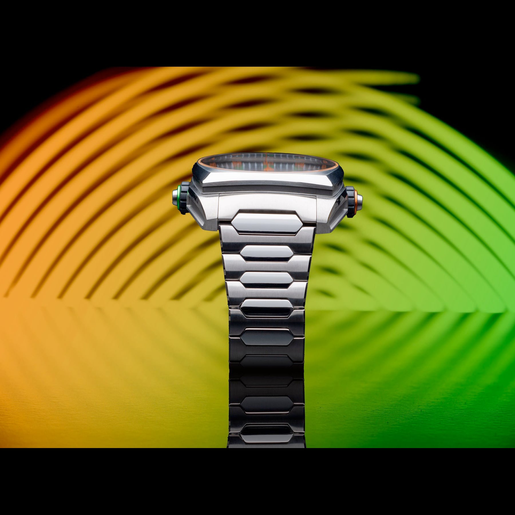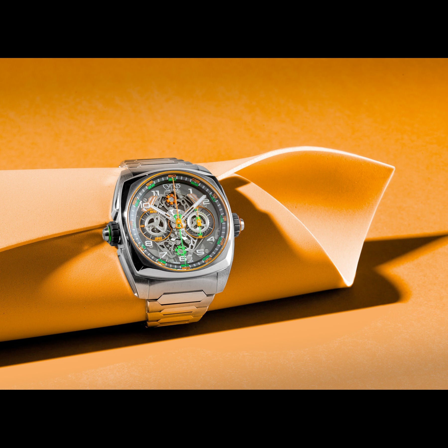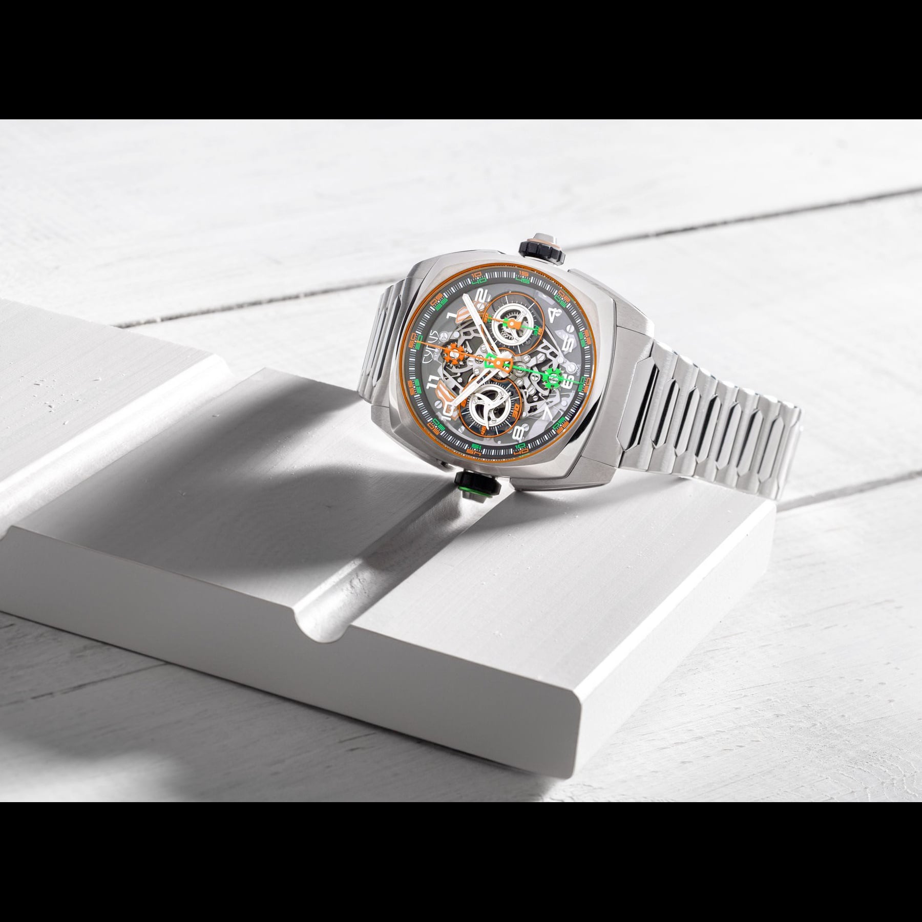 Inspired by timing demands for sporting competitions, Klepcys DICE (acronym for Double Independent Chronograph Evolution) is an innovative “Double Independent Monopusher Chronograph”. First introduced in 2021, the latest addition to the DICE family is the “Klepcys DICE Saffron” featuring a revamped look now in the shades of saffron orange and bright green, complemented by a titanium bracelet or an orange Cordura strap.