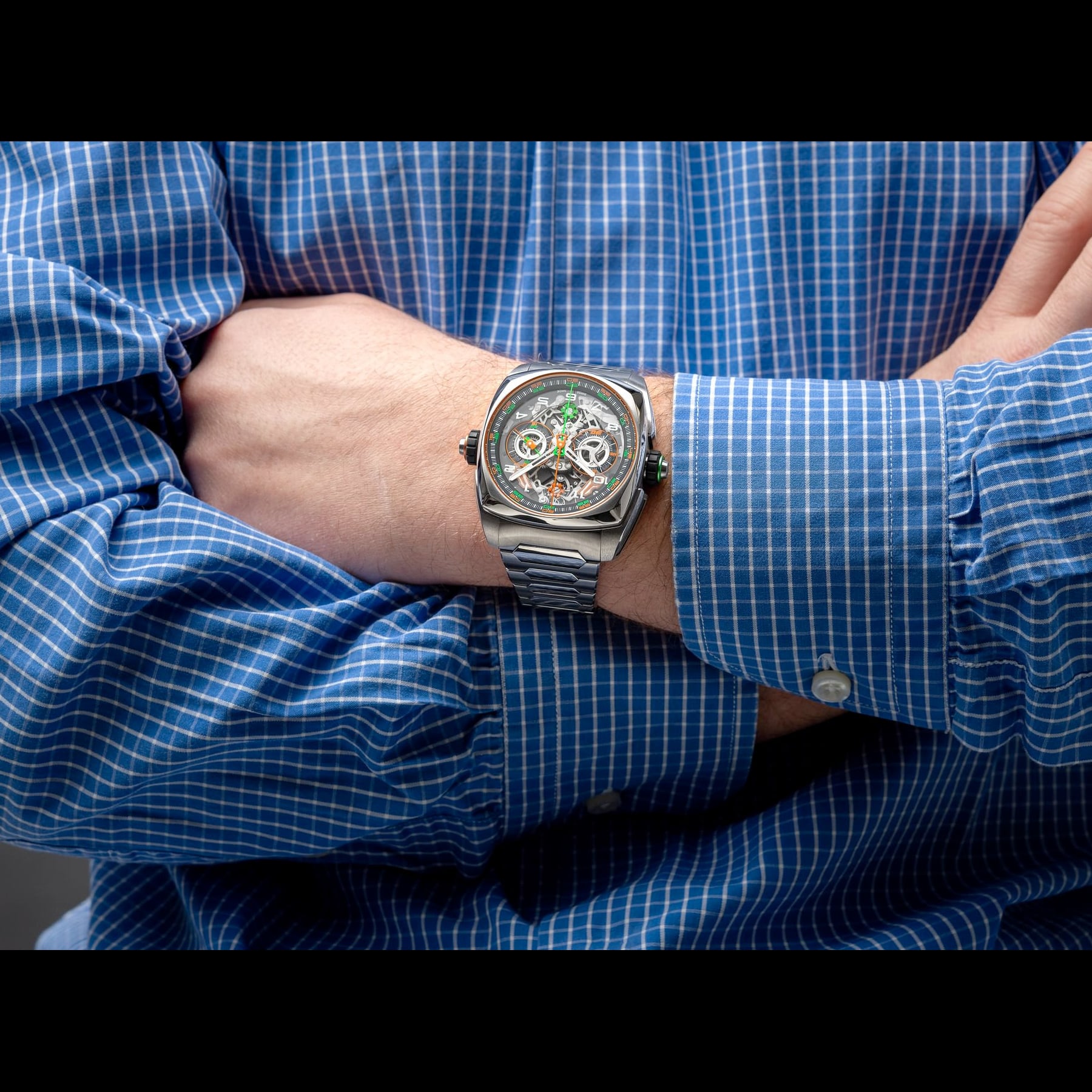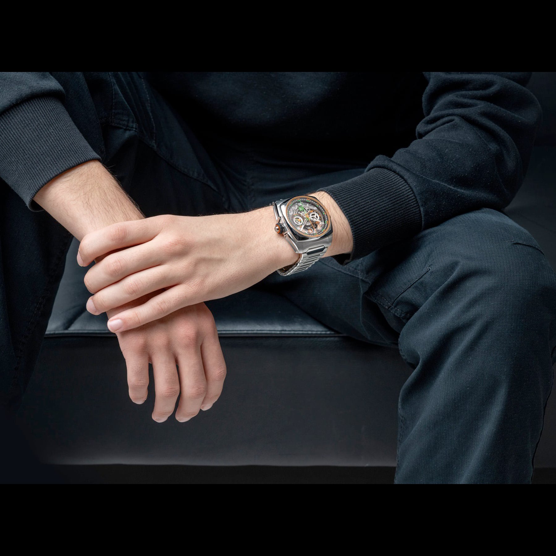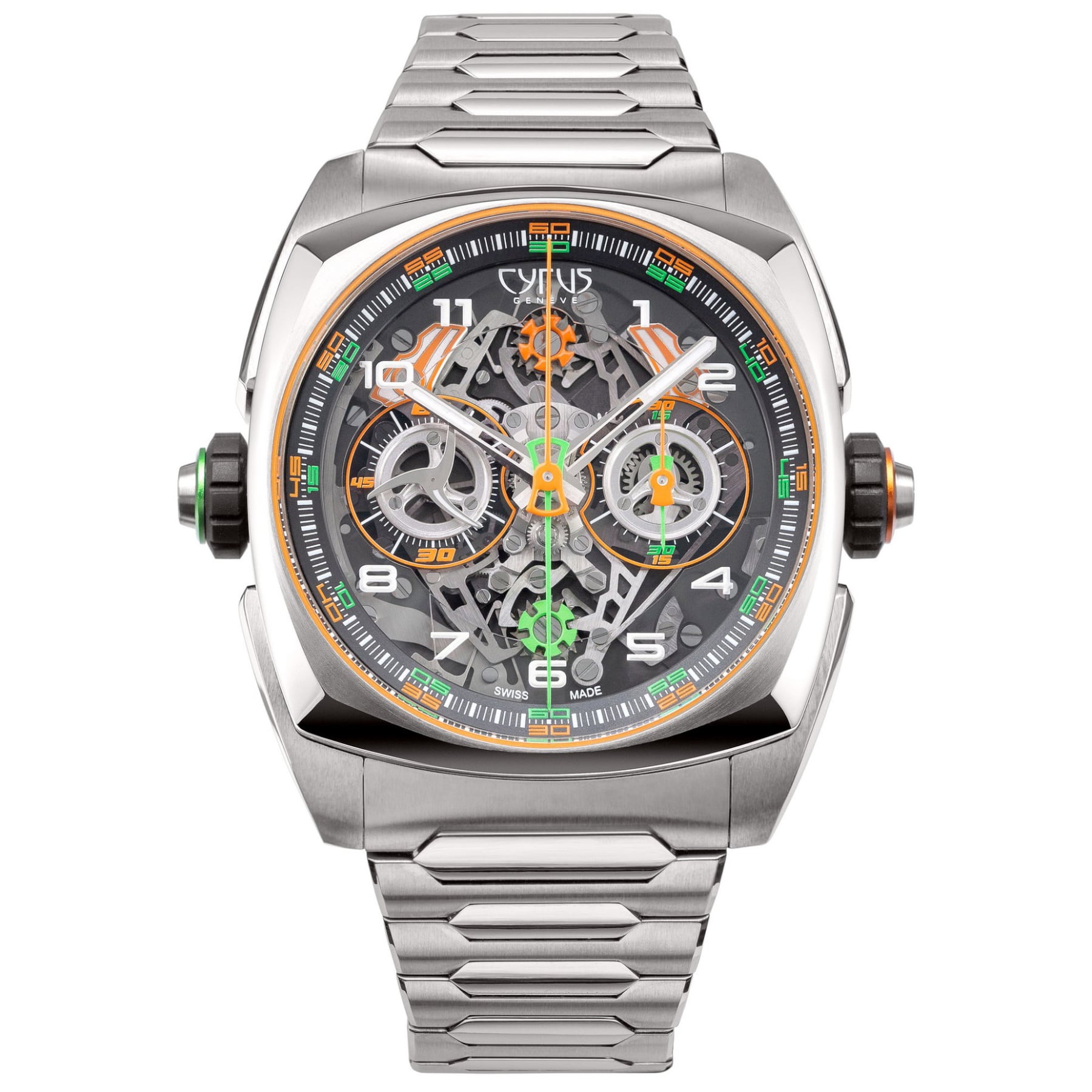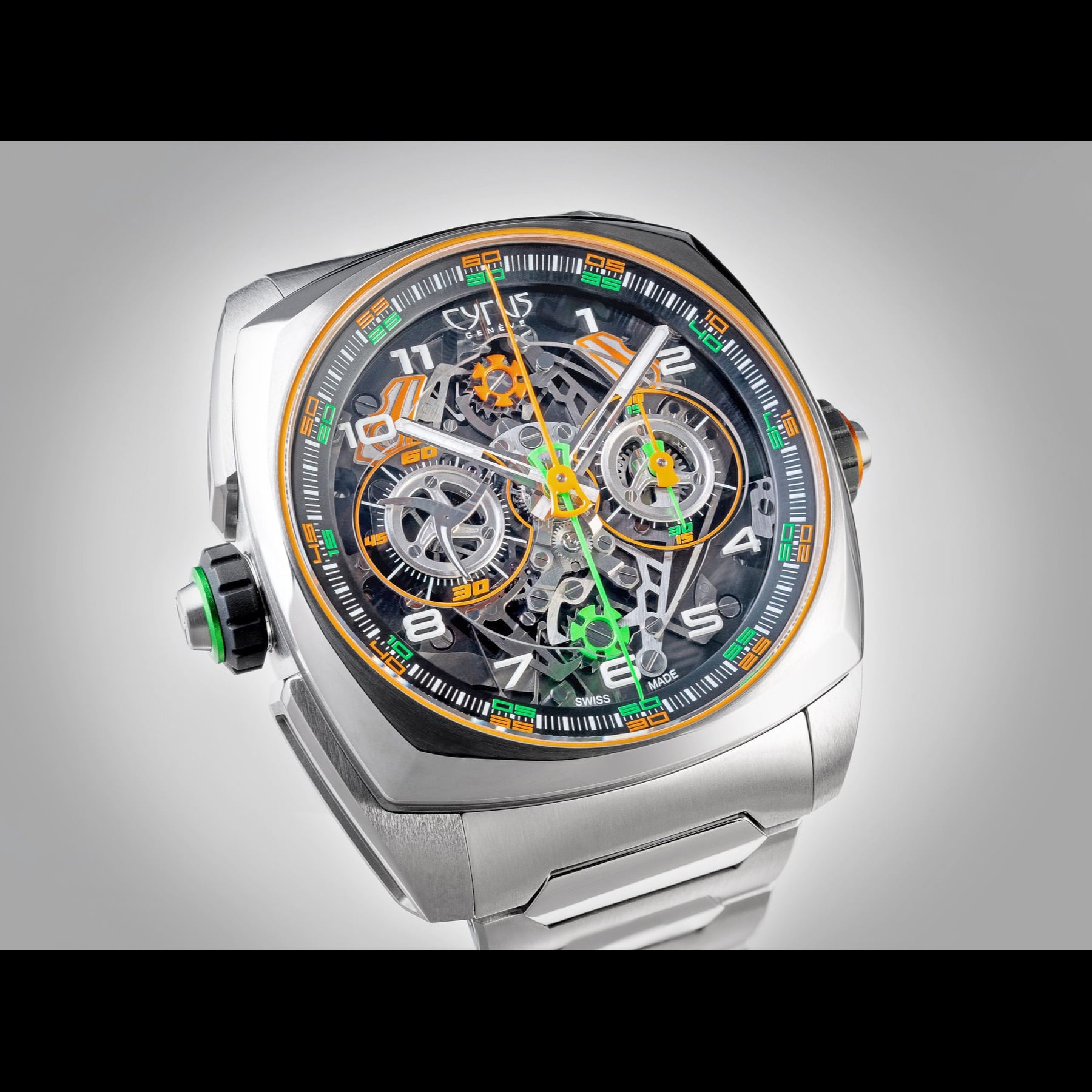 The timepiece is equipped with two independent monopusher chronographs for measuring two short time intervals independently or in synchrony, all housed in a single manufactured mechanical self-winding movement. Its star function, the 30-minute counter at 3 o'clock, features two mirrored orange and green hands. The same colour scheme is applied to the two central seconds hands, which track the seconds on the flange printed with two parallel scales in the same colours.