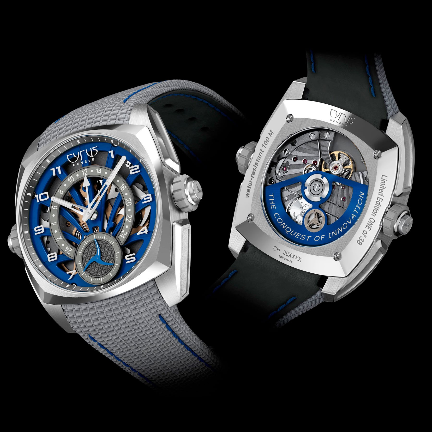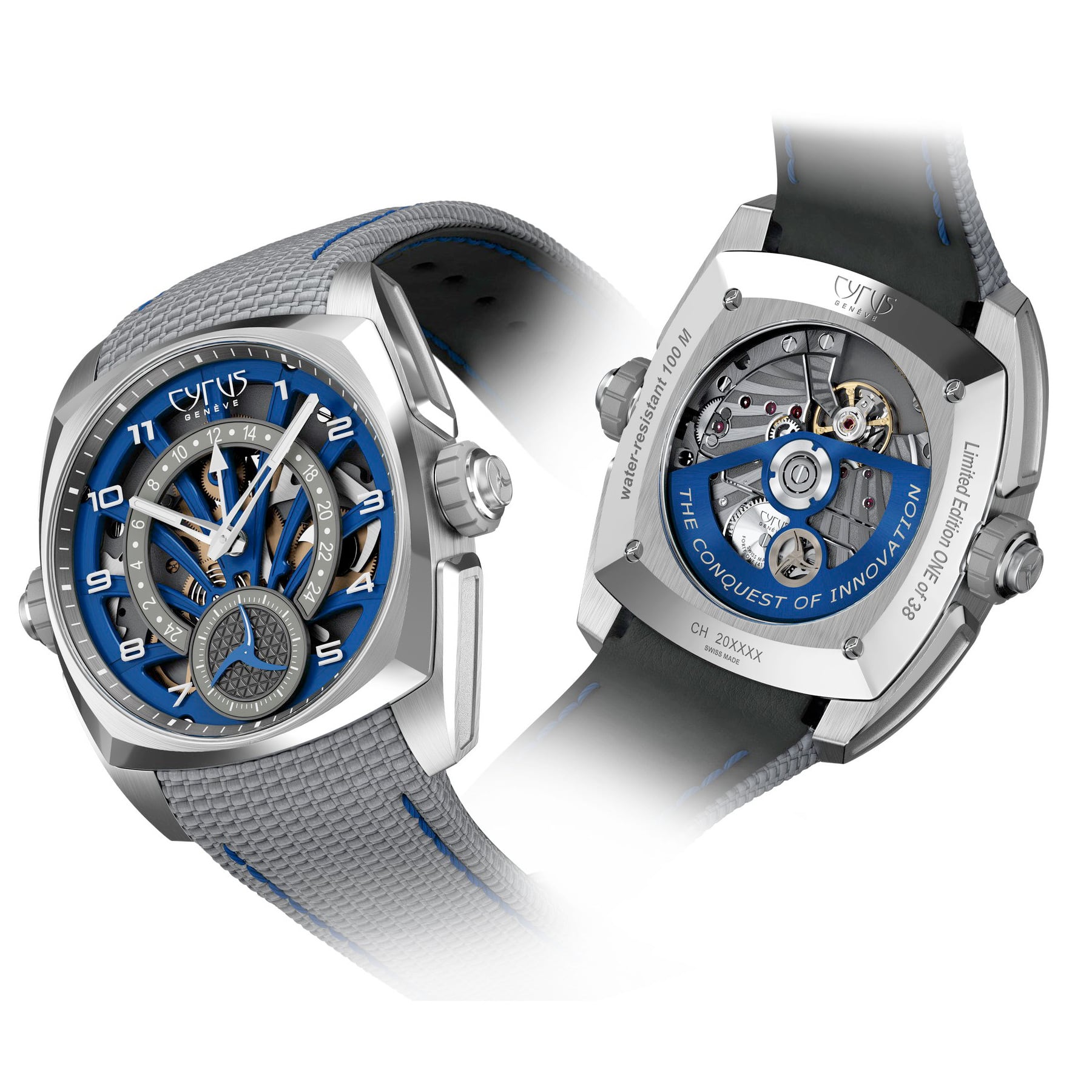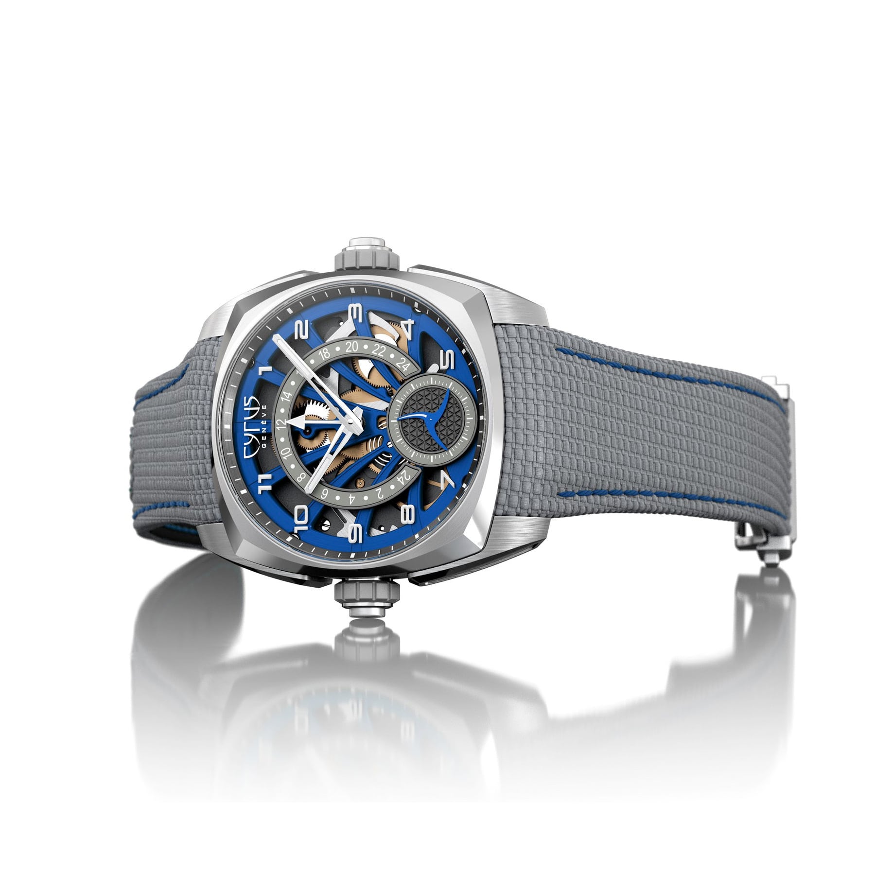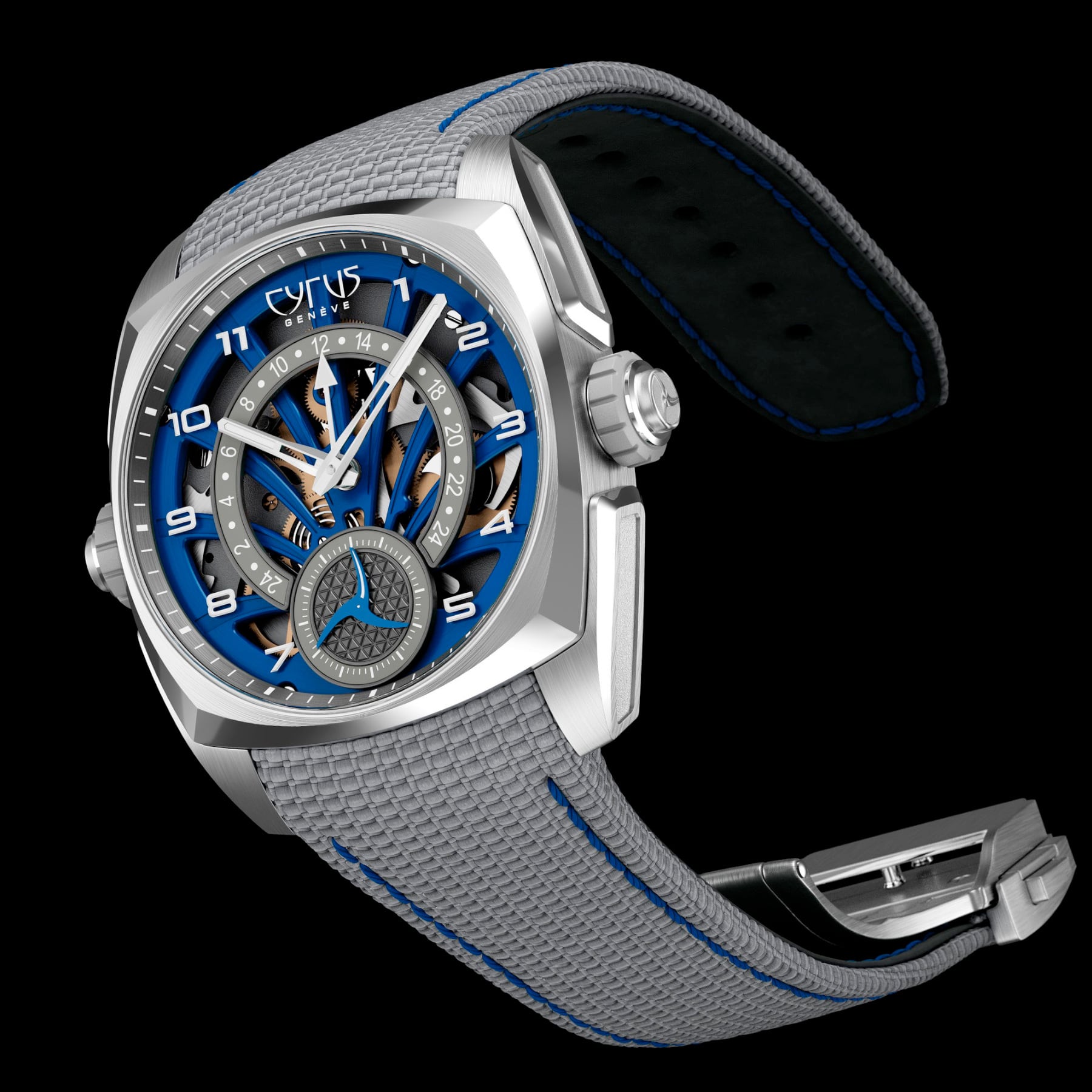 The Klepcys GMT Ocean Blue is equipped with the in-house automatic movement, calibre CYR708, first introduced in 2020 with the first edition of the Klepcys GMT Retrograde. Updated in its finishing, the movement boasts hand-bevelled bridges and an openworked, blue ALD-coated oscillating weight embellished with the Cyrus logo.