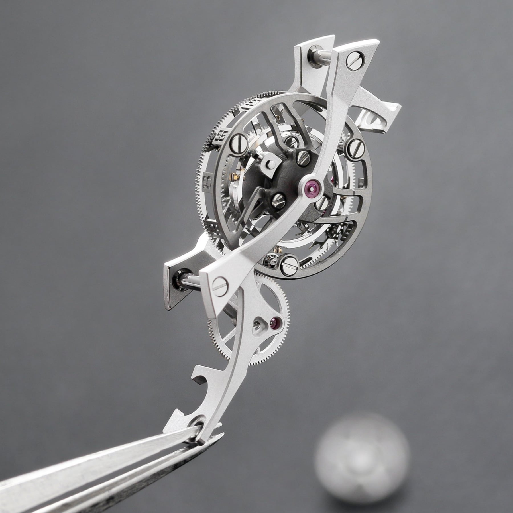 Studies by our team indicate that the 90° angle of the tourbillon better combats the effects of gravity on the movement over the course of normal daily wear. At this angle, the cage containing the entire regulating mechanism rotates on itself to offset the negative effects gravity has on the balance wheel more effectively. Ultimately, the vertical position has a great impact on the overall performance of the watch.