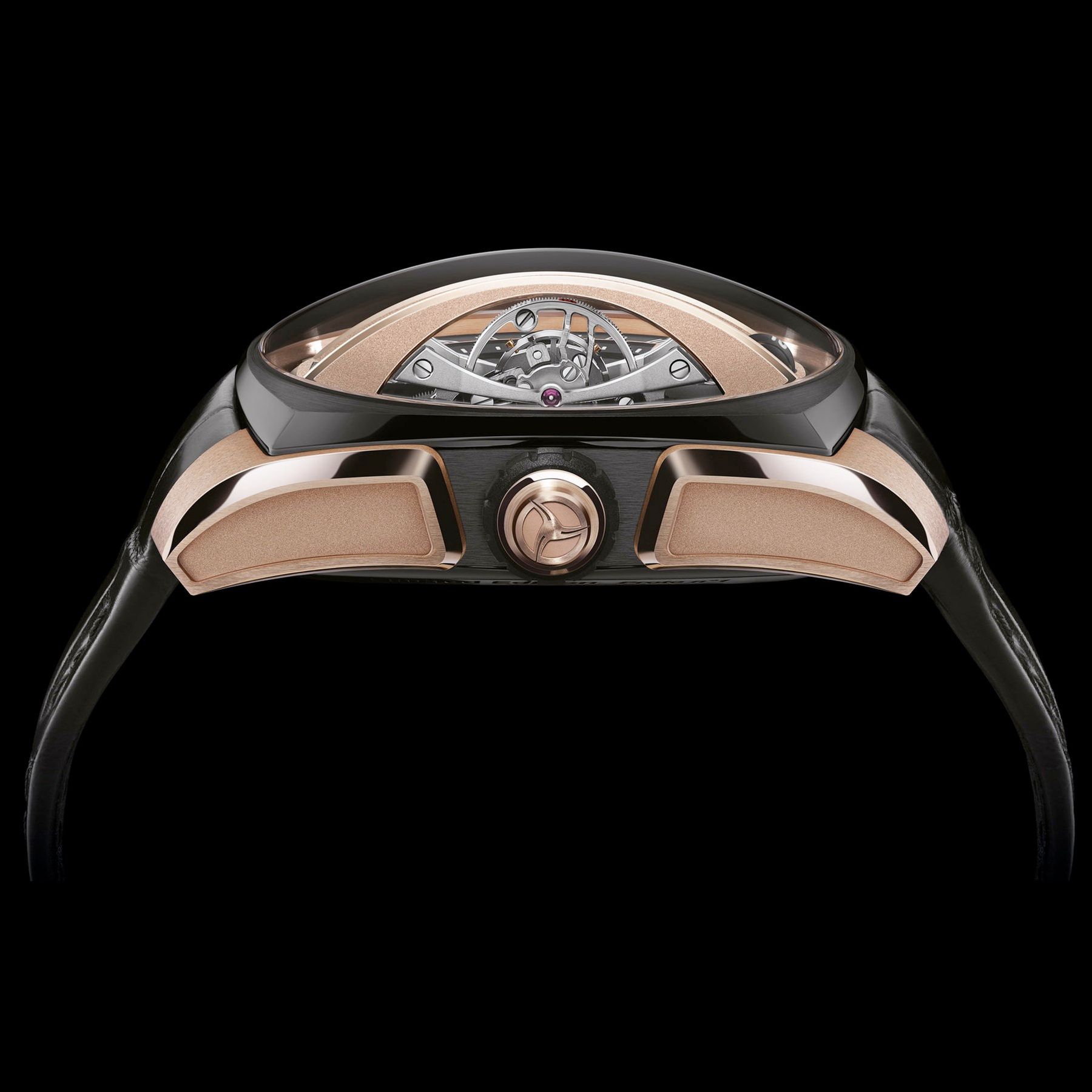 The 3-D architecture of the dial, also in a skeletonized version, is enhanced by the arch of the vertical bridge. Inspired by Leonardo Da Vinci’s design principles, the bridge blends harmoniously with the symmetrical lines of the timepiece and accentuates the central tourbillon. This provides easy access to admire the tourbillon as it completes a full rotation every minute.