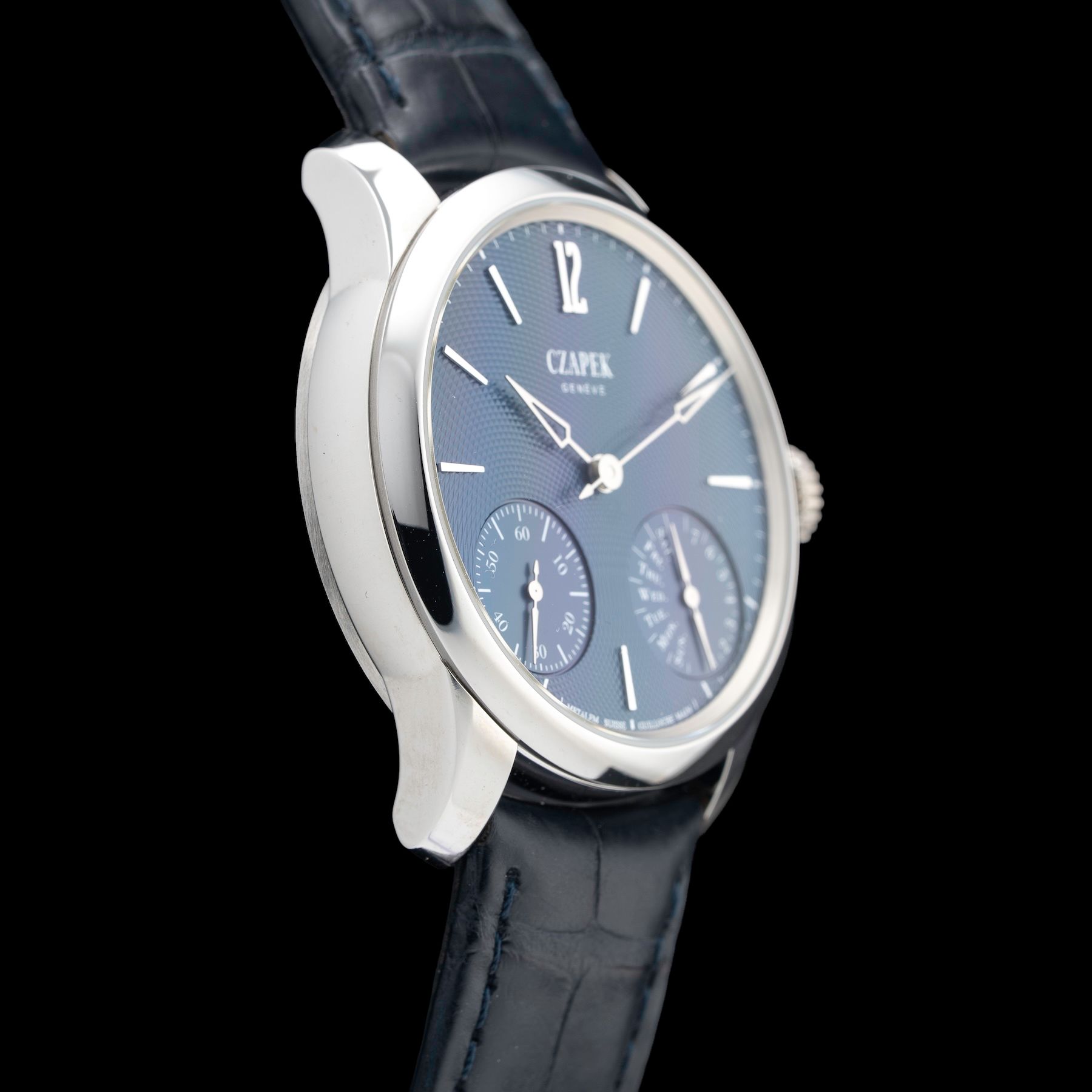 This Czapek 1031 Quai Des Bergues Sapphire Blue S 38.5mm is in GREAT condition. This watch includes its Original Box, Original Papers and warranty card. This watch has been fully authenticated and certified by Exquisite Timepieces. Please note, the photos shown are of the actual watch you will receive.