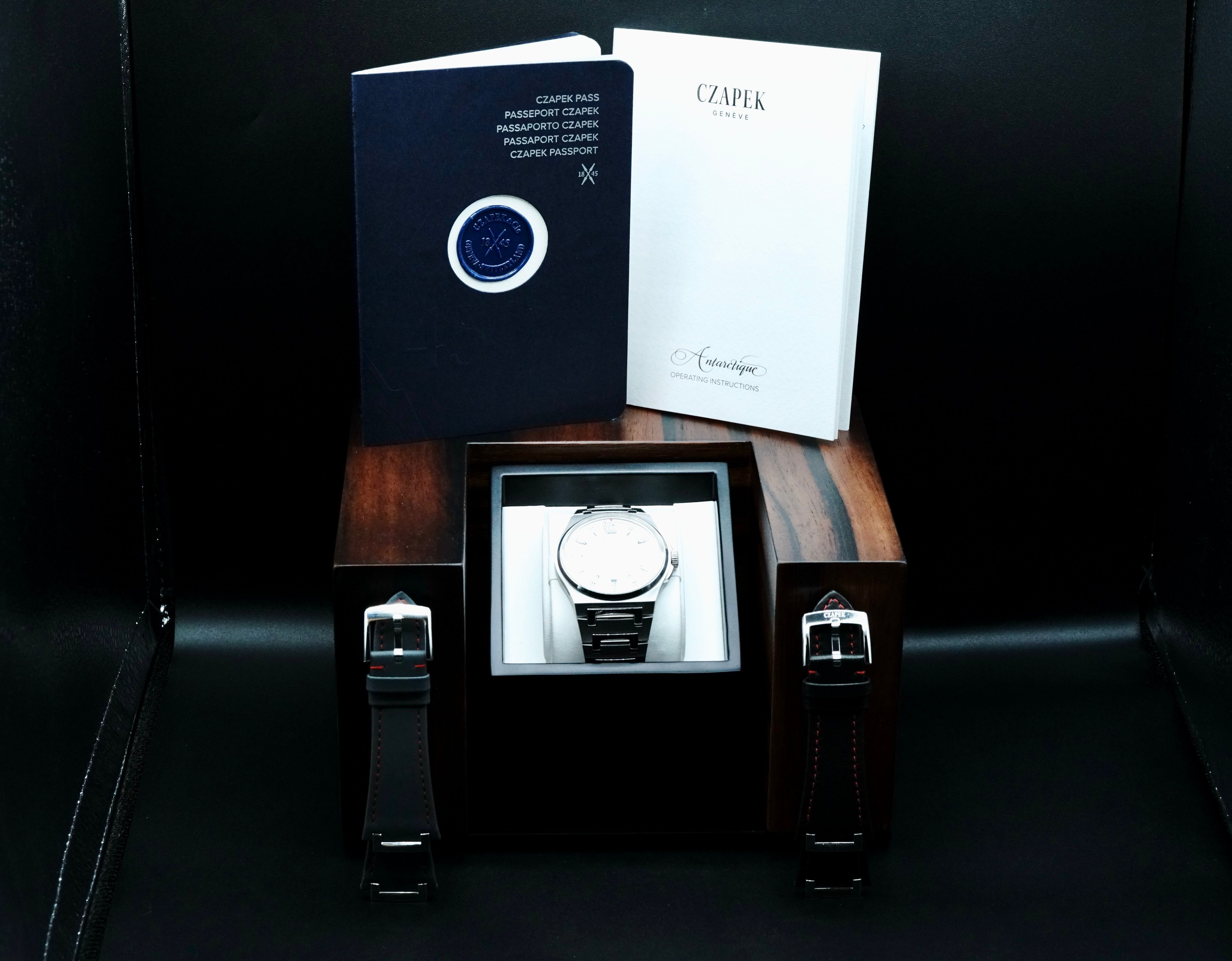 This Czapek Antarctique Passage de Drake Ice White 1510-RT-12 is in EXCELLENT condition. This watch includes its original box, original papers, and warranty dated for 11/21/2023. Extra black leather strap and grey leather strap. This watch has been fully authenticated and certified by Exquisite Timepieces.