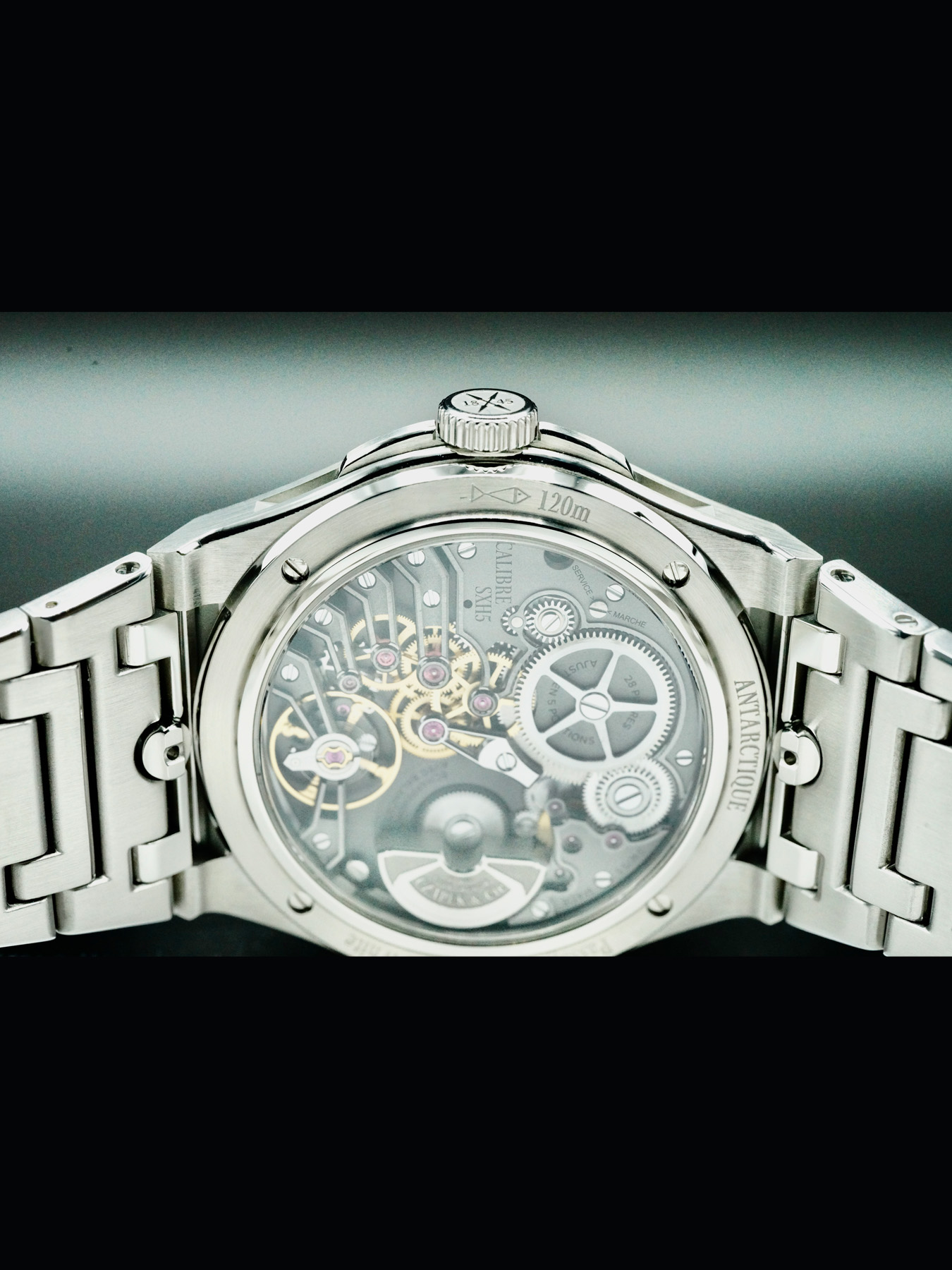 This Czapek Antarctique Passage de Drake Ice White features a 40.5mm stainless steel case with a transparent case back on a stainless steel bracelet. This watch also sports an ice white dial with luminous hands and index dial markers covered by scratch resistant sapphire crystal.