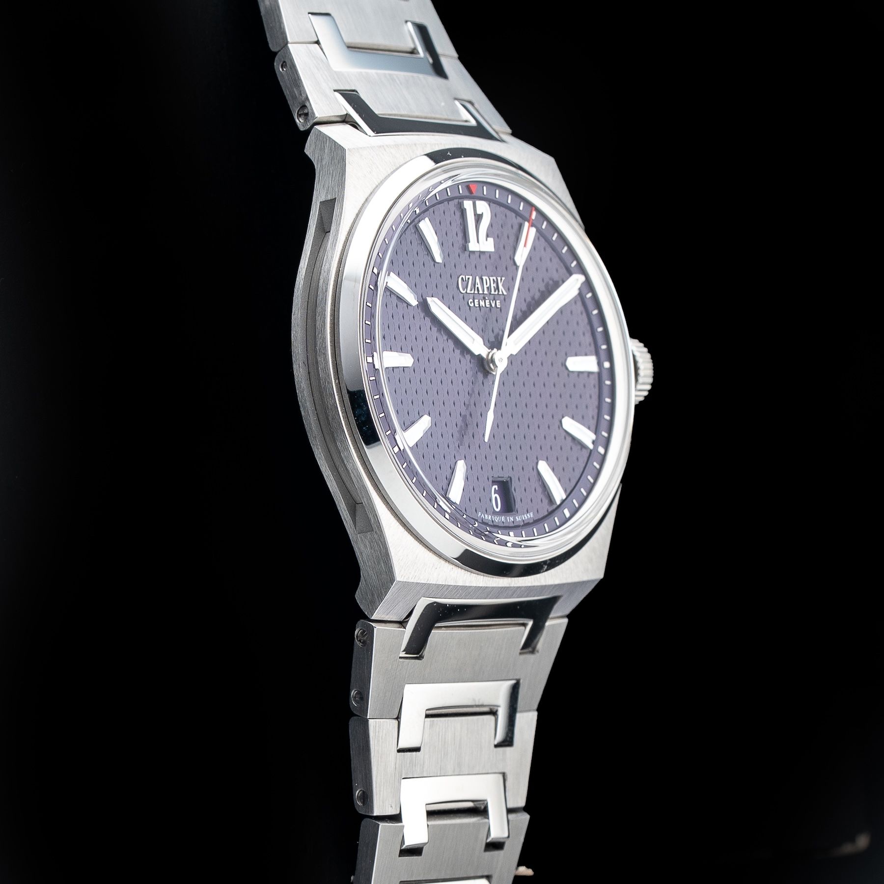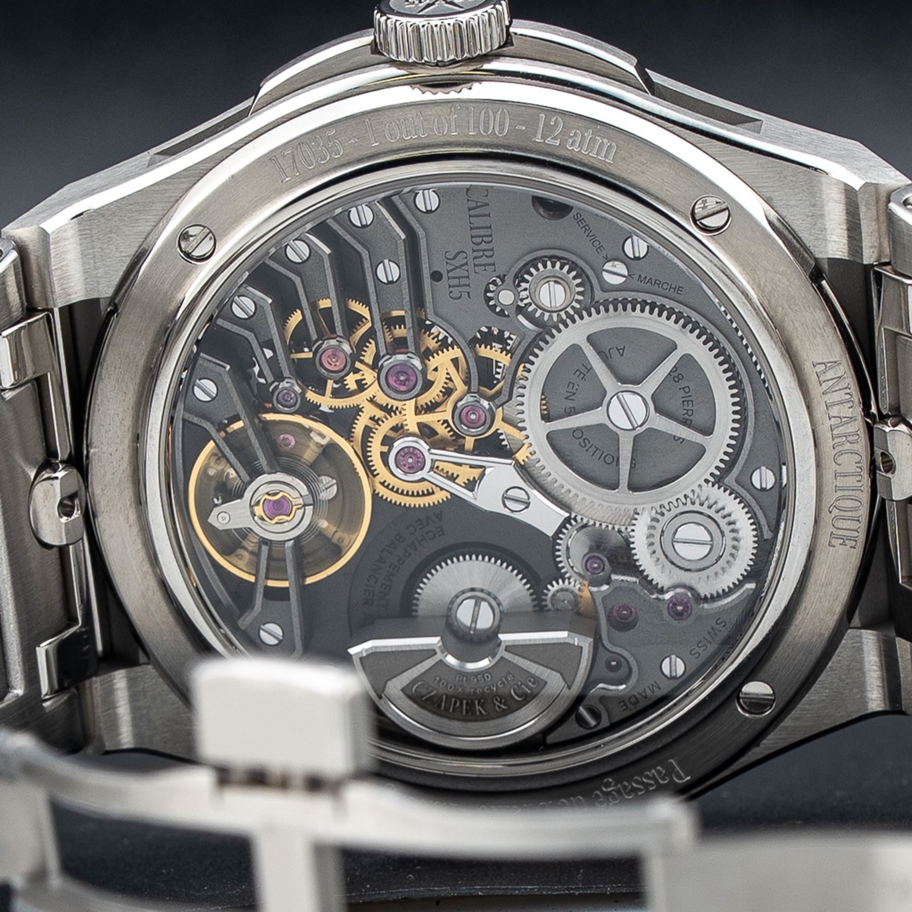 In fine watchmaking, every little detail counts. Besides the exceptional SHX5 movement and the sleek and sharp design of the case or the dial, a great deal of attention was put on the bracelet. The feeling when placed on the wrist, the comfort in every situation and lightness are as important as the timepiece visual and technical qualities. The capability to be forgotten by its wearer and to suddenly reveal its stunning beauty create an intensely pleasurable dichotomy. This is why the Antarctique collection is equipped by an ergonomic brushed integrated bracelet, whose links mesh to form a highly polished "C" for Czapek.