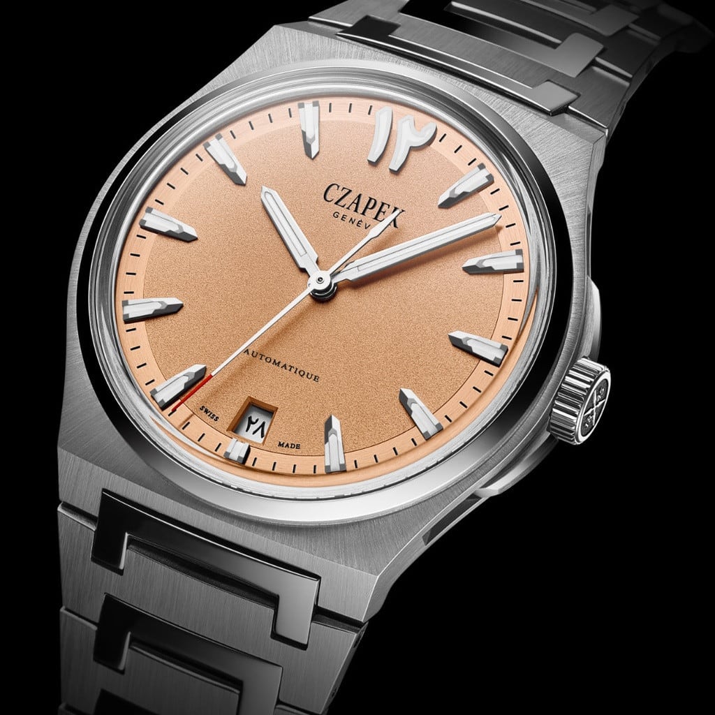 The Czapek Antarctique Desert Rose is a refined expression of haute horlogerie, crafted in a 40.5mm stainless steel case with an integrated bracelet. Echoing the warm glow of desert minerals, its sand colored dial is finely microblasted to evoke the soft texture of the desert sands. A rare edition of 25 pieces showcases a unique 12 o’clock index rendered in exclusive eastern Arabic calligraphy by master artist Wissam Shawkat, each accompanied by a signed certificate. A second edition of 100 pieces features a bold numeric “12,” emphasizing purity and balance. Czapek’s signature symmetry subtly elevates the design, while the date window at 6 o’clock reflects the Maison’s dedication to meticulous harmonious design. This is desert-inspired elegance brought to its highest form.