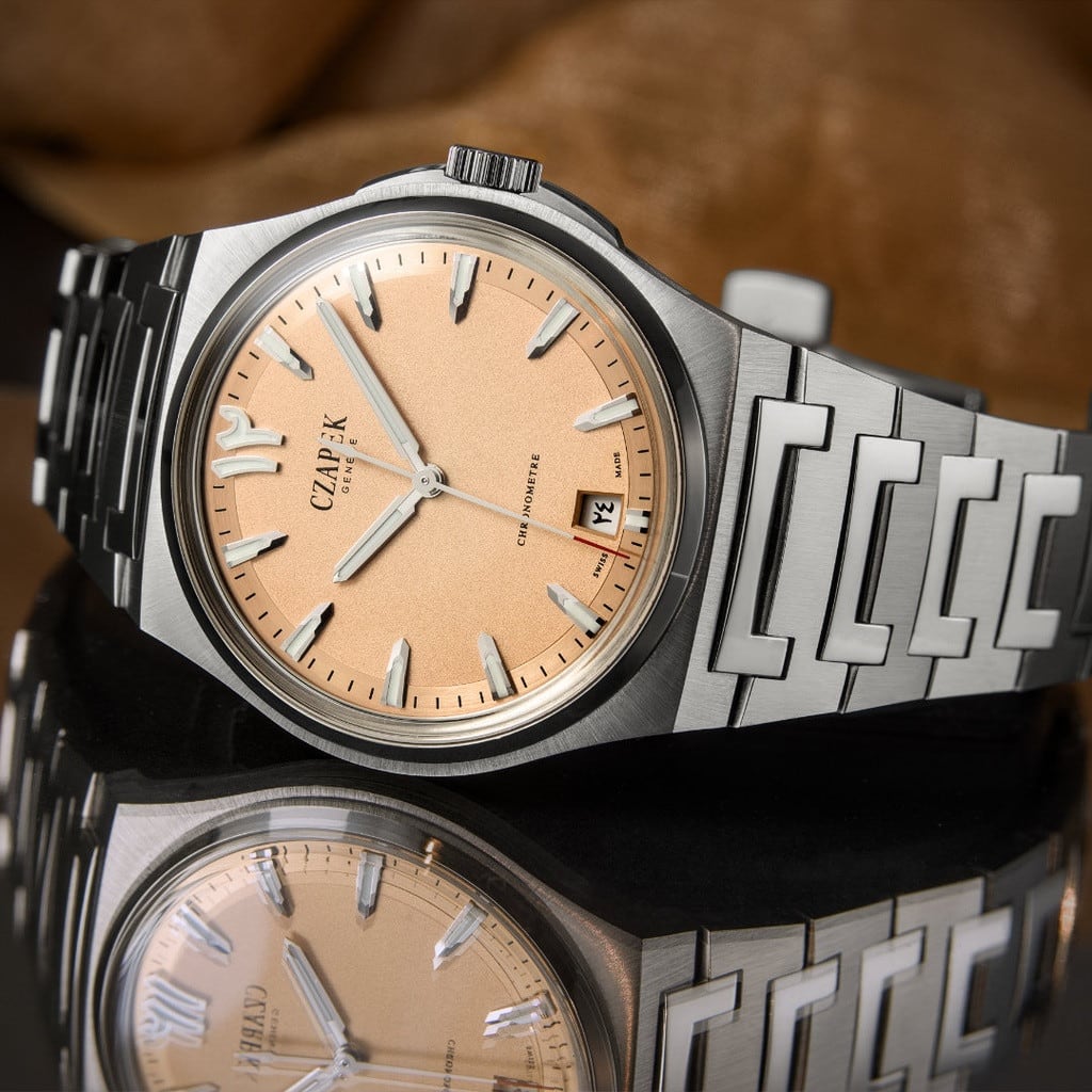 Every detail of the Antarctique Desert Rose has been thoughtfully crafted to elevate it beyond simple timekeeping, offering a refined and contemporary expression of Czapek’s watchmaking philosophy. The sand-tone dial, microblasted for a soft matte mineral texture, forms the backdrop for sharp sword-shaped hands and raised indexes that enhance depth, clarity, and visual balance. The 6 o’clock date window maintains Czapek’s signature vertical symmetry, pairing elegance with everyday practicality. Its 40.5mm case preserves the Antarctique line’s double trompe-l’œil curvature, delivering comfort and subtle tension. The integrated stainless steel bracelet, equipped with a micro-adjustment system and Czapek’s EasyRelease mechanism, allows effortless transitions to leather or rubber straps.