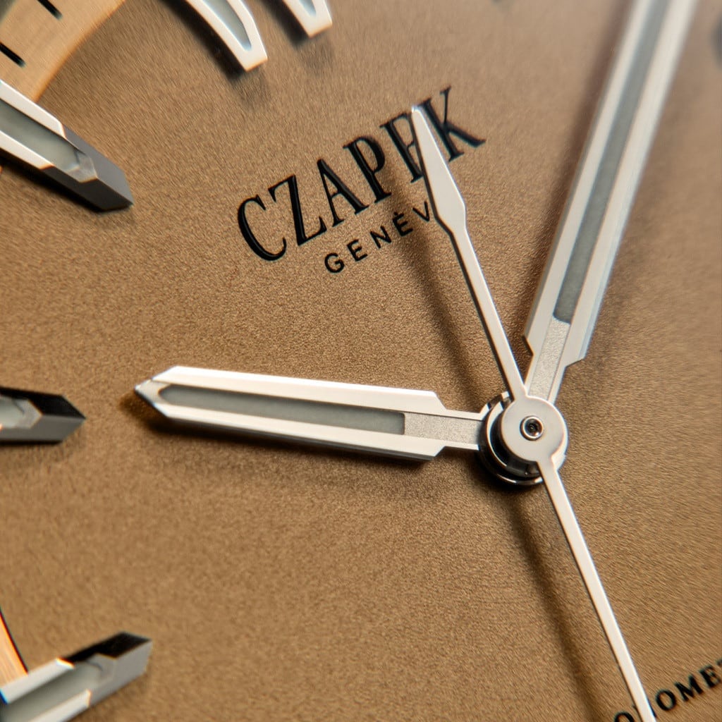 In luxury watchmaking, comfort and design go hand in hand. The Antarctique Passage de Drake Sahara Sands is equipped with a brushed integrated bracelet that meshes to form a highly polished "C" for Czapek. The bracelet’s ergonomic design ensures comfort and lightness, allowing the timepiece to be worn effortlessly. The micro-adjustment system, introduced in January 2022, allows the wearer to extend the bracelet by a few millimeters for the perfect fit. Additionally, the watch comes with an exclusive quick-change system for switching between straps, offering versatility with rubber or leather alternatives.