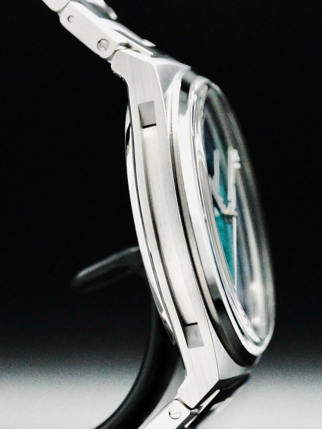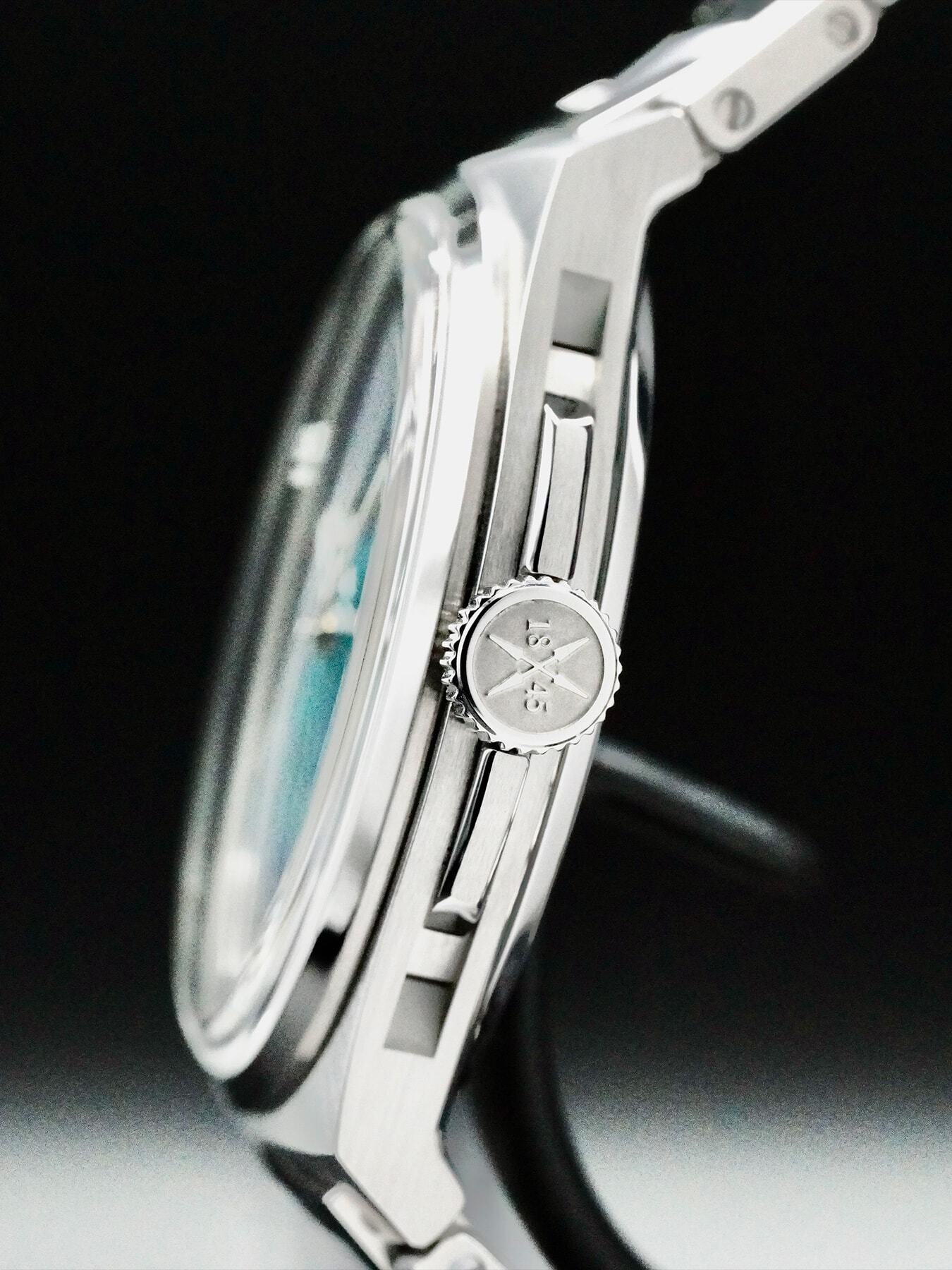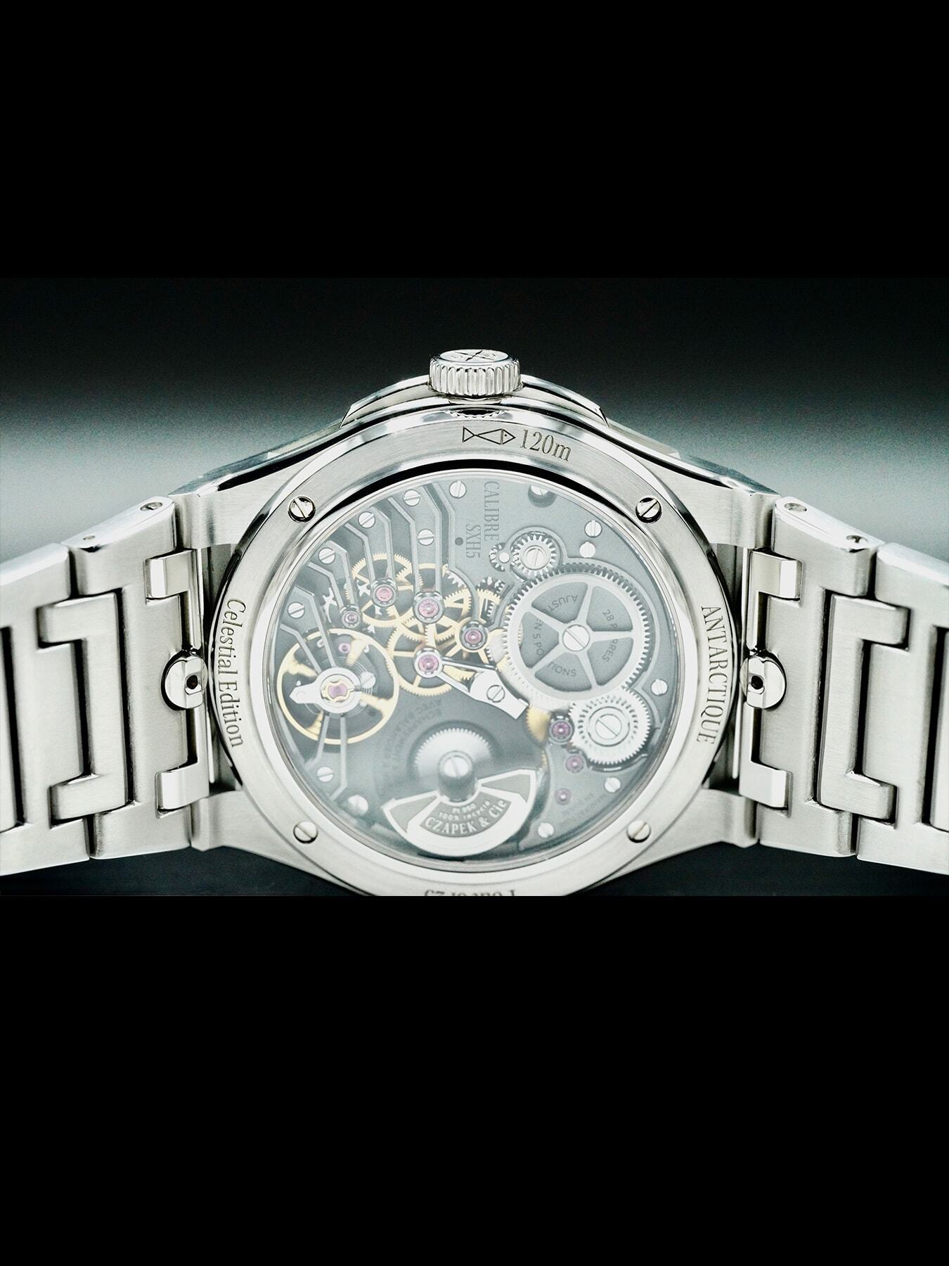 This Czapek Antarctique Celestial Edition features a 40.5mm stainless steel case with a display case back on a stainless steel bracelet. This watch also showcases a unique hand painted celestial dial with luminous hands covered by scratch resistant sapphire crystal.