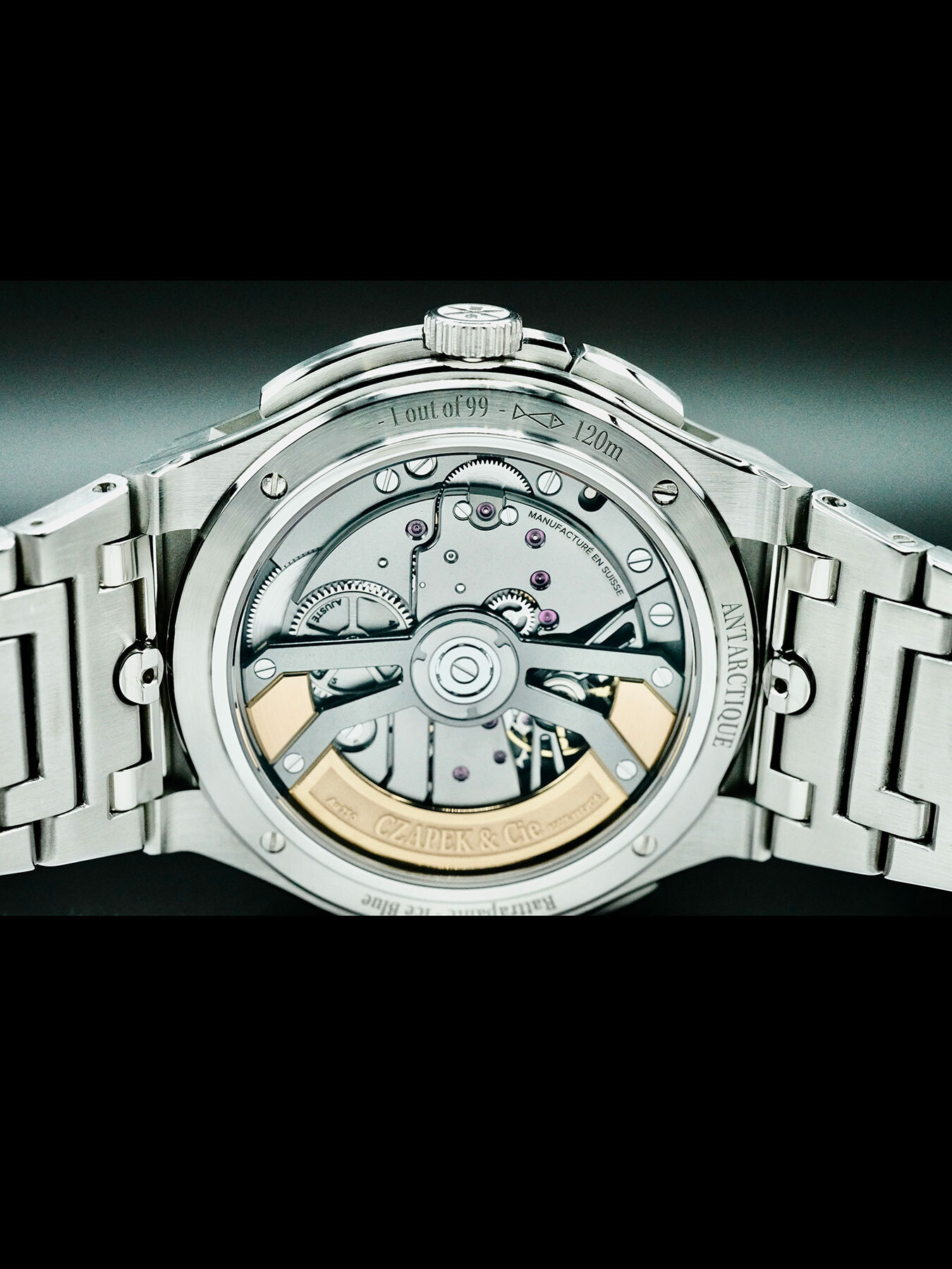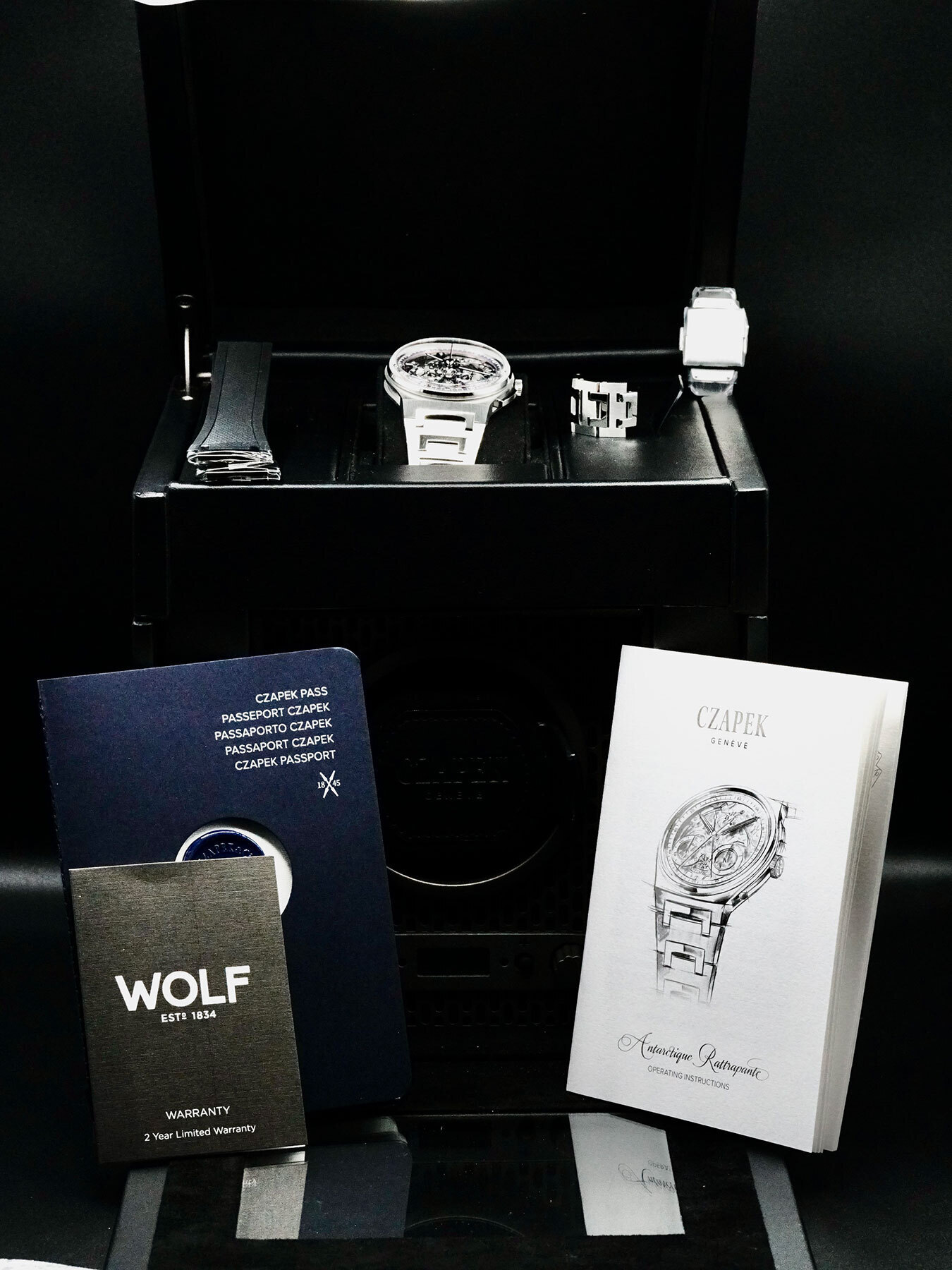 This Czapek Antarctique Rattrapante Ice Blue is in EXCELLENT condition. This watch includes original box, instruction booklet and warranty card dated 2023. Extra black rubber strap, stainless steel bracelet links, and stainless steel buckle. This watch has been fully authenticated and certified by Exquisite Timepieces.