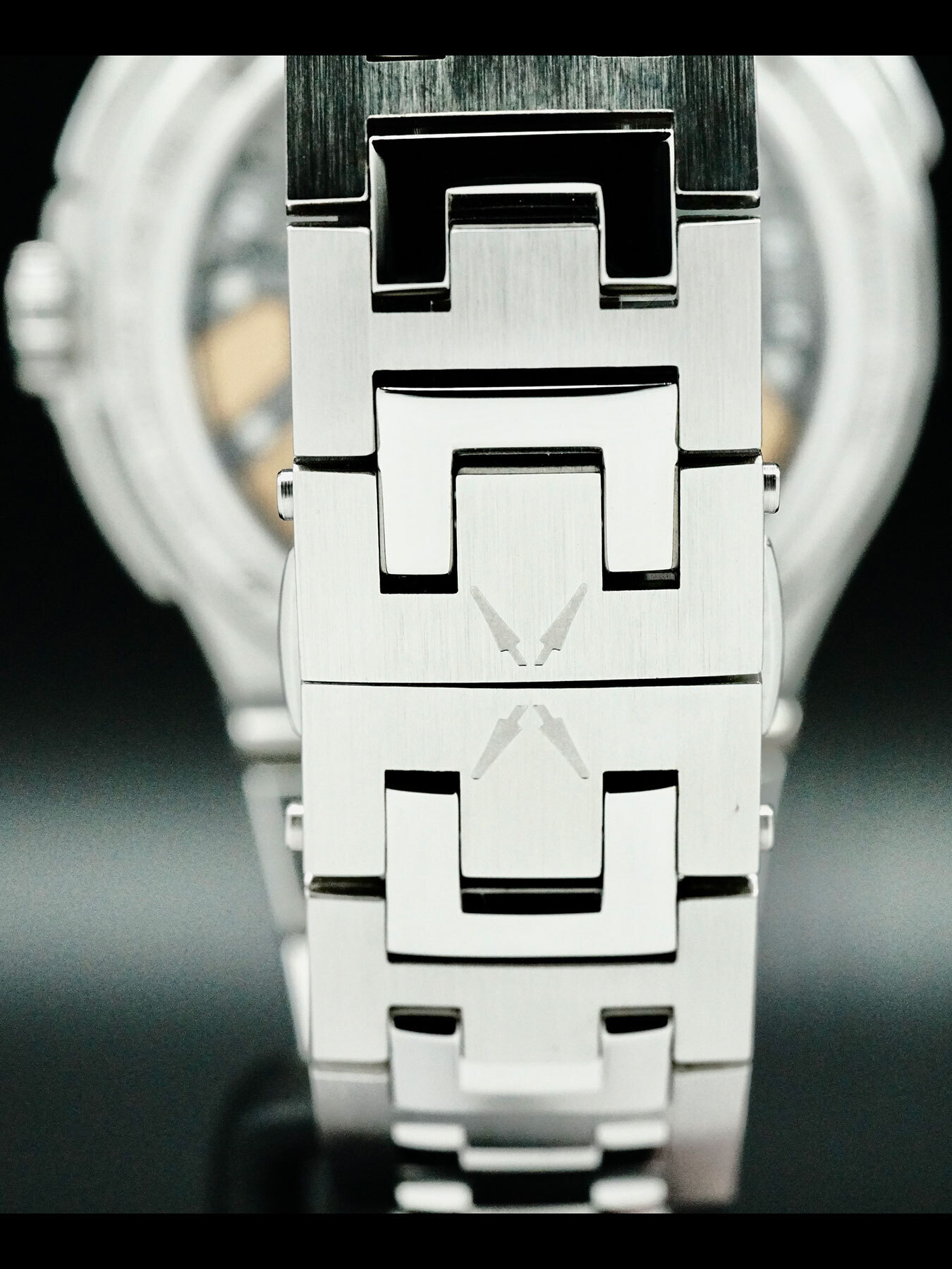 This watch features a 42.5mm steel case on bracelet. This watch also sports a skeleton dial. Powered by a Mechanical Automatic Movement. Water resistance up to 120 meters.