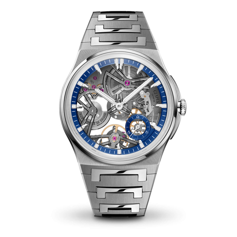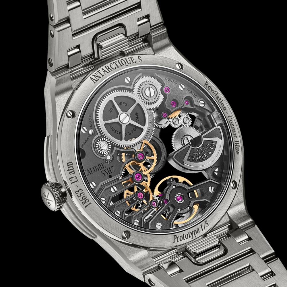 The Antarctique Révélation Titanium Cosmic Blue is a watch born from a collector’s desire: turn the movement upside down and reveal what is usually hidden. Calibre SXH7, a complete re-engineering of the in-house SXH5, presents its escapement and stop-seconds mechanism on the dial side, offering a mesmerising glimpse of their activation during time-setting. Full skeletonisation of the main plate creates a trompe l'oeil of multiple bridges echoing SXH5's architecture. The rich Cosmic Blue peripheral dial — in Czapek's proprietary hue developed after an exhaustive exploration of sapphire tones — provides a powerful visual anchor for the indications, ensuring legibility is never compromised despite the watch's radical transparency. Available in the 40.5mm or 38.5mm Antarctique case, limited to respectively 50 and 25 pieces per year.