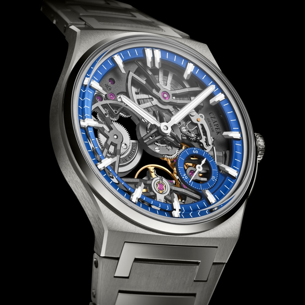 Titanium and Cosmic Blue share a natural affinity that Czapek & Cie discovered while exploring the ideal companion hue for this exceptional metal. Cosmic Blue — a proprietary shade selected for its depth and intensity after a long creative process — amplifies titanium's distinctive silvery-grey character, creating the impression of infinite depth at the heart of the Révélation's open dial. The Antarctique case translates every established design code into titanium: the box-shaped sapphire crystal, the narrow rounded bezel, and the integrated bracelet with its signature C-shaped central links. Notoriously difficult to machine despite its light weight, titanium is also fully bio-compatible, paramagnetic, and corrosion-resistant — qualities that align naturally with the Antarctique's sporting spirit.