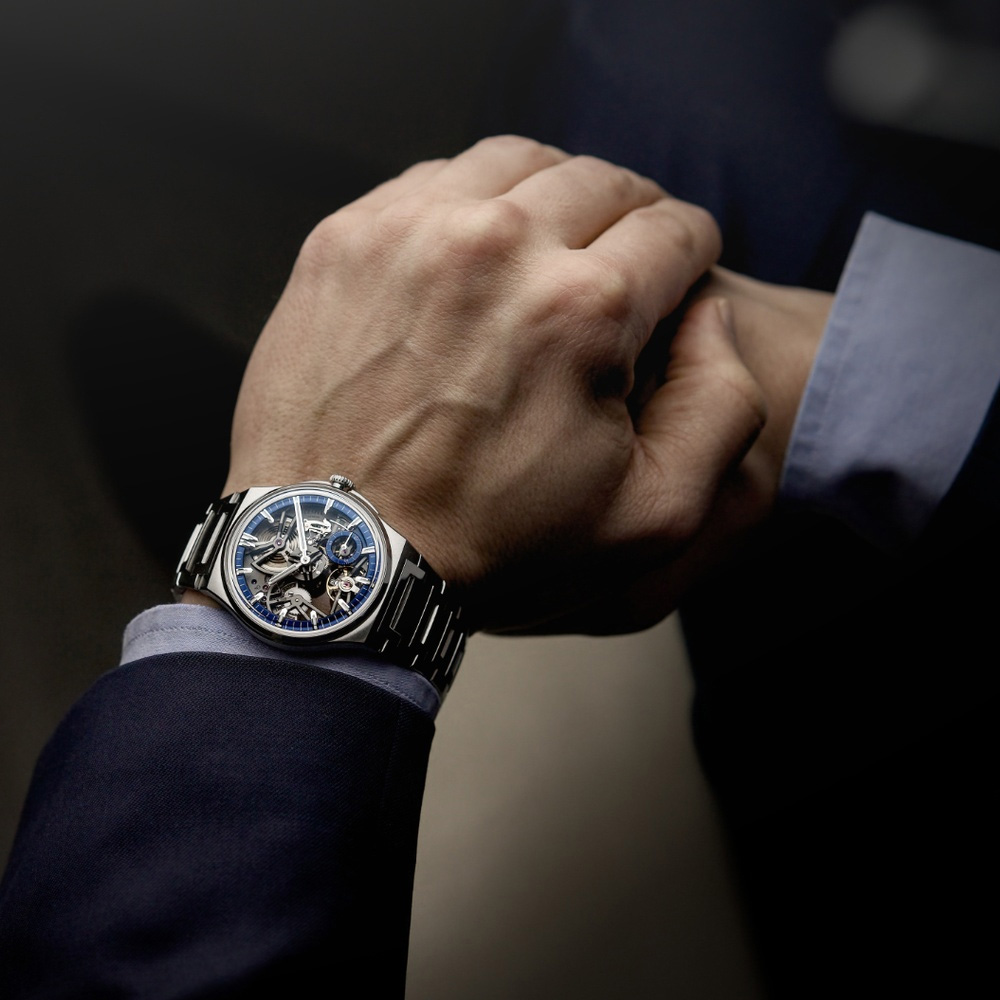 Few watches invite the eye as insistently as the Antarctique Révélation. At its heart beats Calibre SXH7, a movement conceived in direct response to a collector's desire to expose every layer of its mechanics. The entire calibre was re-engineered so that the escapement faces the dial side, while the stop-seconds mechanism becomes visible the moment the crown is pulled to set the time. Because the seconds hand could no longer be centred, a small seconds display was placed at 4:30 on a Cosmic Blue sub-dial, ensuring the indications remain perfectly legible. The oscillating mass, now visible from both sides, was fully engraved and decorated. Titanium's silvery tone and the depth of the Cosmic Blue hue together create a striking interplay of material and colour that elevates every component.