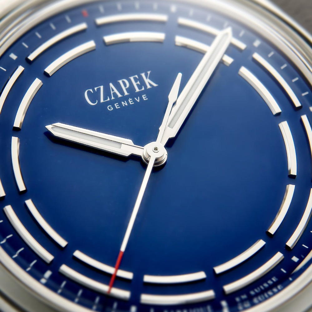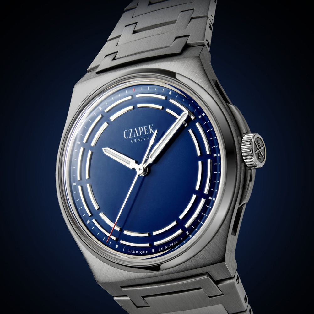 The Antarctique Dark Sector Cosmic Blue reimagines the traditional sector dial through a contemporary lens. Two concentric, slightly domed circles structure the display, punctuated by twelve voids that mark the passing hours. As the hands sweep across the dial, these openings create subtle visual shifts, animating the reading of time. The Cosmic Blue tone—developed exclusively by Czapek—adds depth and intensity, further enhanced by a soft velouté texture. Encased in lightweight titanium, the watch balances visual presence with exceptional comfort.