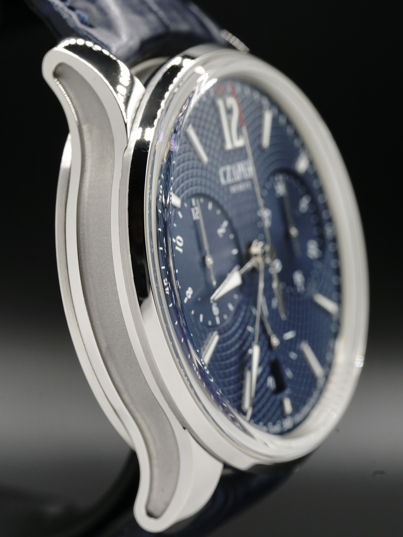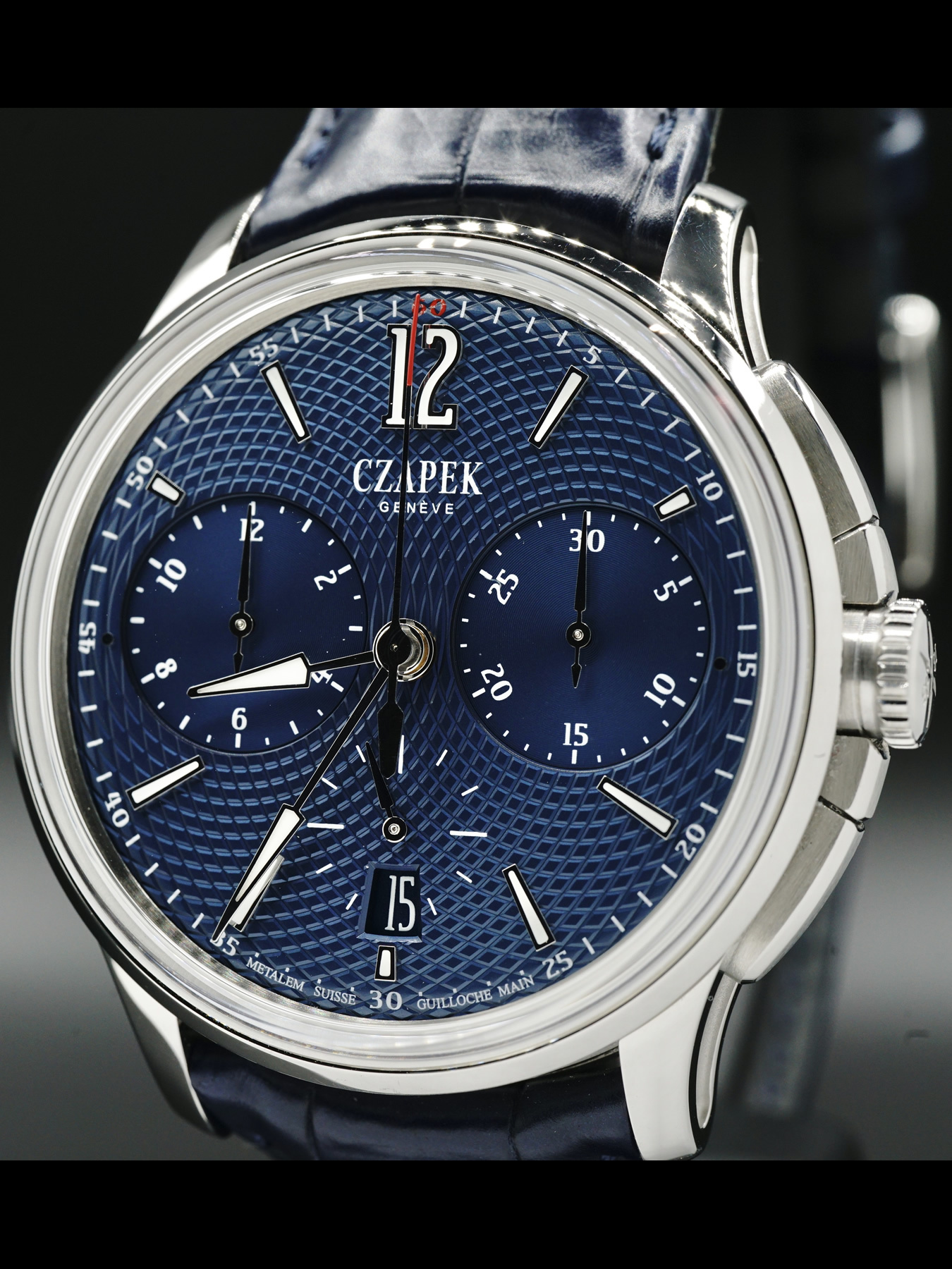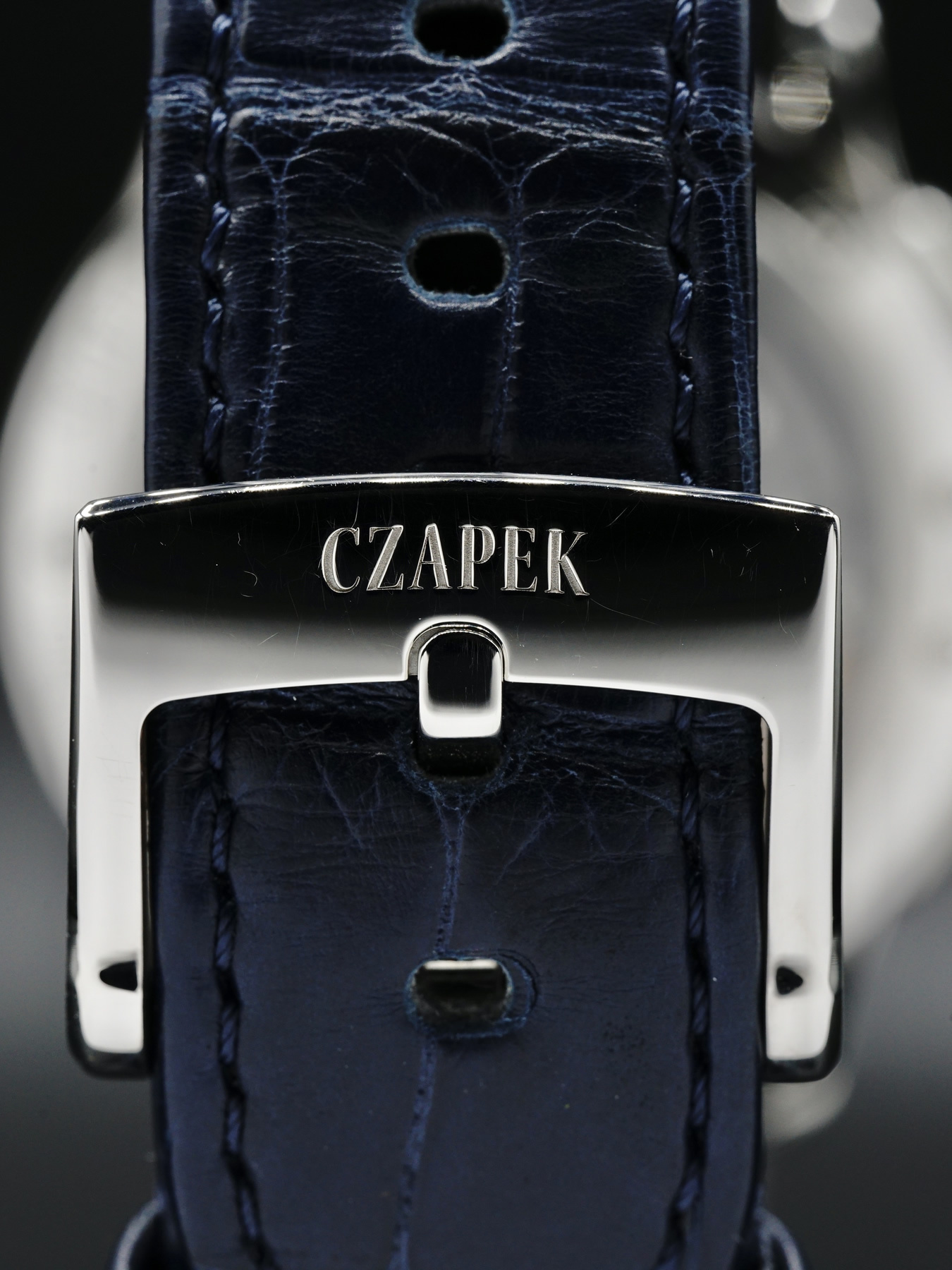 This Czapek Faubourg de Cracovie L'Heure Bleue features a 41.5mm stainless steel case on a blue alligator leather strap. This watch also showcases a handcrafted Guilloche "Resonance" bombe dial in AuPtPdAg that is covered by anti-reflective sapphire crystal.