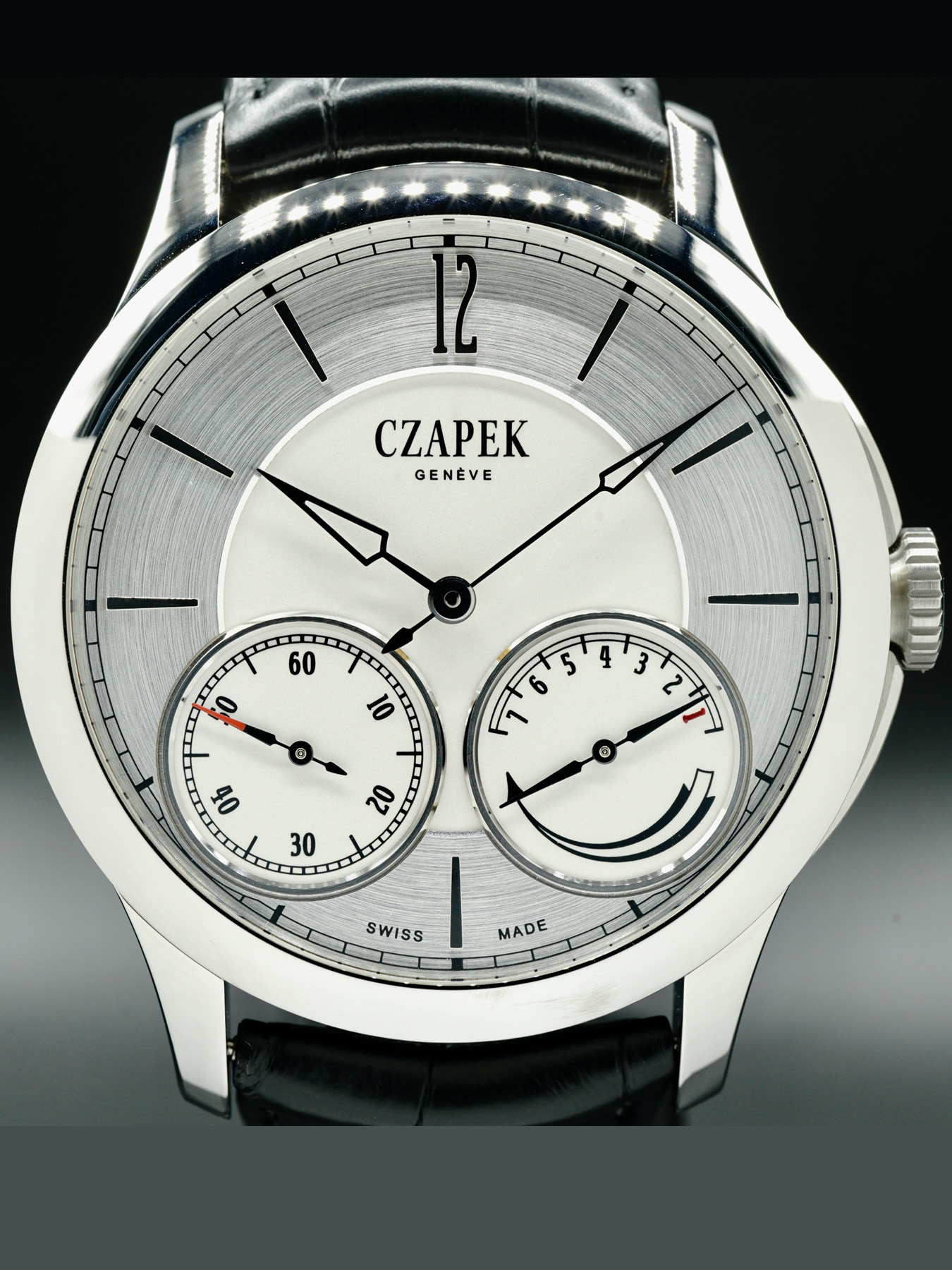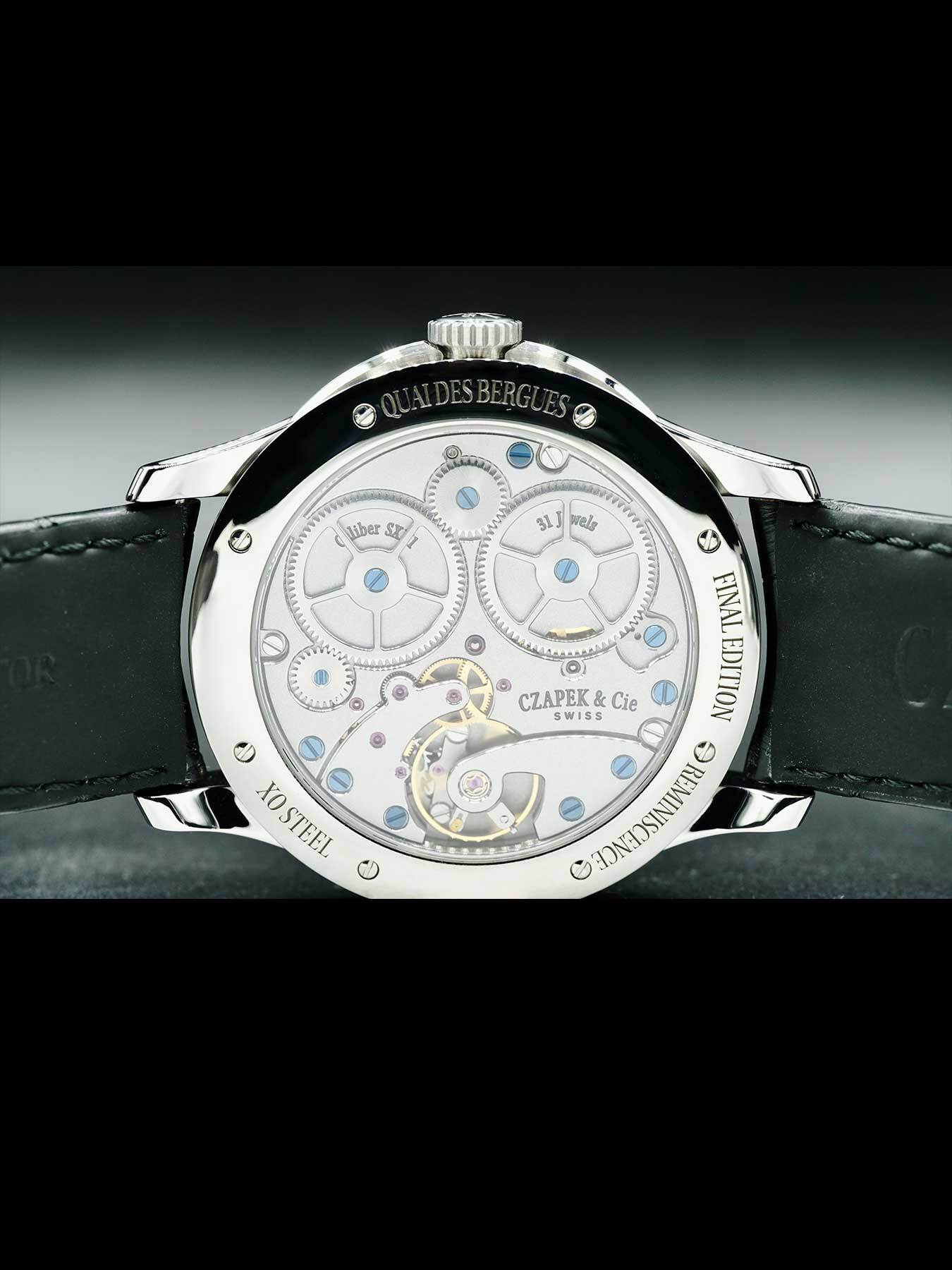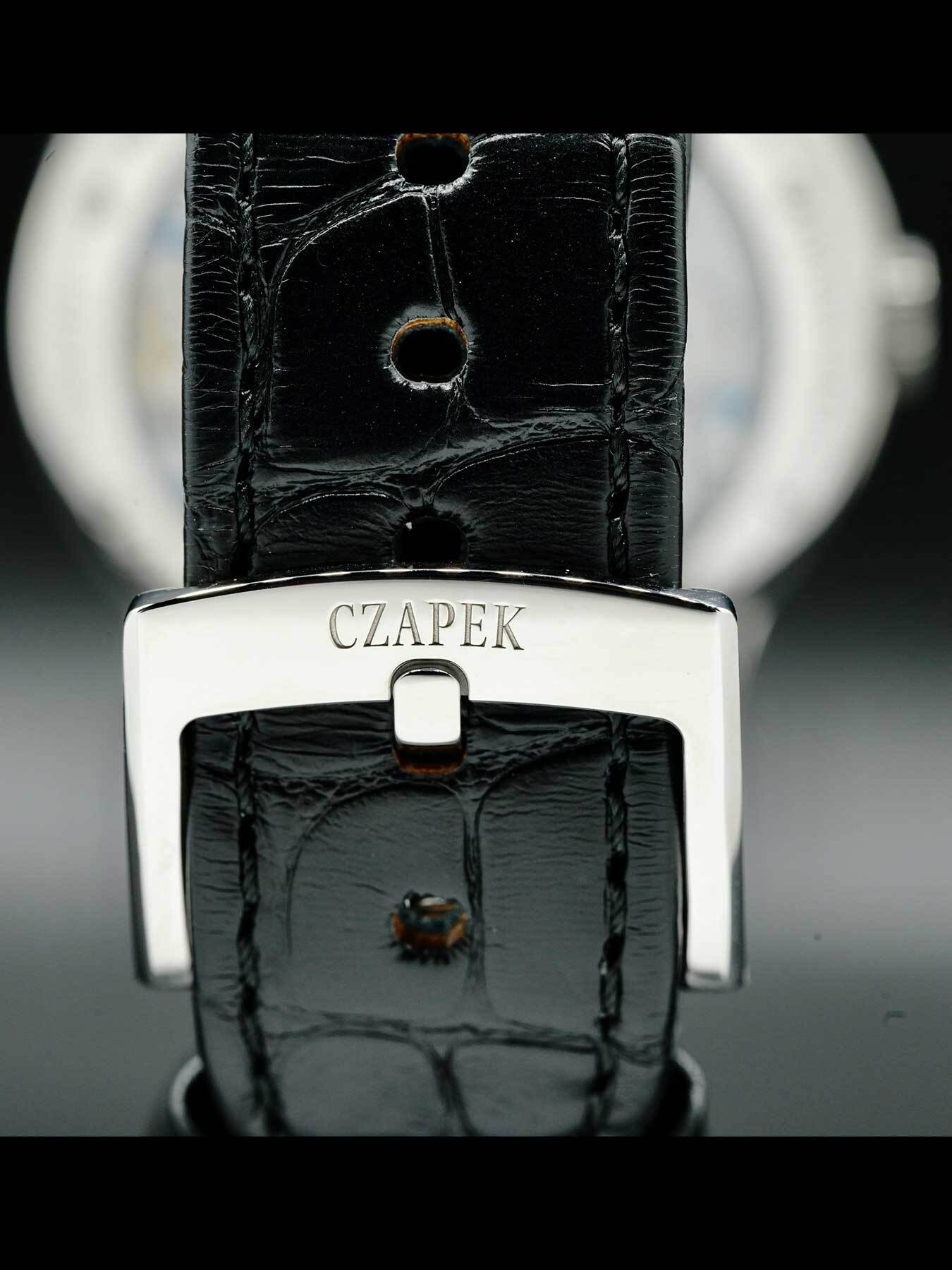 Mechanical Manual movement powered by Czapek Caliber SXH1 with a power reserve of approximately 7 days. Water resistance up to 30 meters.
