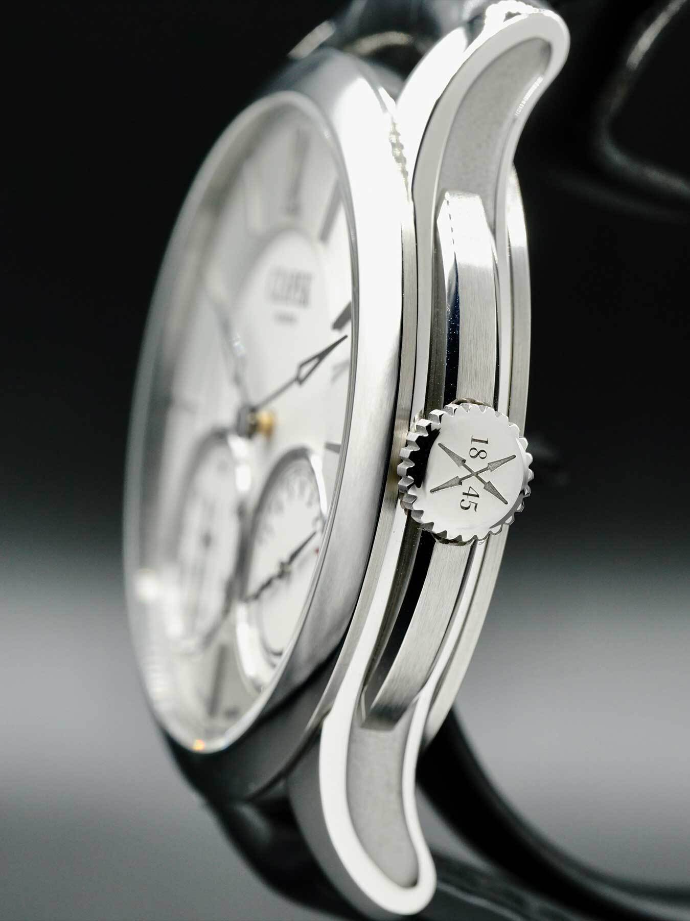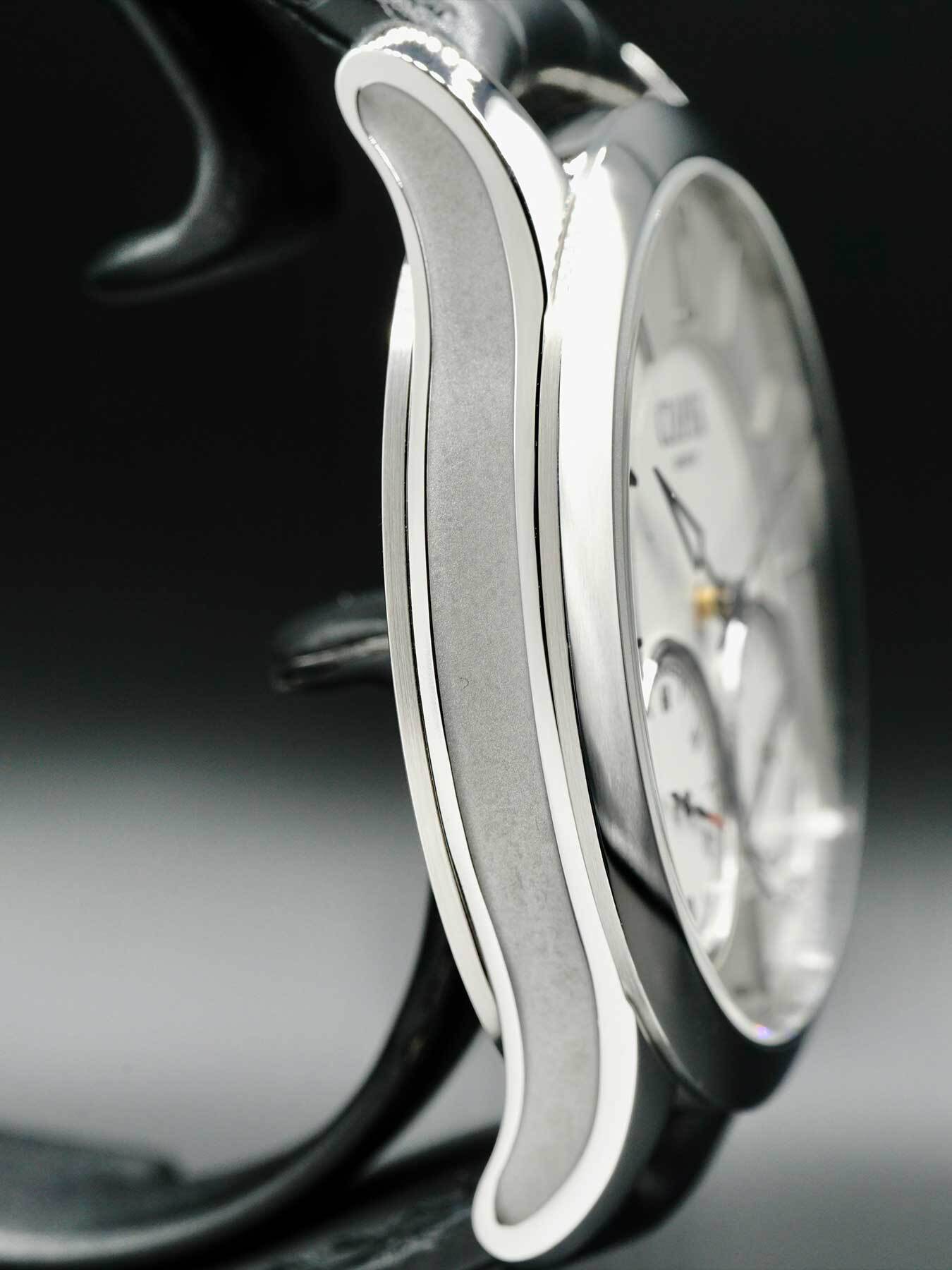 This Czapek Quai Des Bergues features a 42.5mm stainless steel case with an exhibition case back on a black leather strap. This watch also sports a silver dial with openworked hands and index dial markers covered by scratch resistant sapphire crystal.