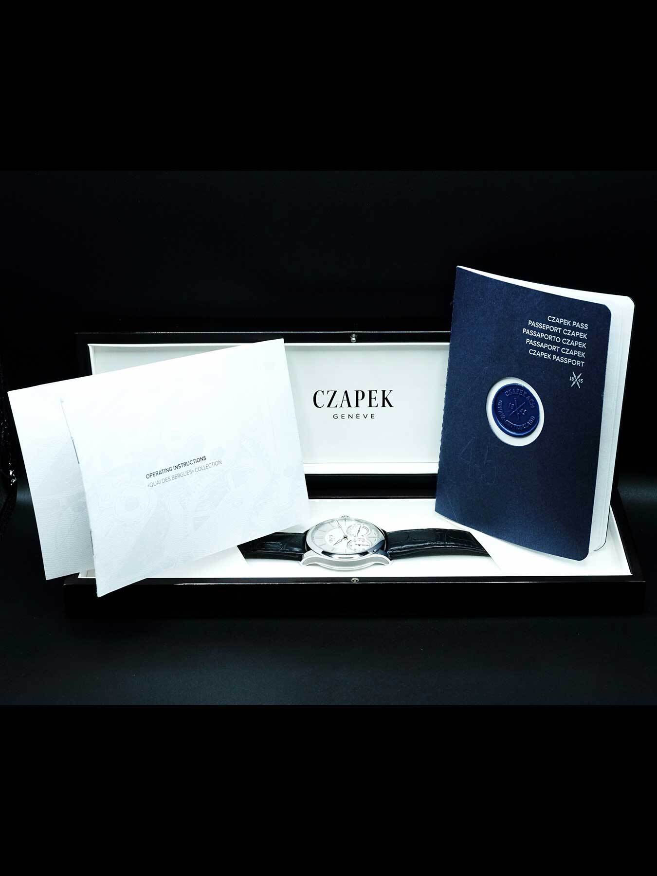 This Czapek Quai Des Bergues N23 is in EXCELLENT condition. This watch includes its original box, instruction manual, certificate of authenticity, and warranty not dated. This watch has been fully authenticated and certified by Exquisite Timepieces.