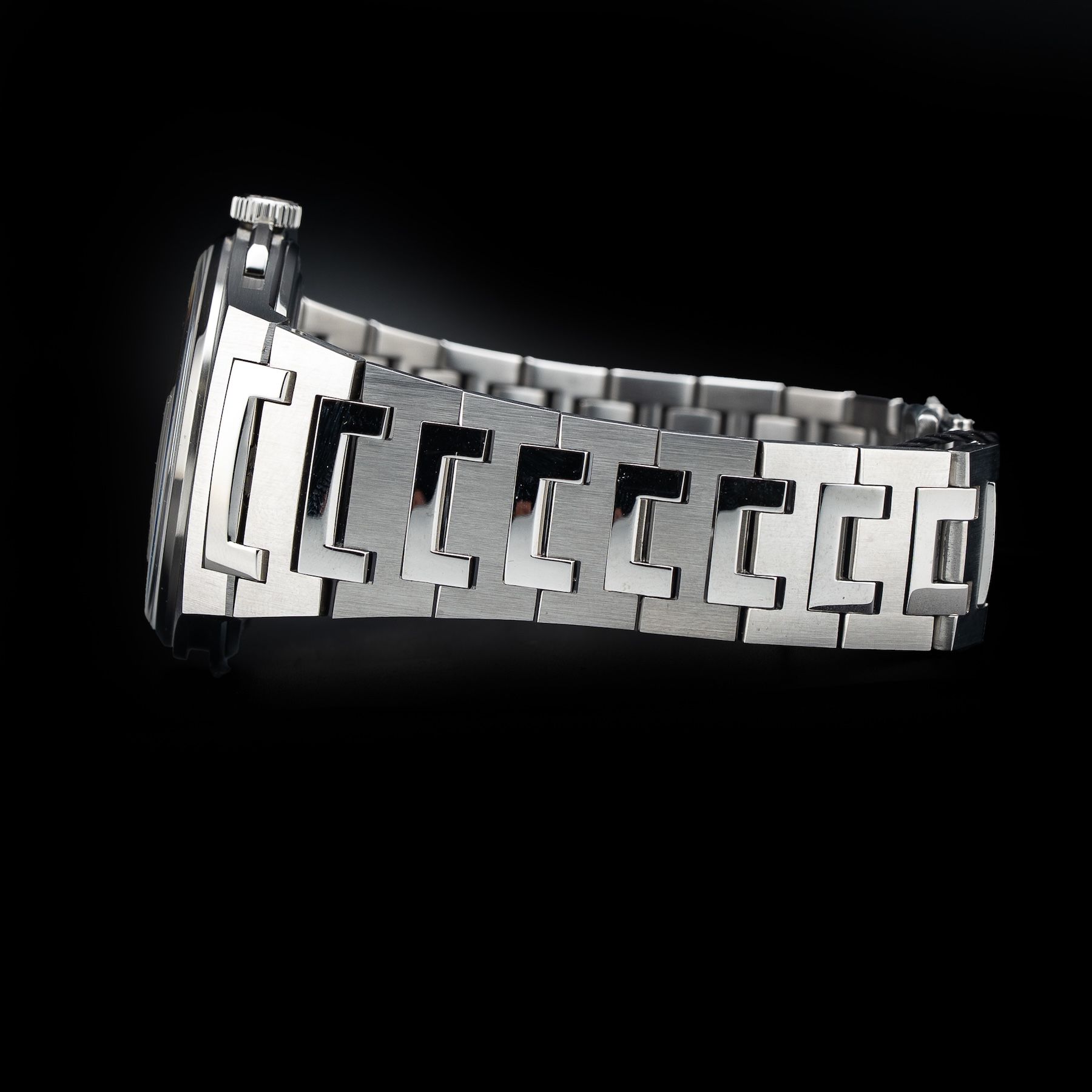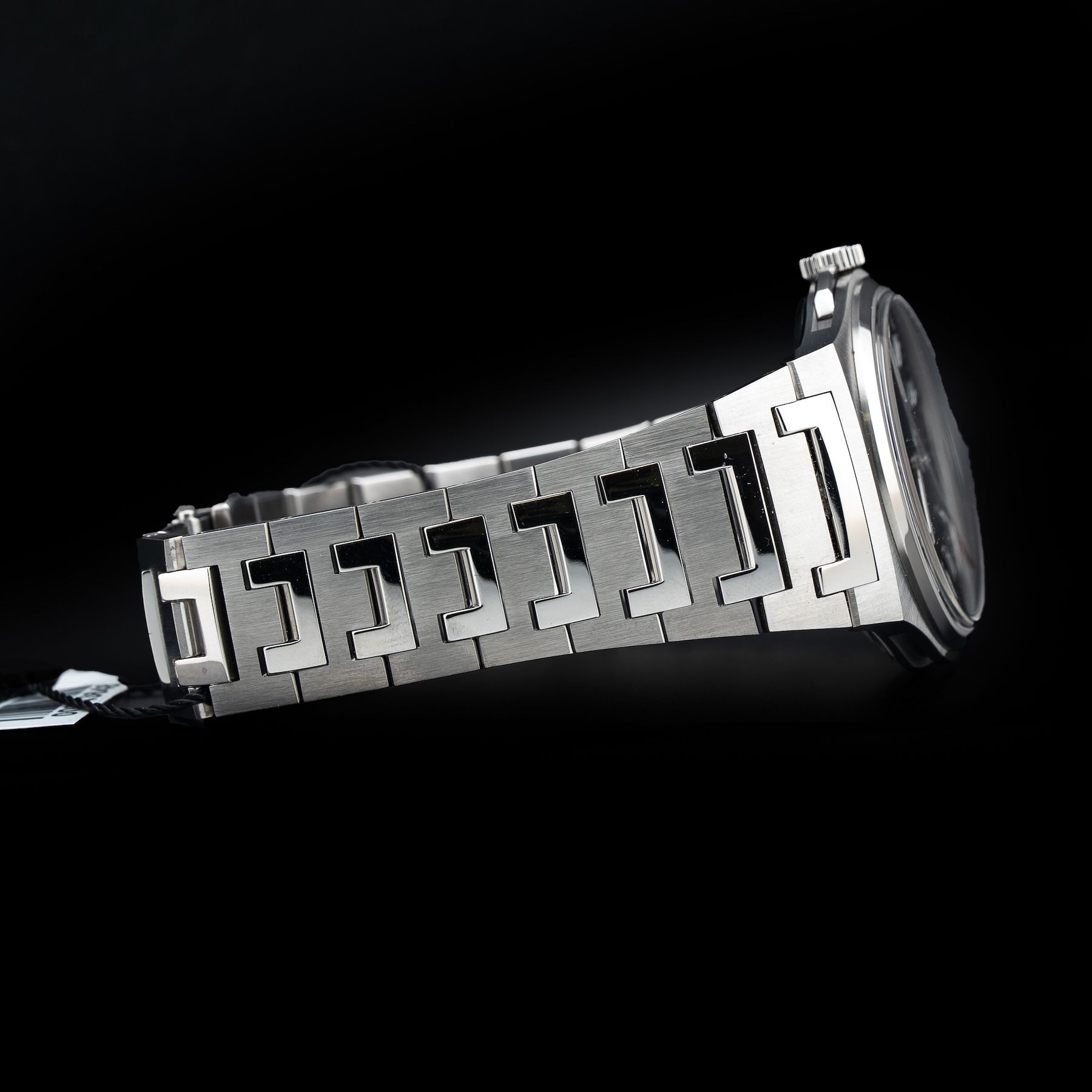 - This timepiece features a 40mm steel case paired with a high quality steel bracelet. It showcases a distinctive black dial and is powered by a precise automatic winding movement. The watch is designed with a water resistance of up to 120m.