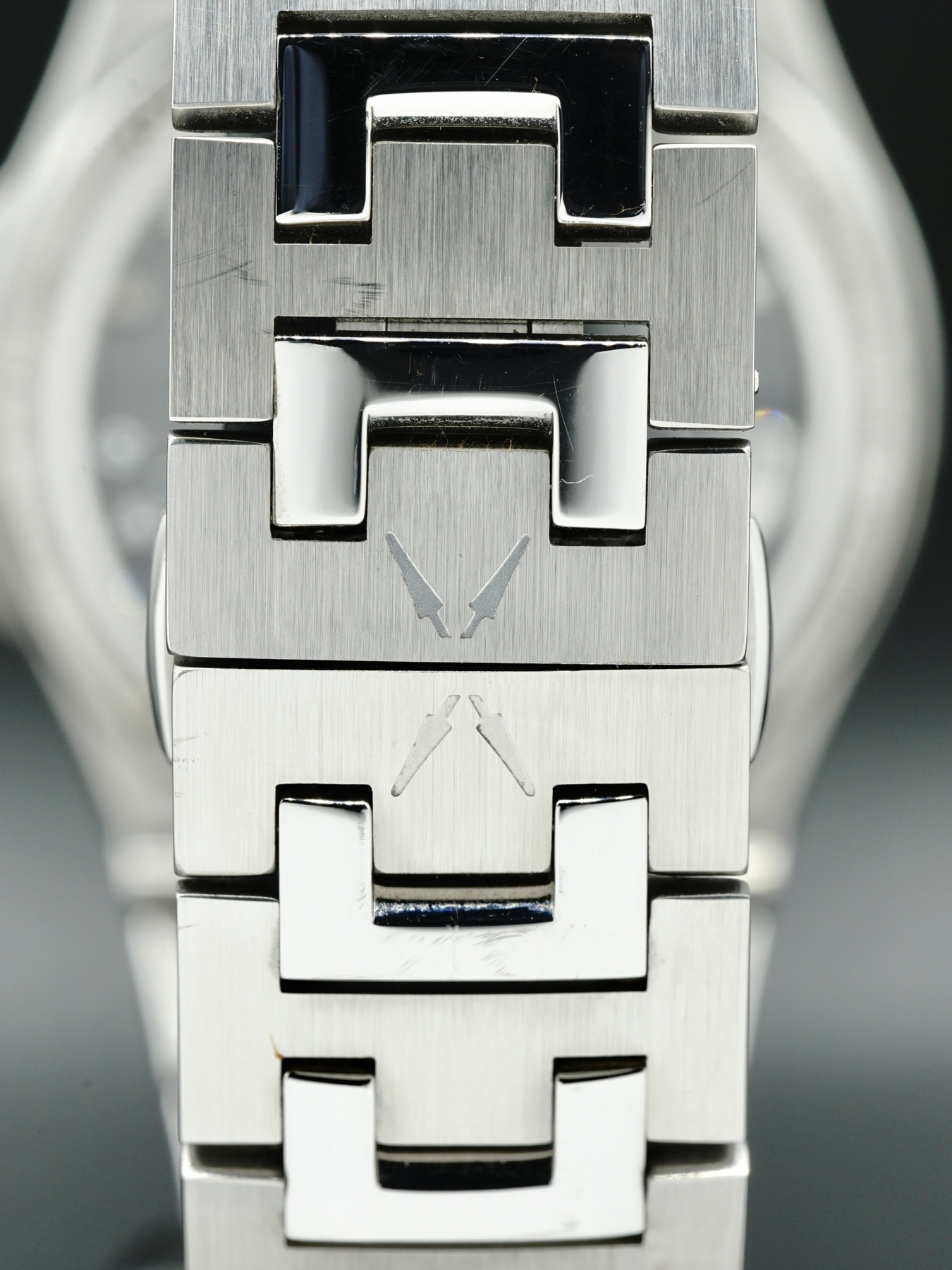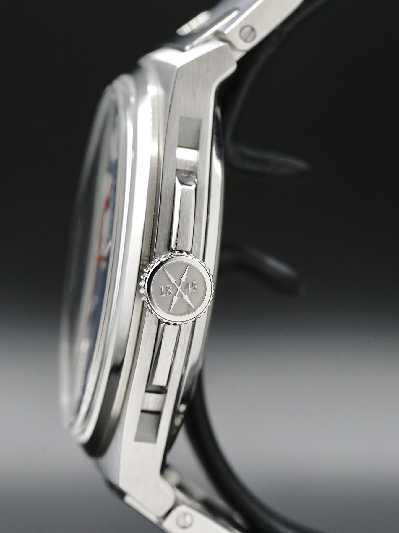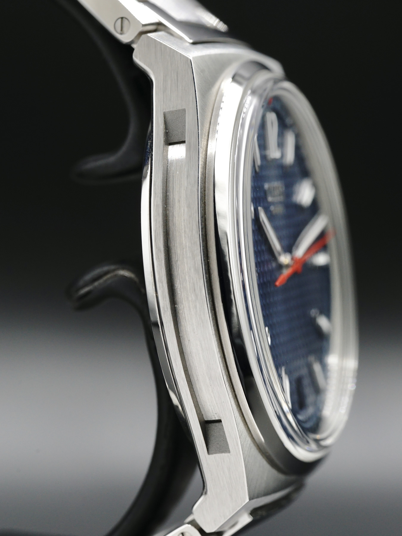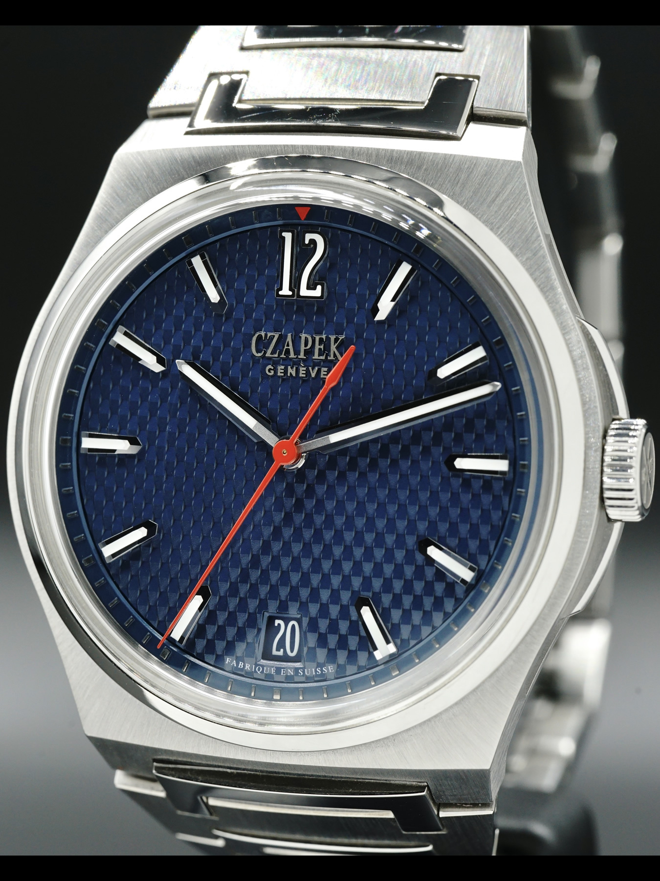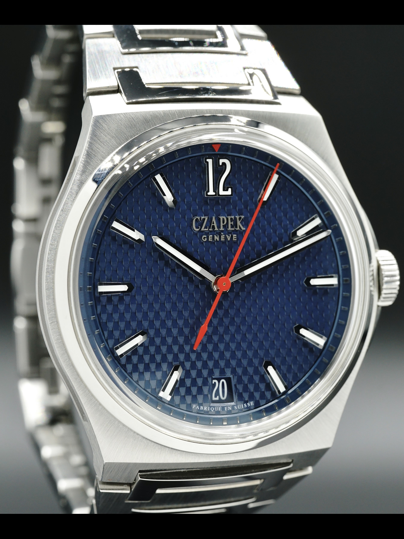This Czapek Passage de Drake Deep Blue features a 40.5mm stainless steel case on a stainless steel bracelet. This watch also showcases a blue, Stamped “flinqué” dial with the exclusive, officially registered “Stairway to Eternity” pattern covered by scratch-resistant sapphire crystal.