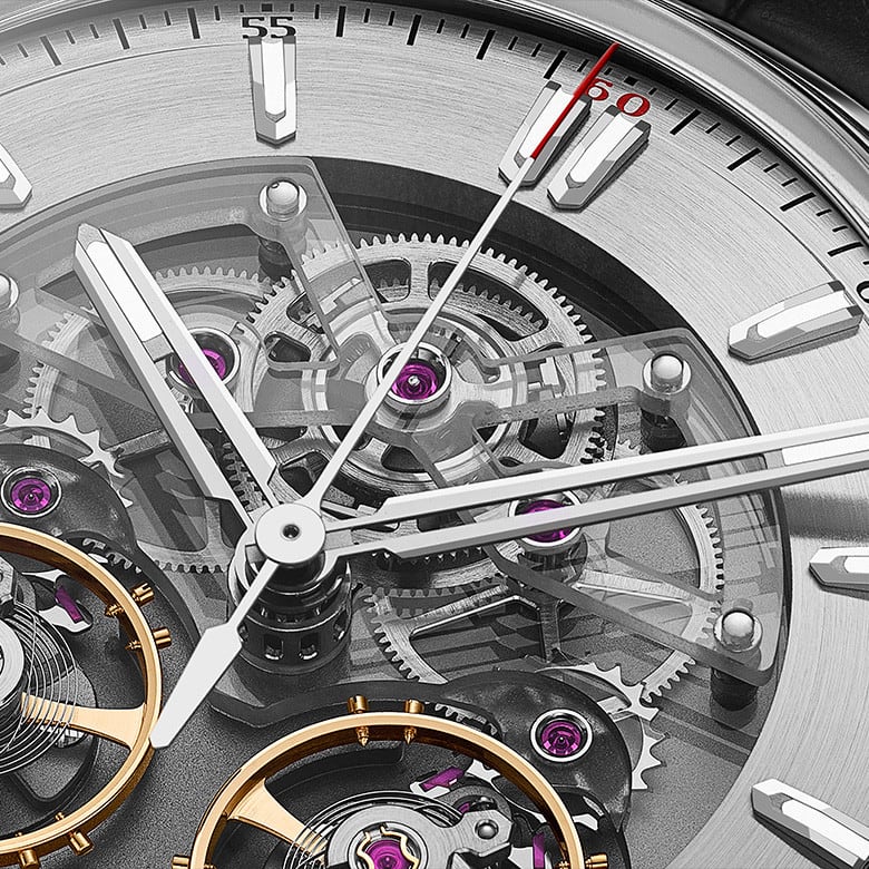 “The real beauty of the idea lies in this way of expressing the double escapement, with the differential at 12 o’clock as a central element,” explains Xavier de Roquemaurel. “And by bringing the mechanism to the dial side and open-working everything, we would also have a beautiful kinetic sculpture.”