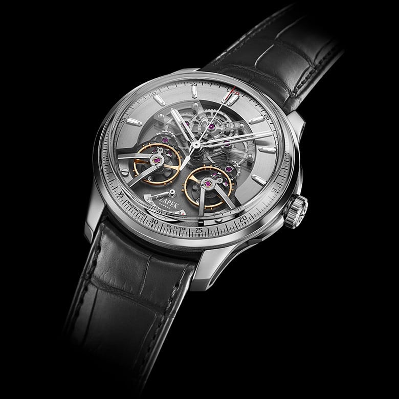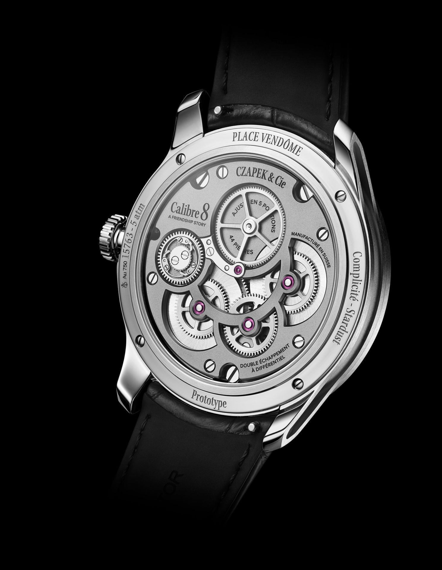 The name of the new timepiece, Place Vendôme Complicité alludes to this collaboration – as well as to the complicity between two independent escapements working in unison.