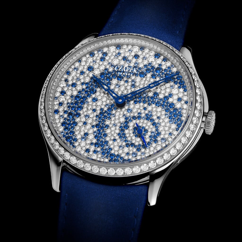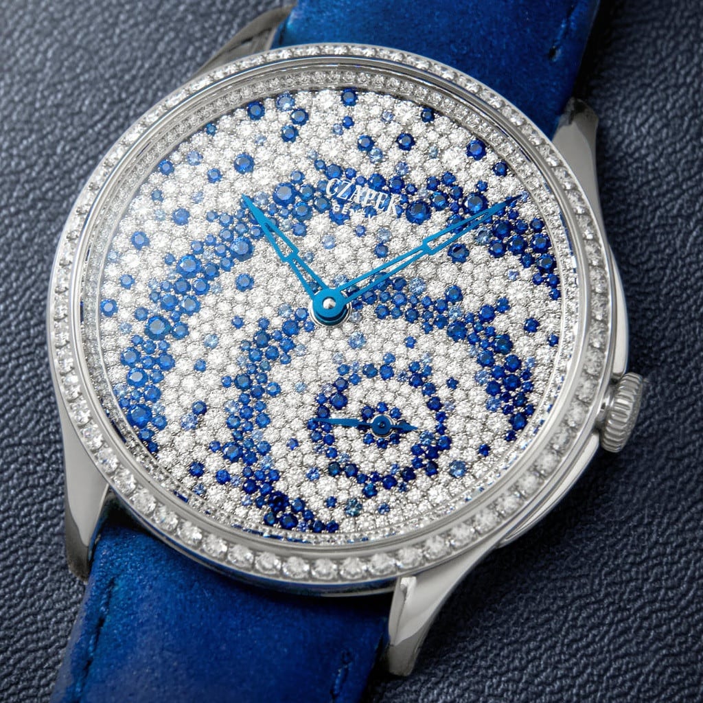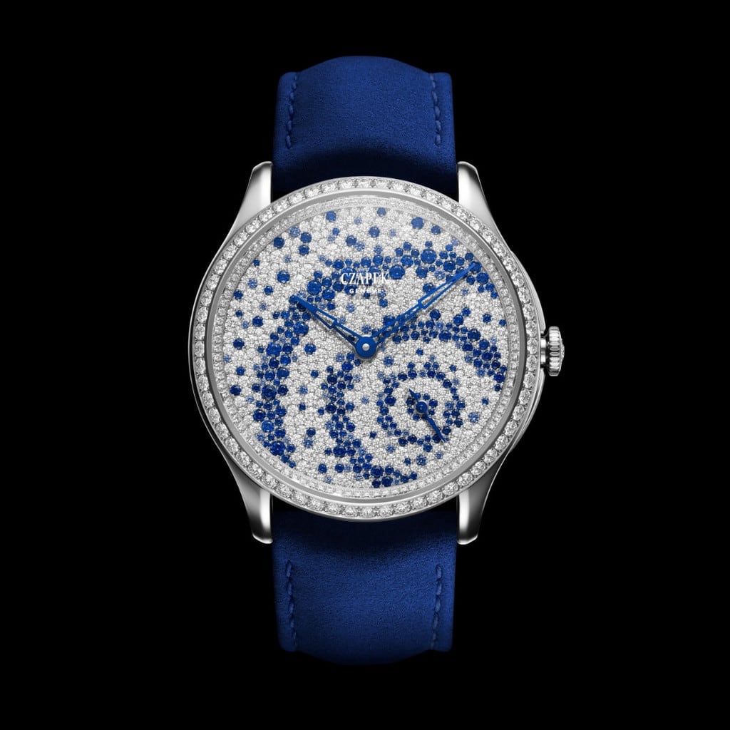 Diamond Drops is a natural progression from that first expression of the idea, says Xavier de Roquemaurel, CEO of Czapek & Cie. “When we sold out of Gouttes d’Eau during its launch at Watches and Wonders 2024 we immediately started playing with other water in its various forms – how it looks when light dances on the surface, how dewdrops sparkle on a sunny morning, what happens when water freezes to become snow or ice… This invited us to play not only with design, colour and materials but also the craft of gem-setting, asking ourselves how we could express the original idea in new ways.”