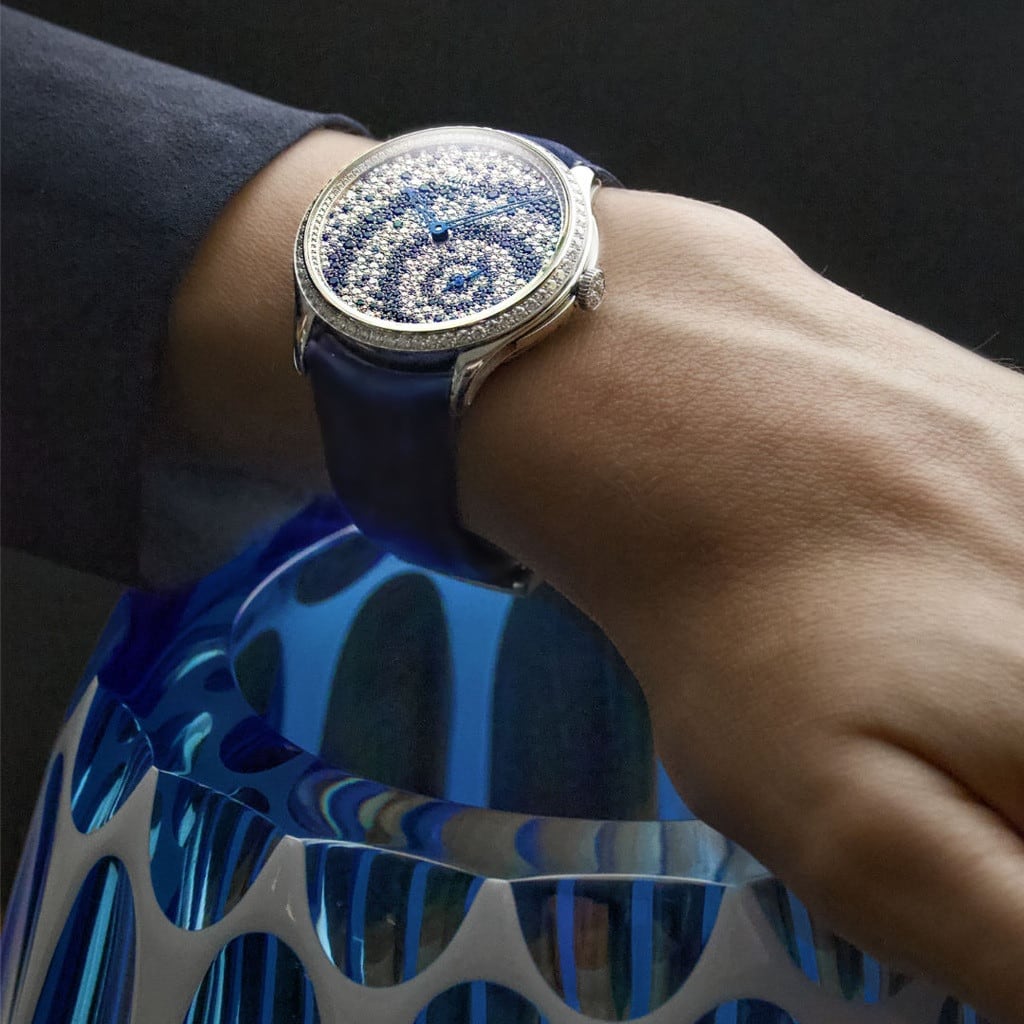 Czapek turned to its trusted partner, AB Products to meet the challenge of creating the Diamond Drops dial. For snow-setting, rather than creating uniform rows of gems held bygold claws, the gem-setter chooses differently sized stones – many less than 0.5 mm in diameter – which are placed into tiny wells hollowed out of the 18K white gold dial base. Each must be set as close as possible to its neighbour, like a microscopic jigsaw puzzle of gemstones. Adding to the challenge, a watch dial must be very thin with a perfectly flat surface, every stone had to be individually measured and the size of the well adapted to its exact size to ensure a perfectly flush finish.