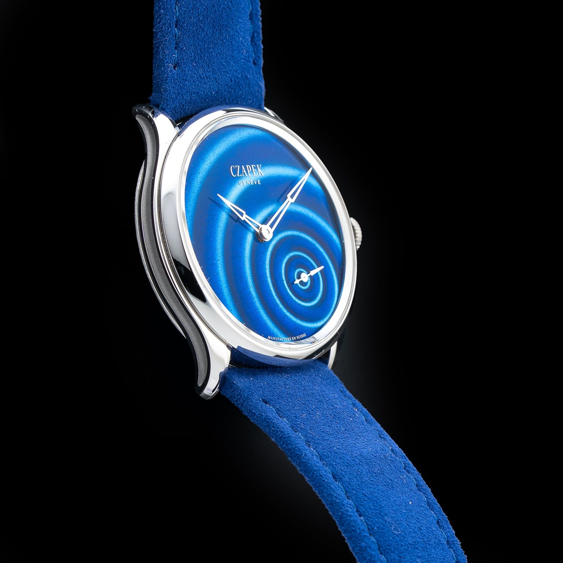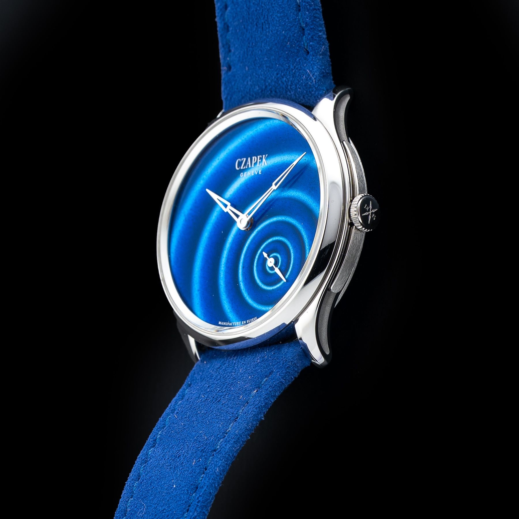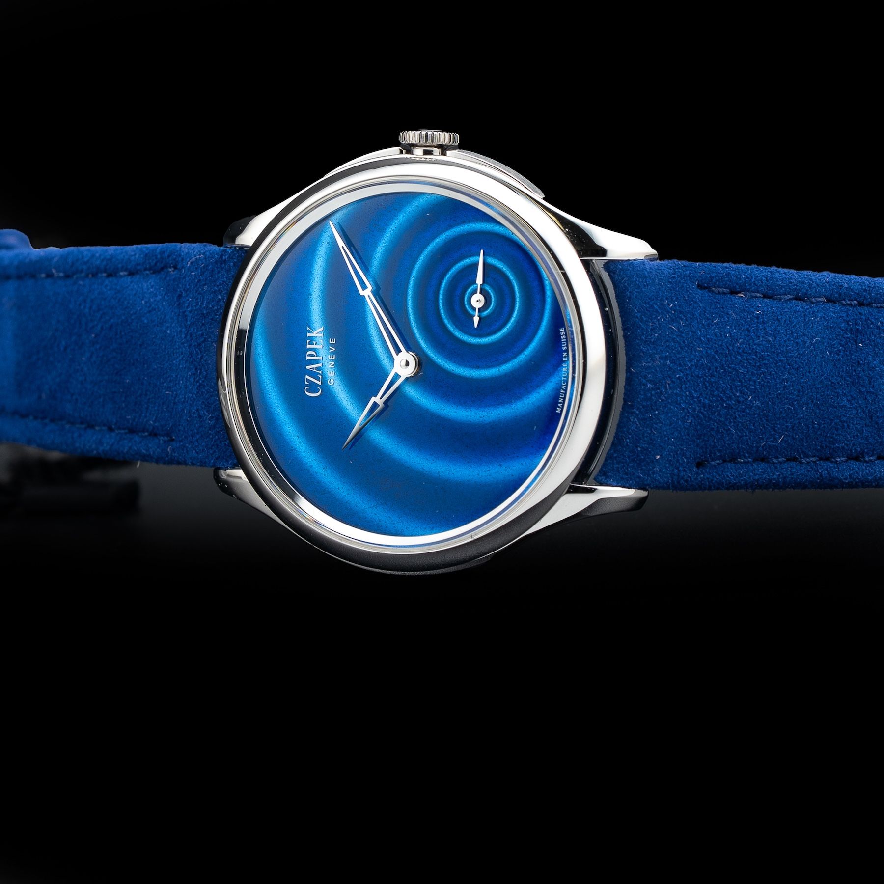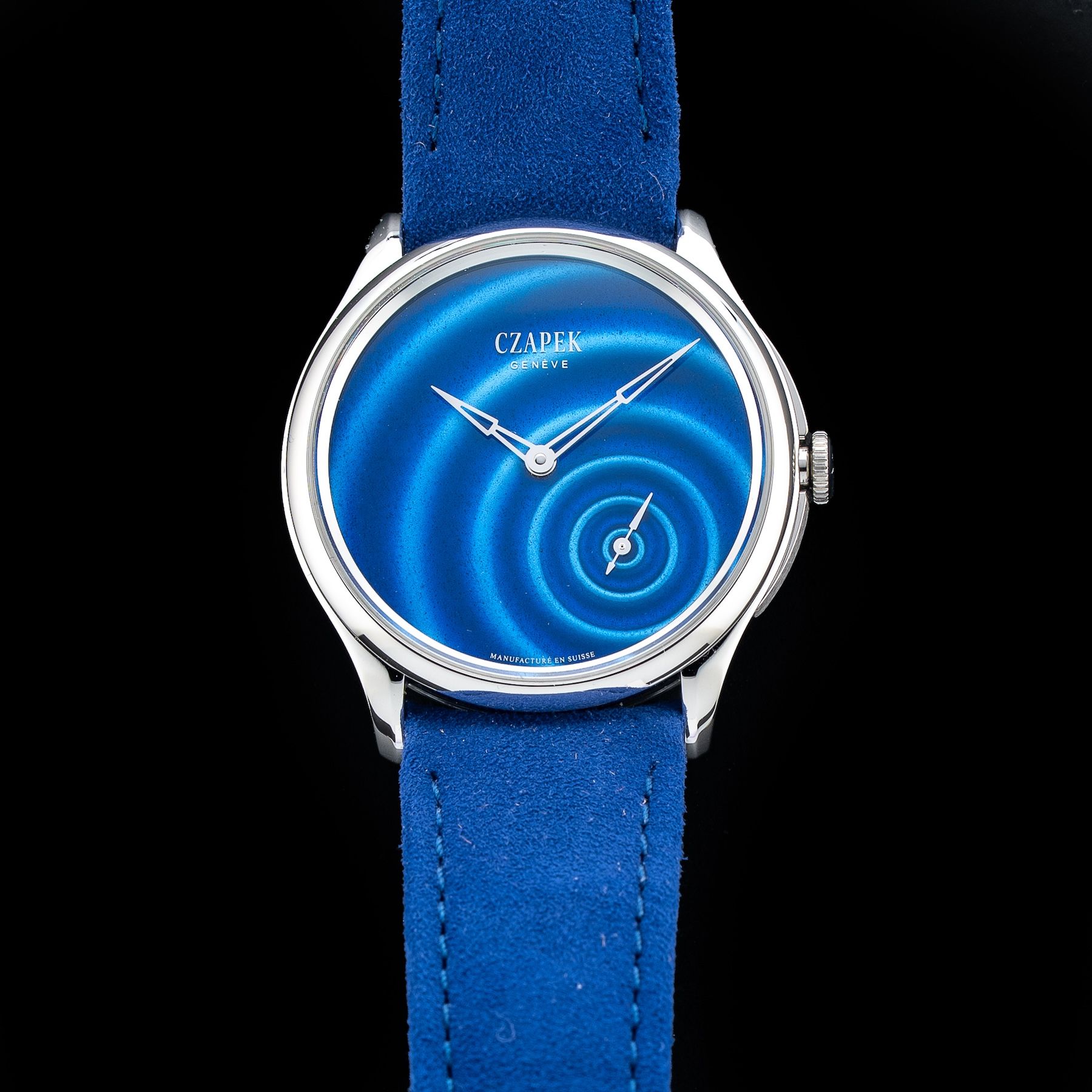 Registered 'Goutte d'eau' design, Grand feu enamel dial creating an optical illusion of water ripples radiating out from the second's sub- dial