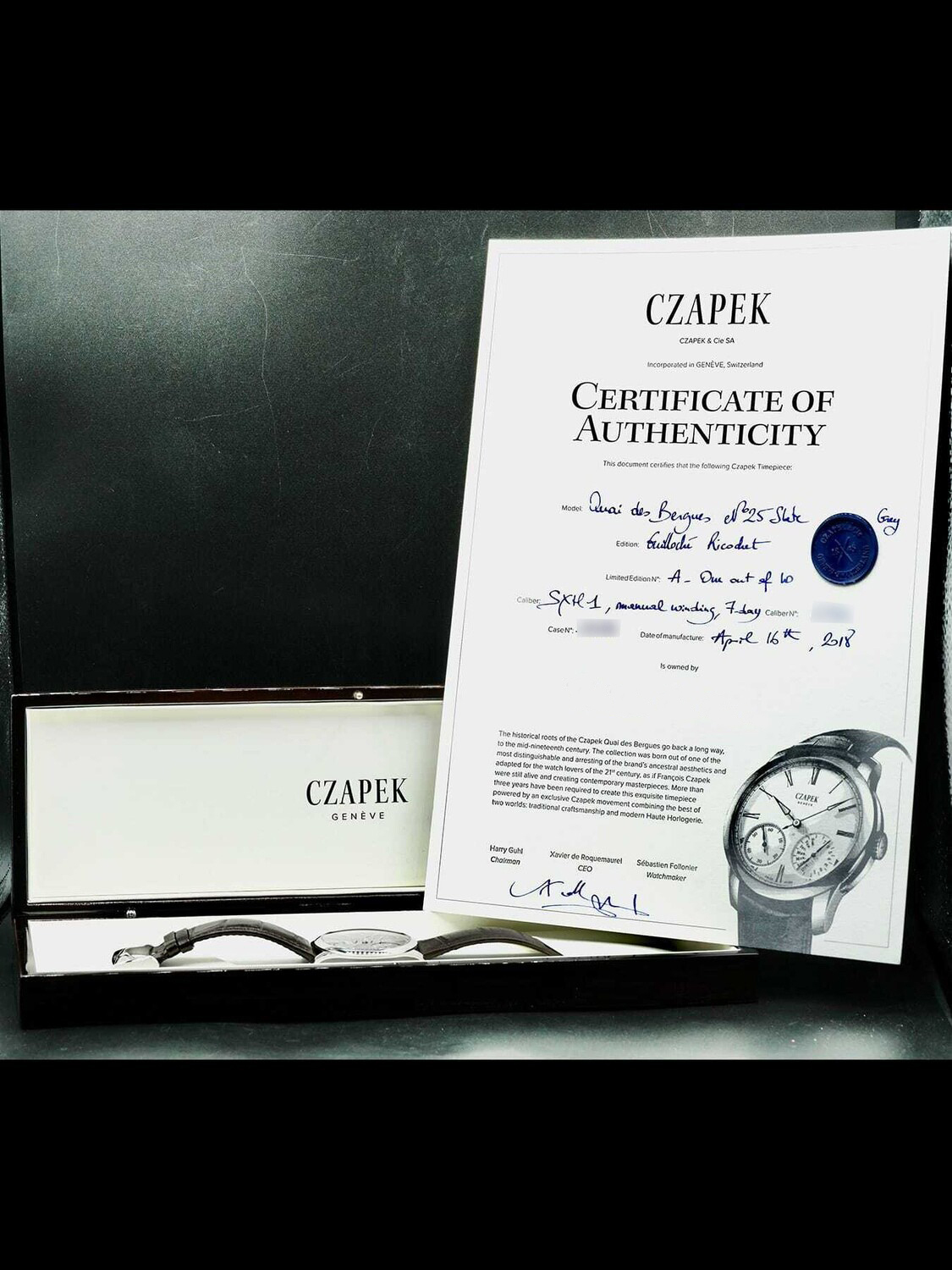 This Czapek Quai Des Bergues No 25 is in EXCELLENT condition. it has boxes and papers. Certificate of authenticity dated for April 2018.