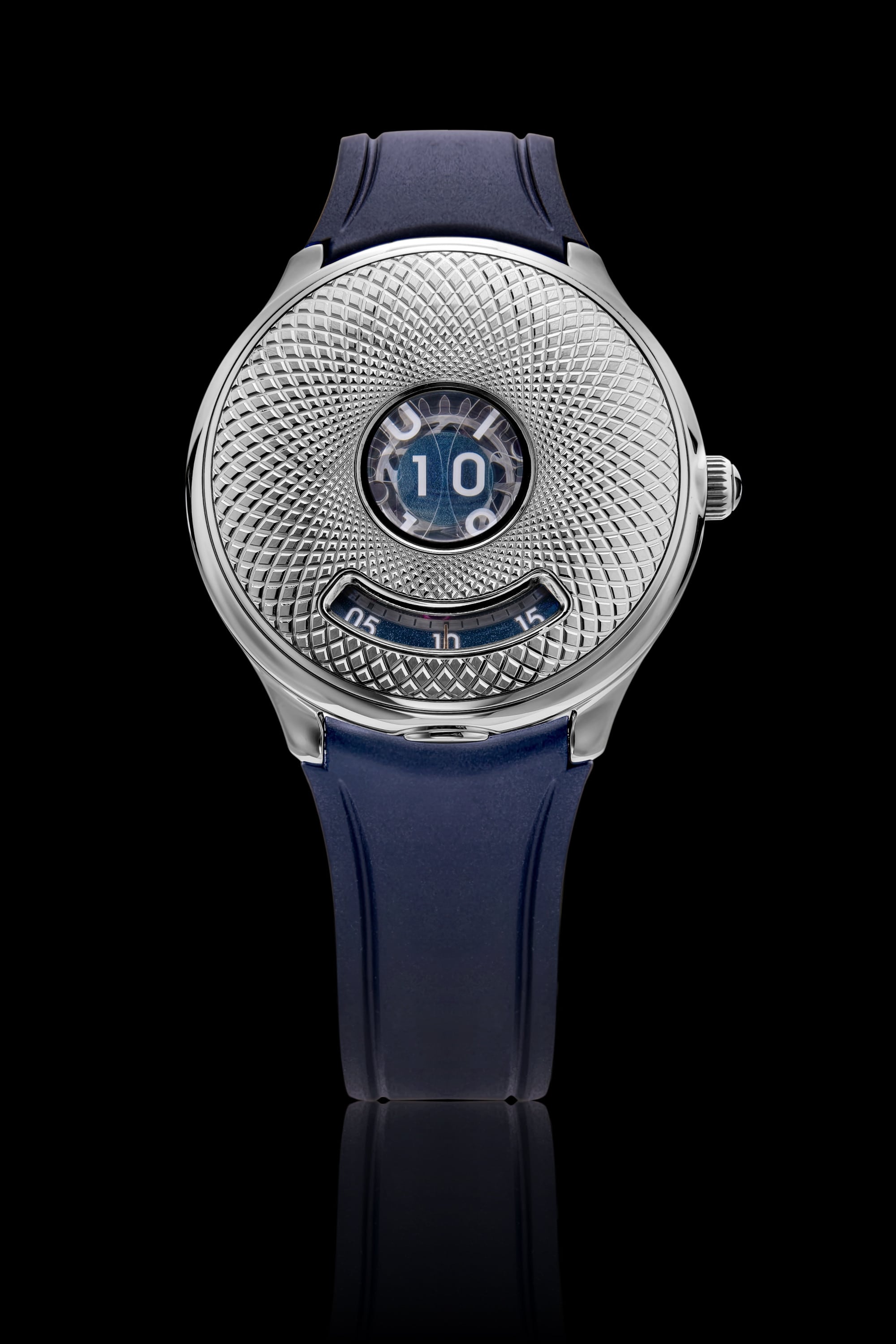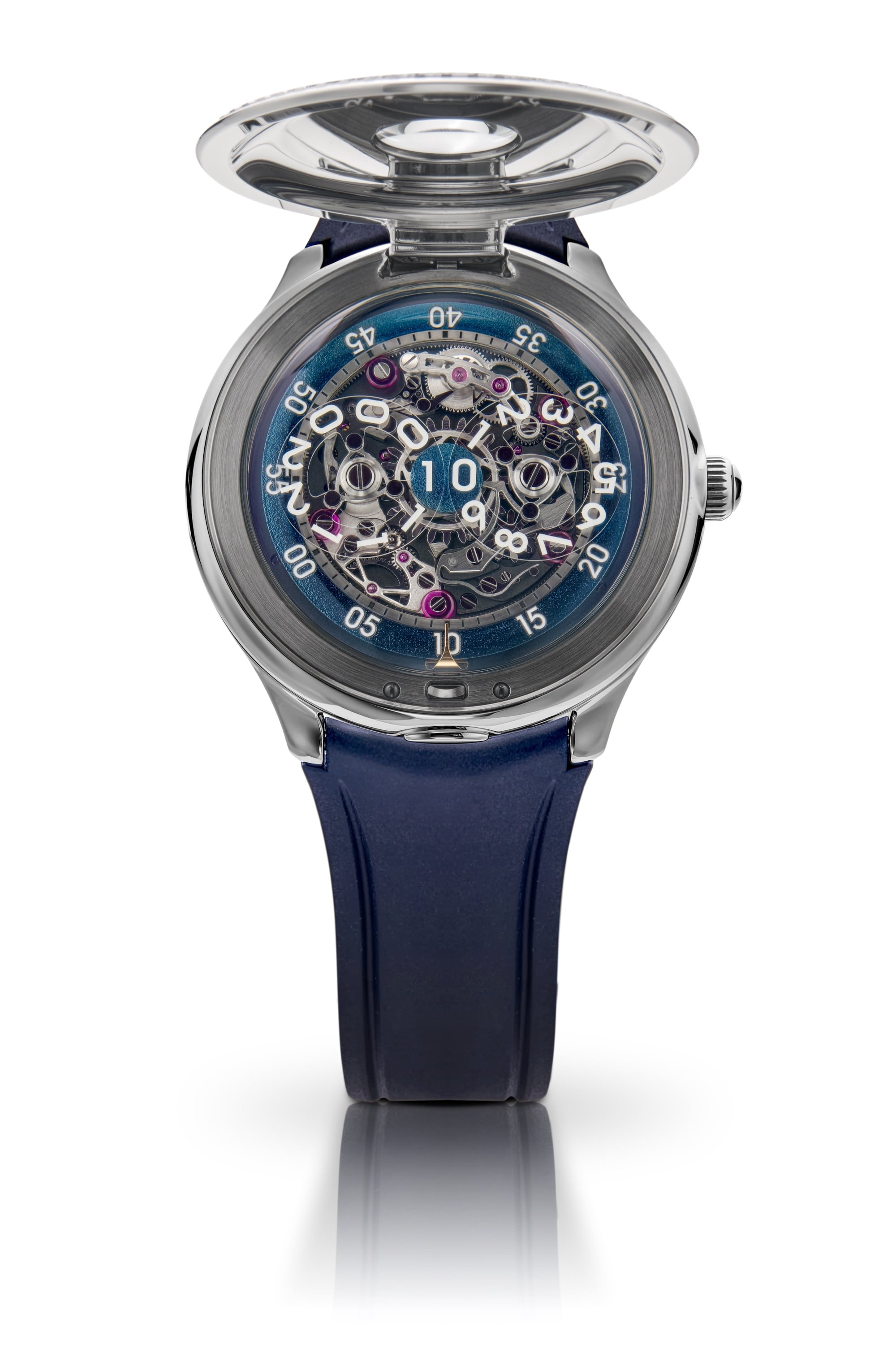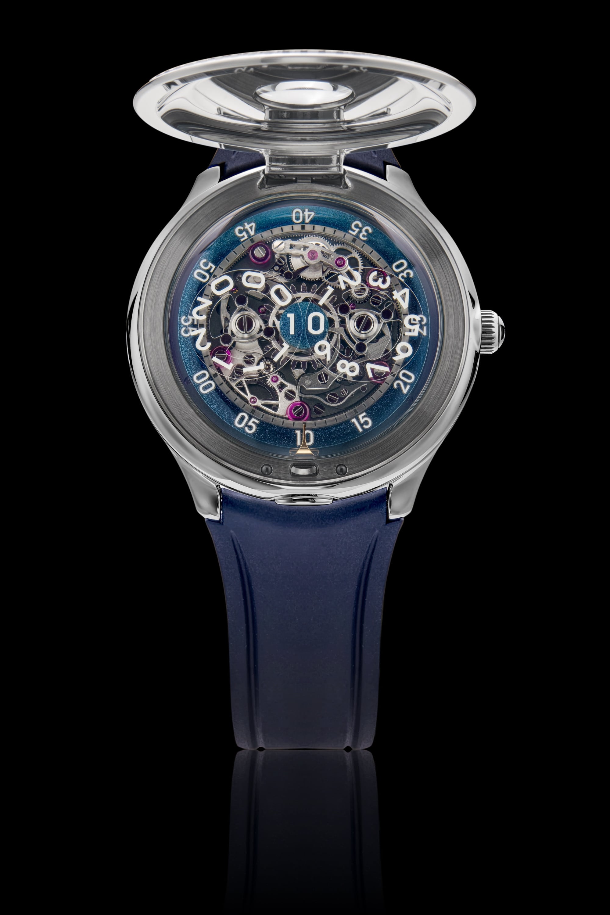 40.5mm stainless steel case, in-house self-winding jumping hour Calibre 10.1 movement.