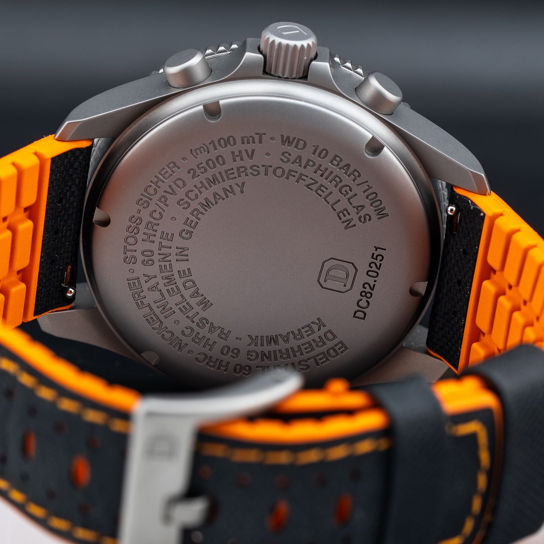 This watch features a 42mm stainless steel case on leather strap. This watch also sports a black dial. Powered by a Damasko chronograph movement. Water resistance up to 100 meters.