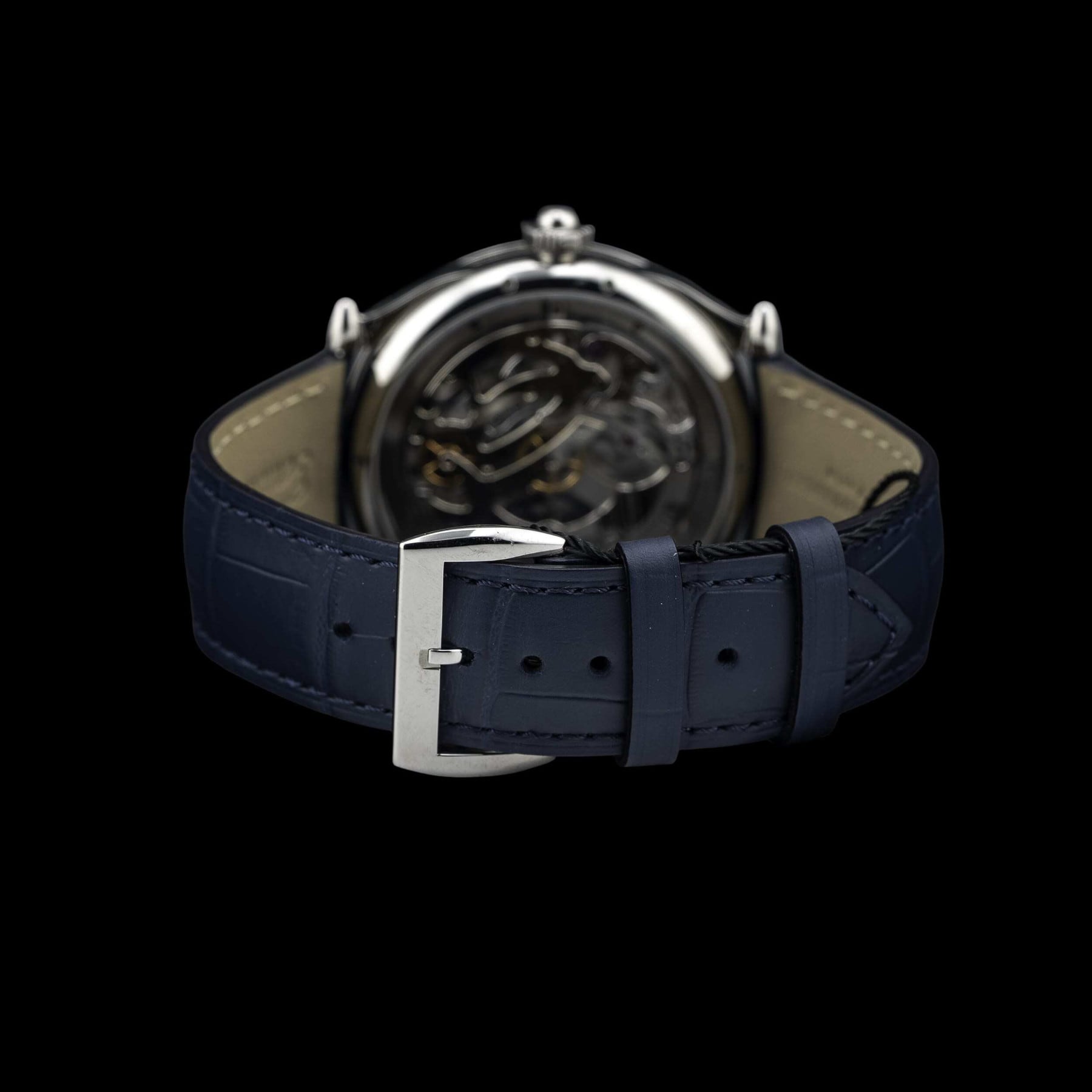 This watch features a 42.4mm titanium case on alligator leather strap. This watch also sports a silver dial. Powered by a manual winding movement. Water resistance up to 30m meters.