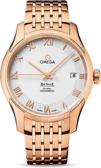 Each of OMEGA's elegant De Ville timepieces is characterized by a unique and classic design. This model features a two-zone silver dial with Roman numeral hour indexes fashioned from 18K gold, and a date window at the 3 o'clock position.