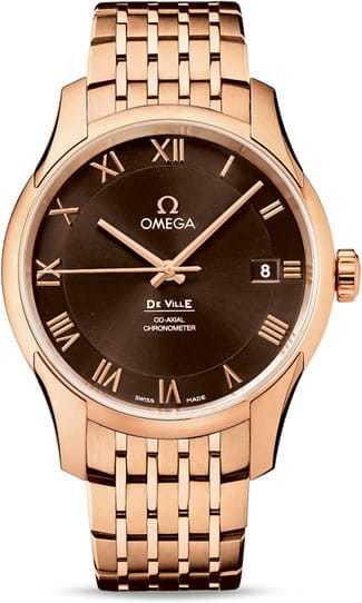 Each of OMEGA's elegant De Ville timepieces is characterized by a unique and classic design. This model features a two-zone brown dial with Roman numeral hour indexes fashioned from 18K gold, and a date window at the 3 o'clock position.