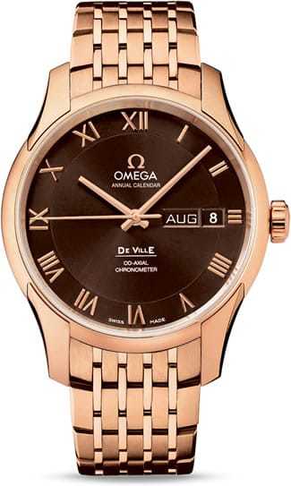 Each of OMEGA's elegant De Ville timepieces is characterized by a unique and classic design. This model features a two-zone brown dial with Roman numeral hour indexes fashioned from 18K gold, and month and date windows located at the 3 o'clock position.