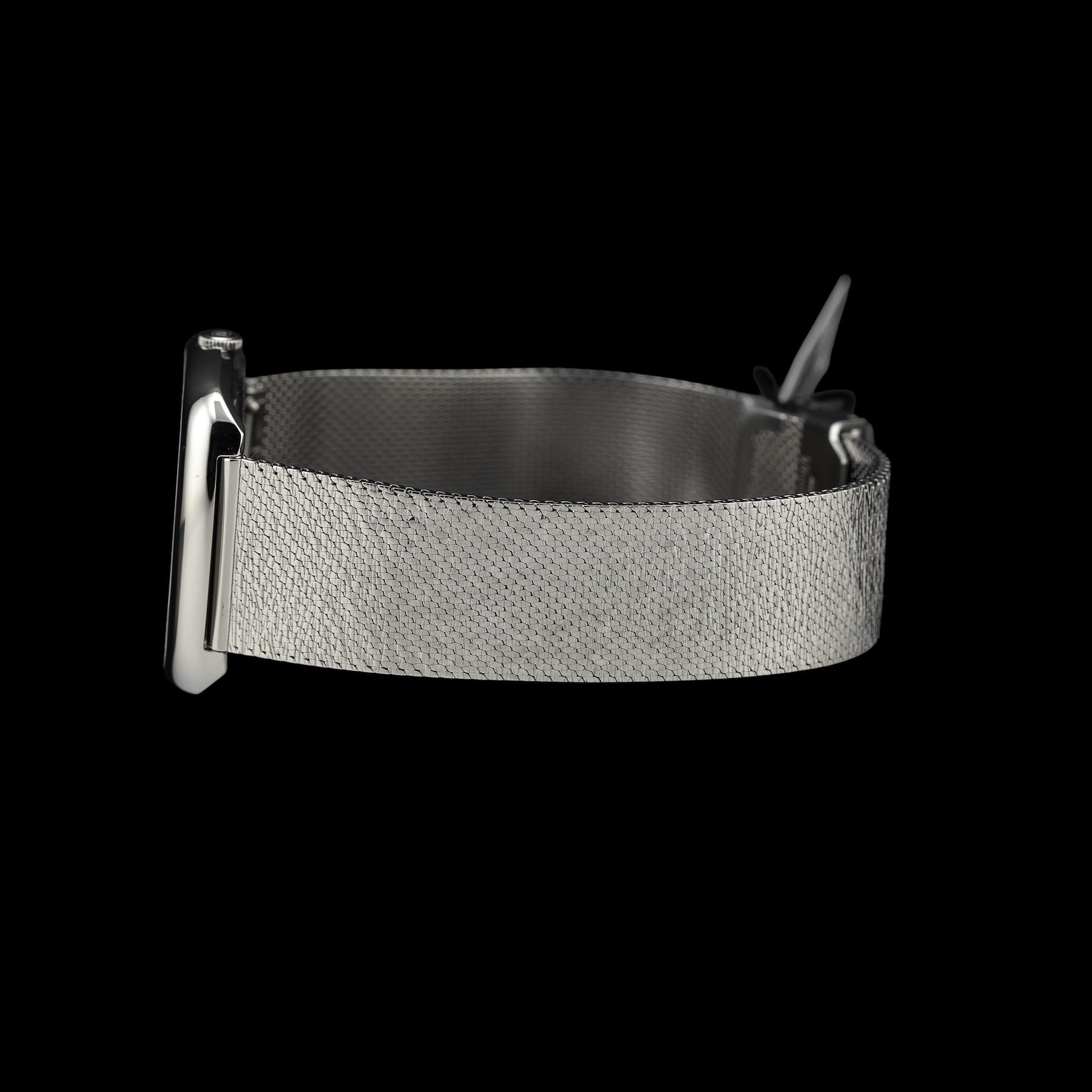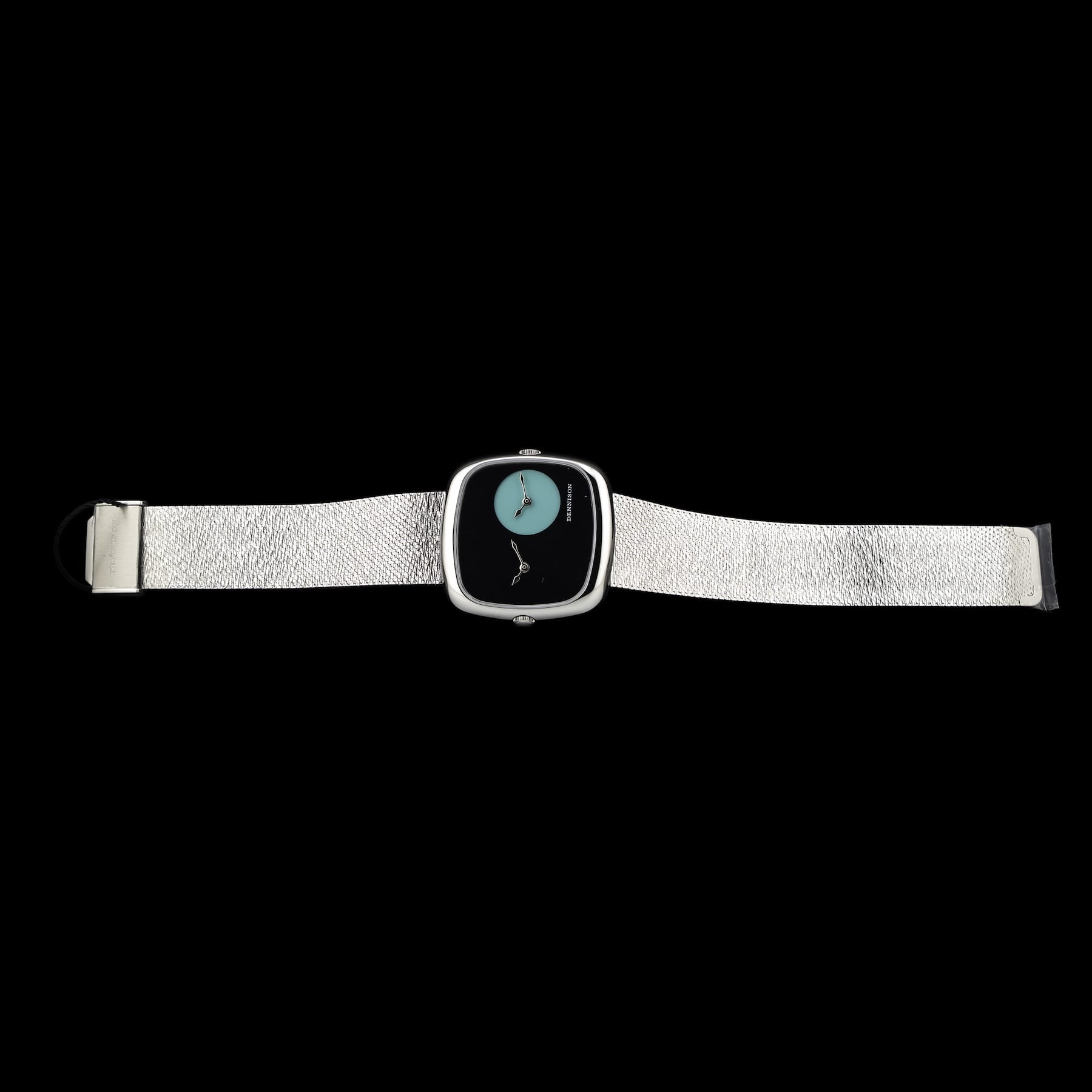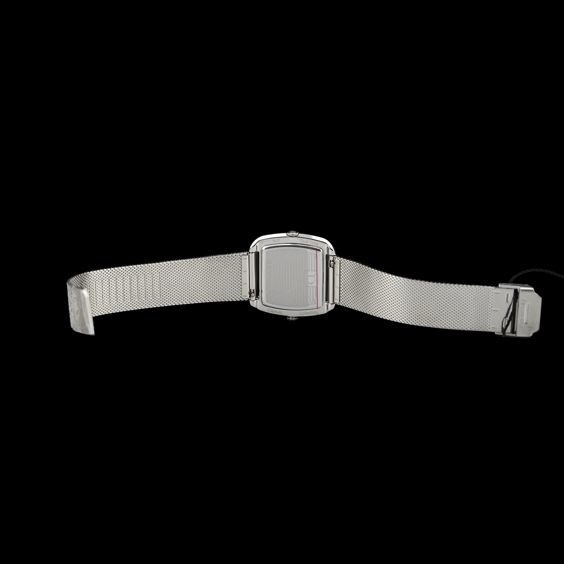 This watch features a 37mm stainless steel case on stainless steel bracelet. This watch also sports a black dial. Powered by a quartz movement. Water resistance up to 30 meters.