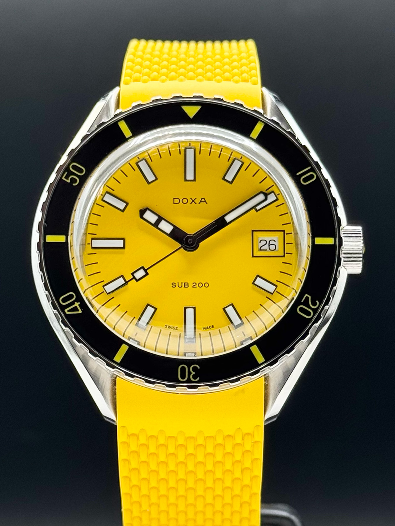 This watch features a 42 mm stainless steel case on rubber strap. This watch also sports a yellow dial. Powered by a swiss mechanical automatic, movement. Water resistance up to 200 meters.