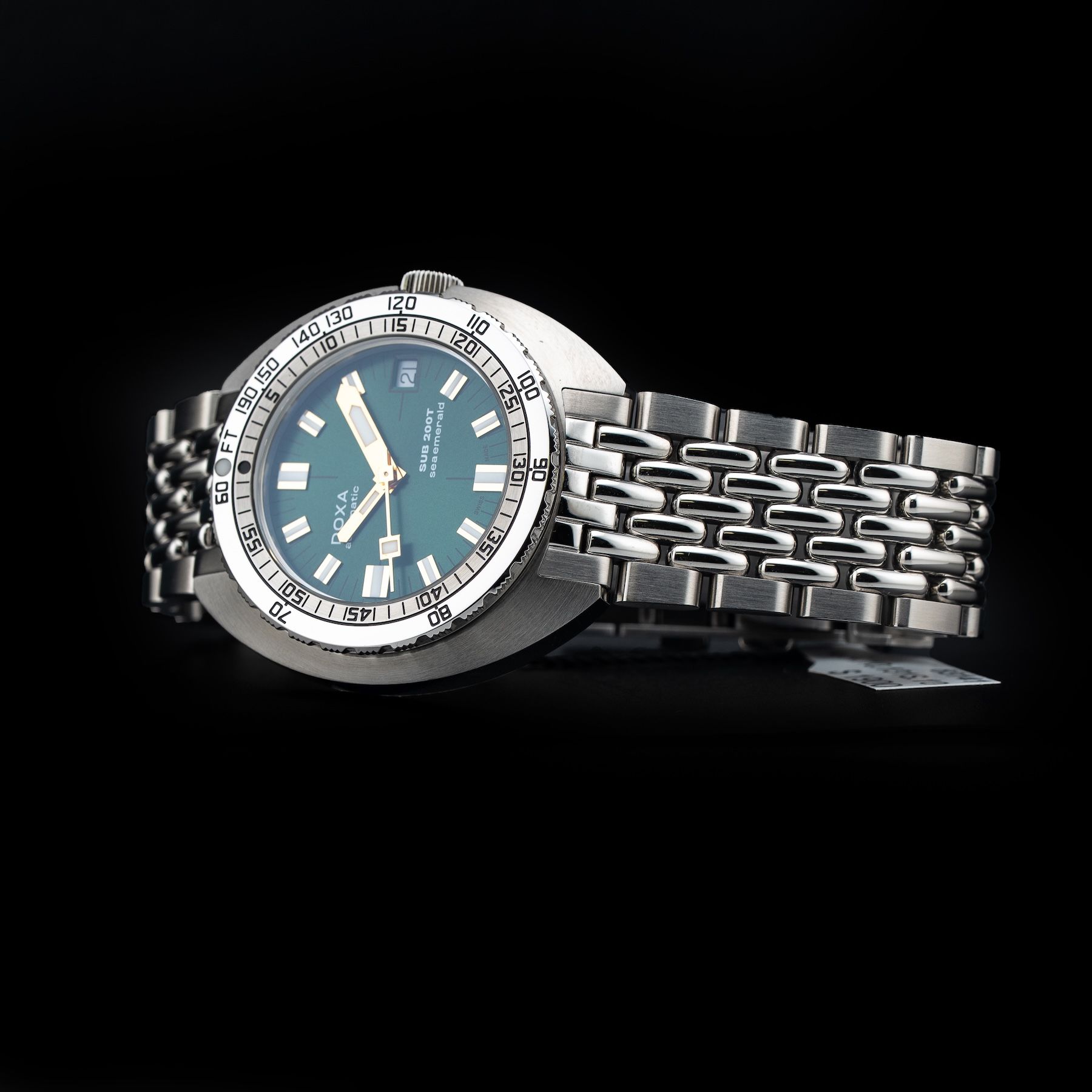 This watch features a 39mm stainless steel case on stainless steel bracelet. This watch also sports a green dial. Powered by a mechanical automatic movement. Water resistance up to 200 meters.