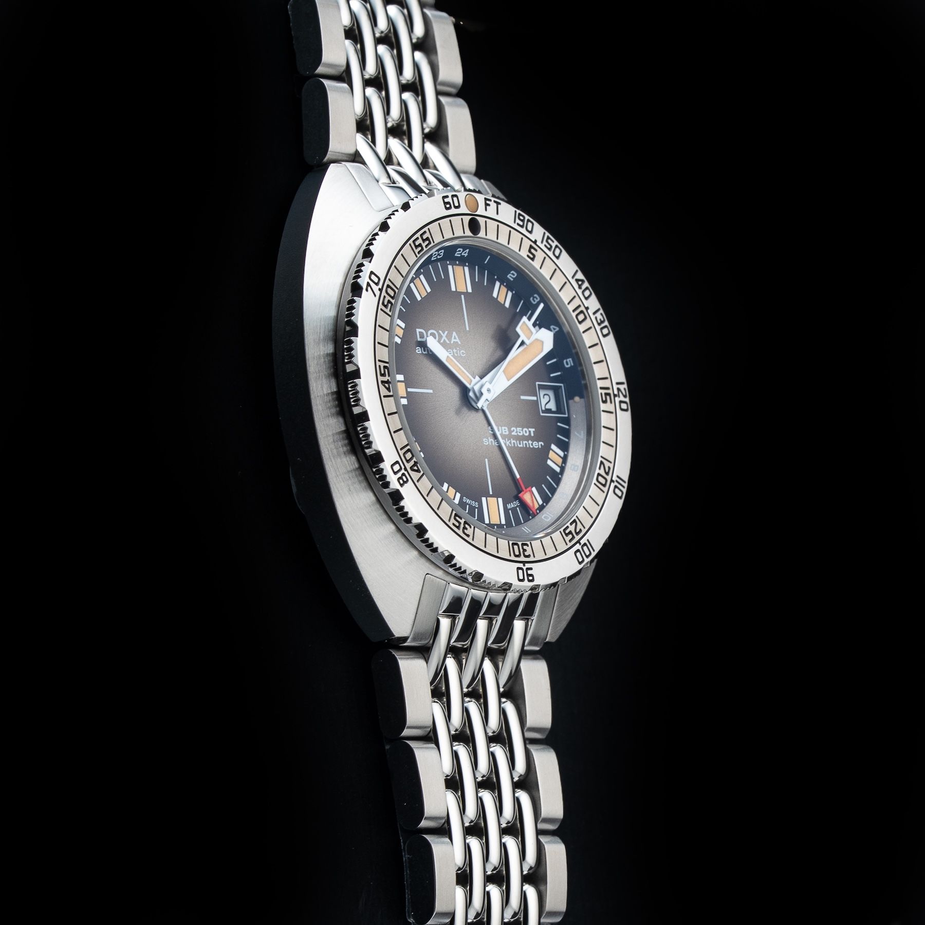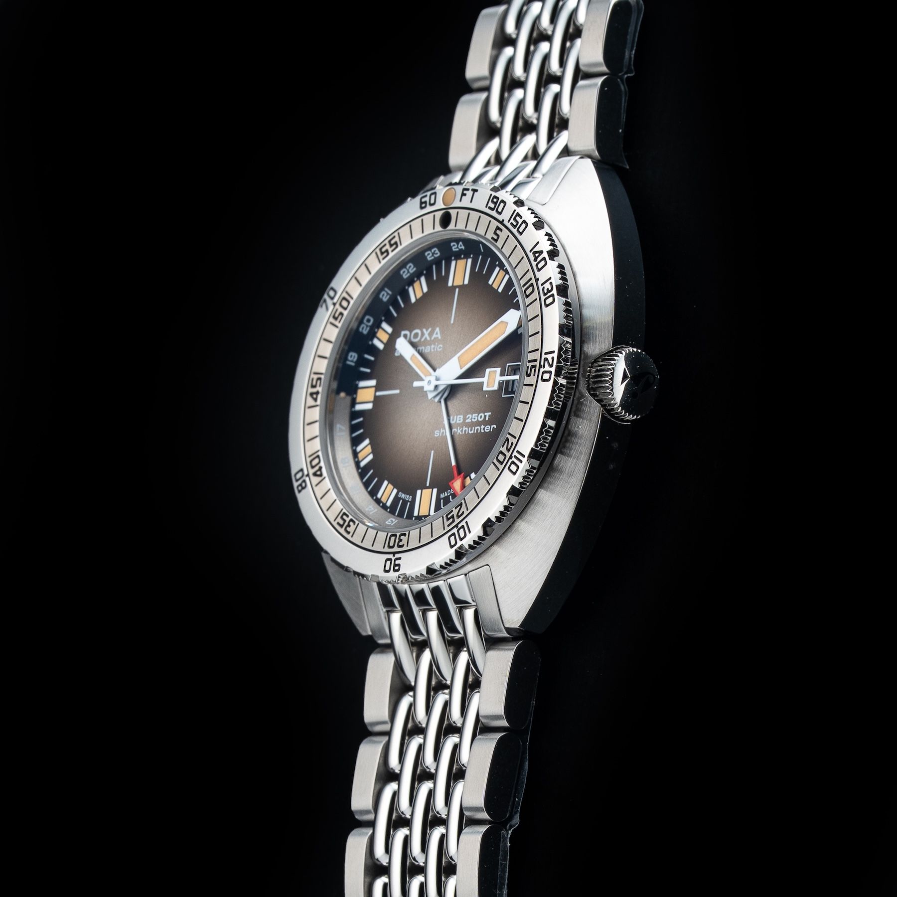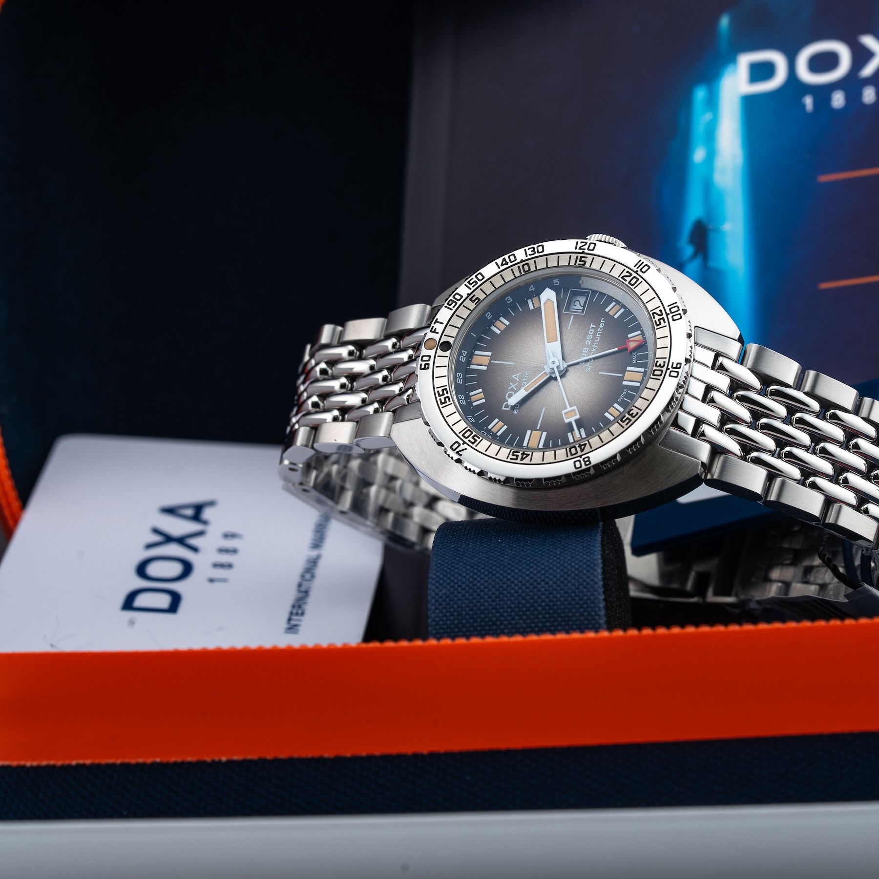 This DOXA 855.10.101V.10 SUB 250T GMT Sharkhunter Vintage On Stainless Steel Bracelet is in GREAT condition, it has box, papers and warranty card. This watch has been fully authenticated and certified by Exquisite Timepieces. Please note, the photos shown are of the actual watch you will receive.