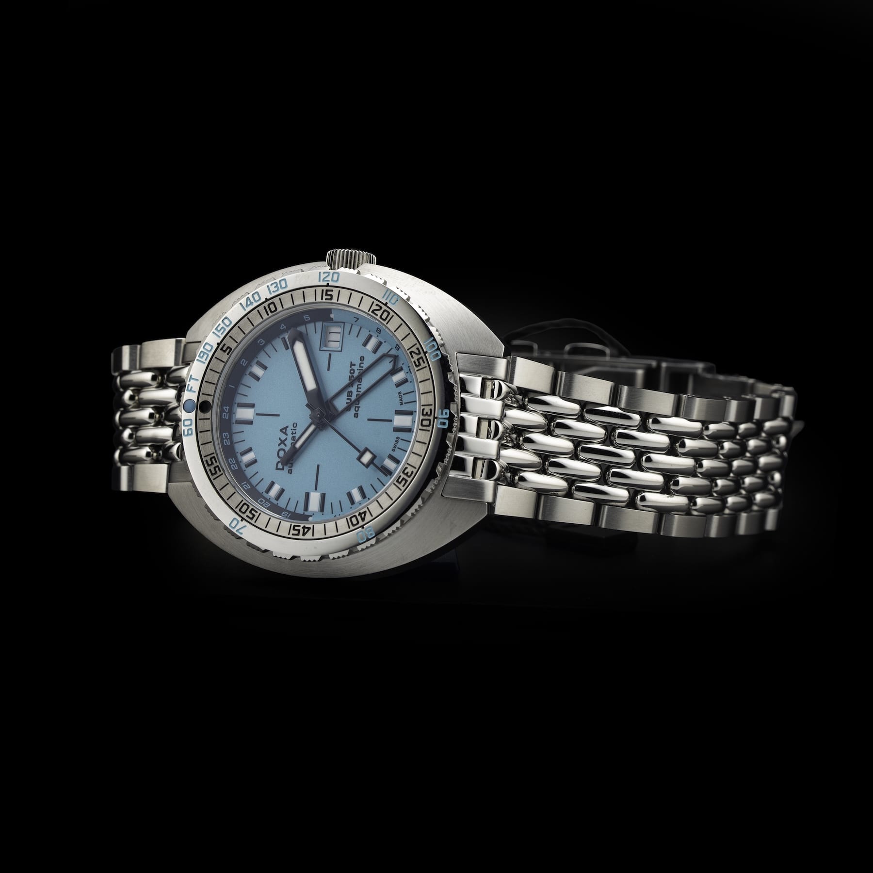 - This timepiece features a 40mm steel case paired with a high quality steel bracelet. It showcases a distinctive turquoise dial and is powered by a precise automatic winding movement. The watch is designed with a water resistance of up to 250m.