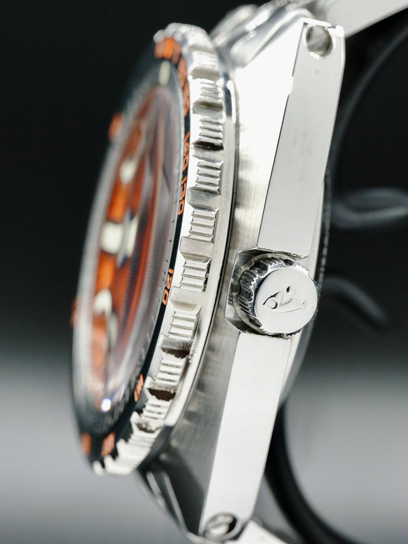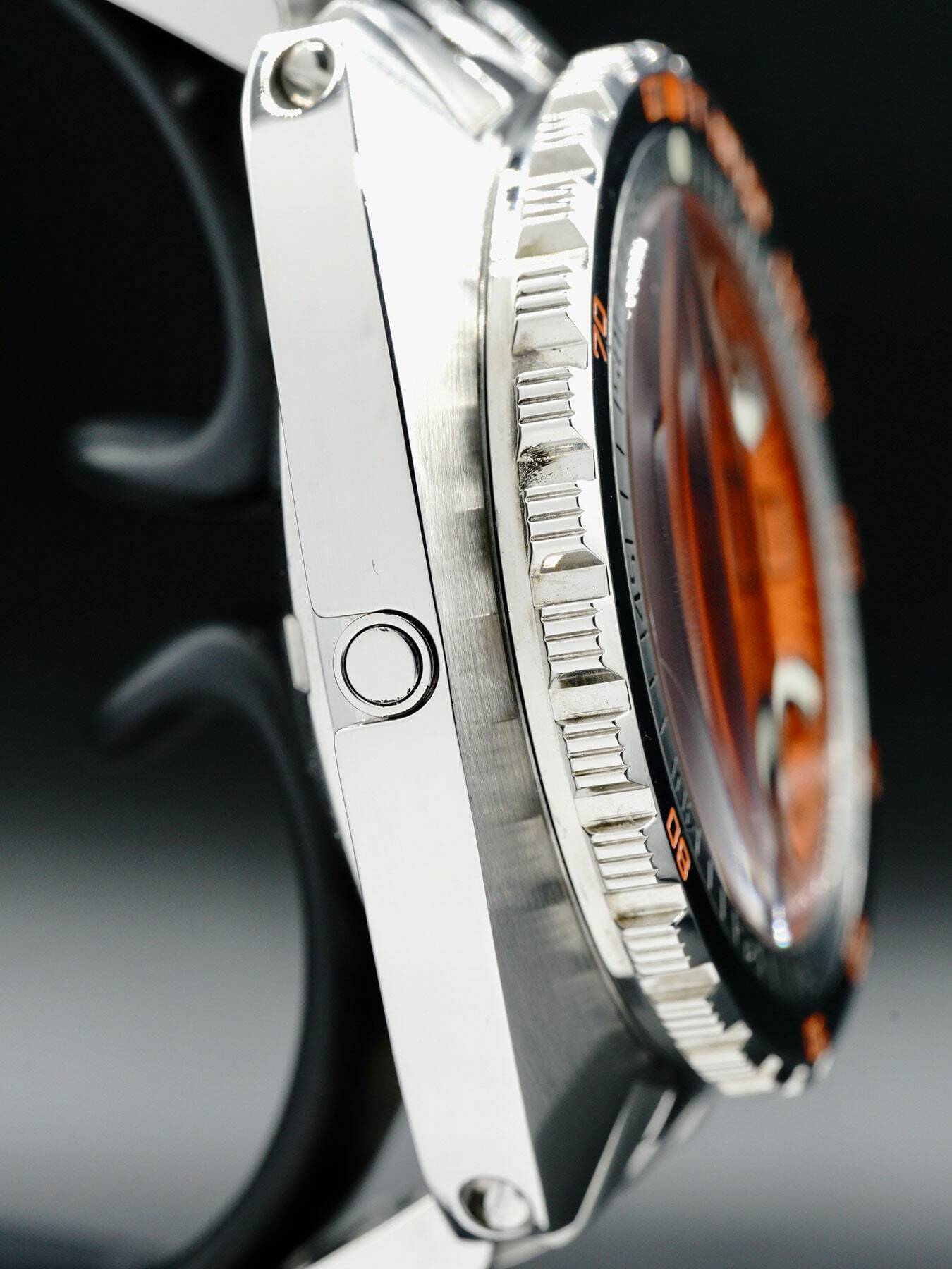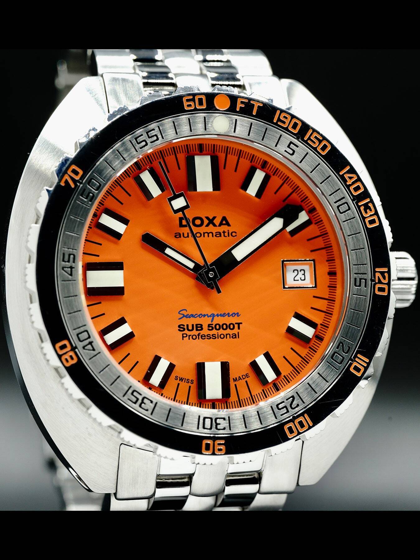 This Doxa Sub 5000T Seaconqueror features a 45mm stainless steel case and solid case back on a stainless steel bracelet. This watch also showcases an orange dial with luminous hands and index dial markers covered by anti-reflective, scratch resistant sapphire crystal.