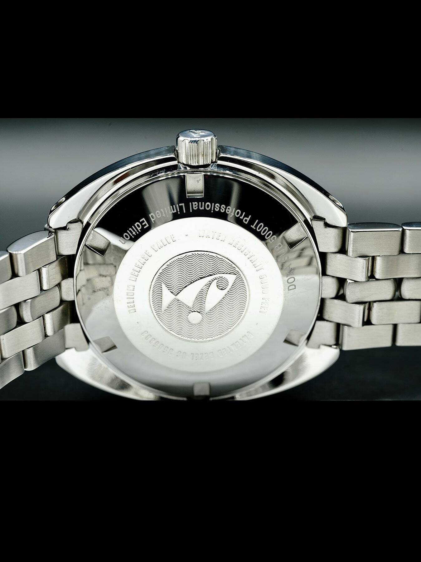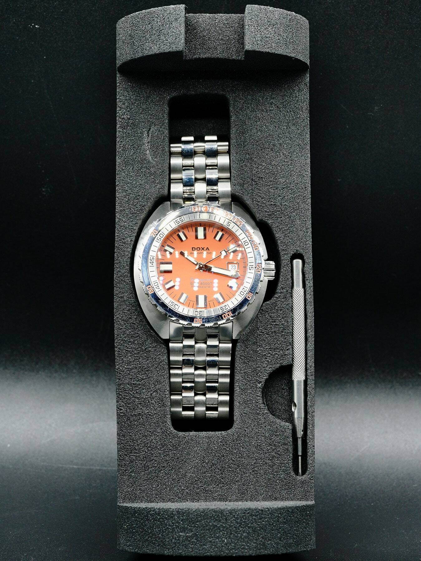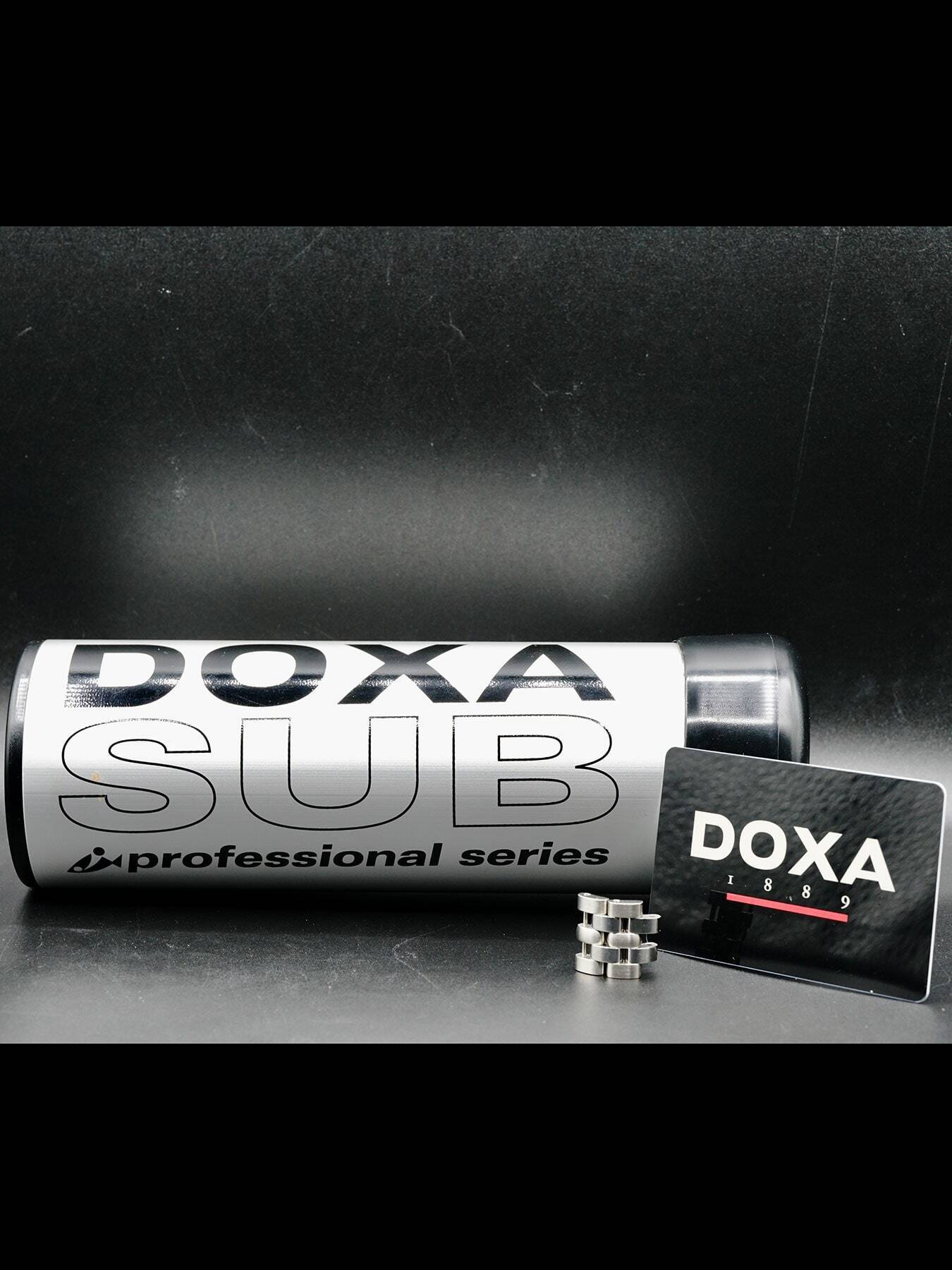This Doxa Sub 5000T Seaconqueror is in EXCELLENT condition. This watch includes its original tank storage box and limited two-year warranty card dated for November 2009. Extra stainless steel bracelet links and spring tool. Limited Edition of 5,000 pieces.