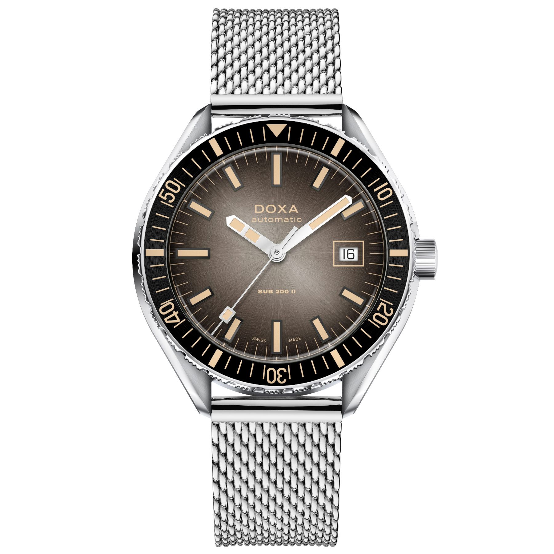 More than a stylistic detail, this treatment adds texture while maintaining DOXA’s hallmark legibility. The contrast between the gleaming center and the darker periphery reinforces the dial’s presence without disturbing its equilibrium, giving the SUB 200 II a more nuanced, contemporary personality – while keeping it firmly anchored in its professional dive watch heritage.