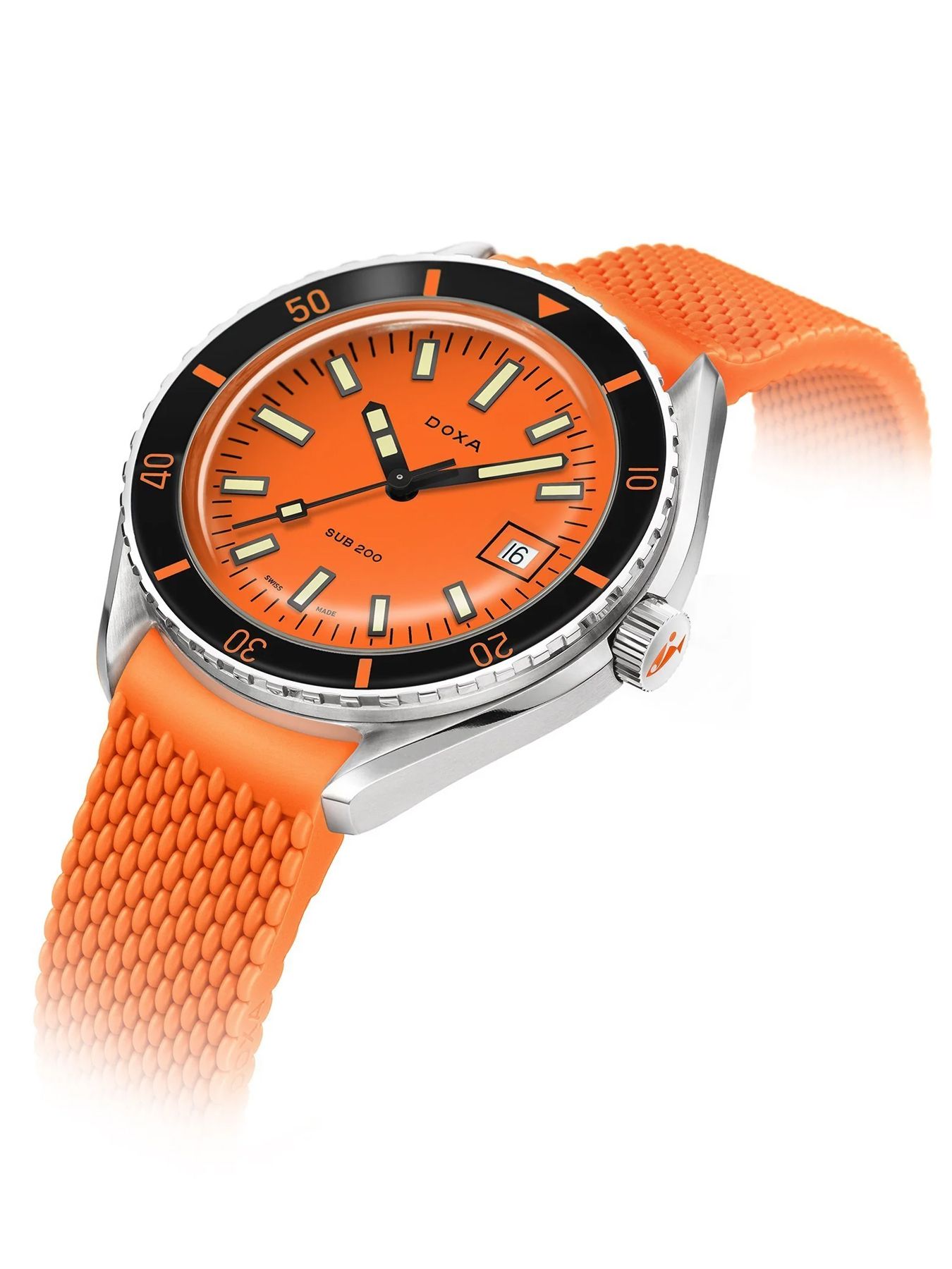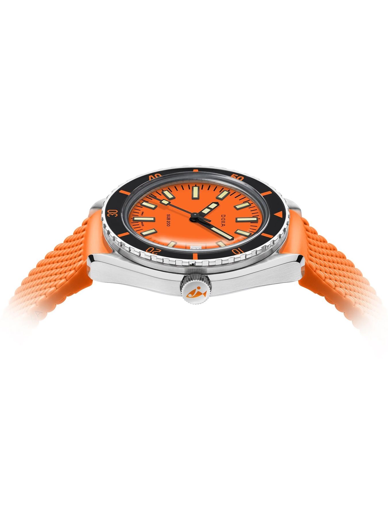 Unveiled at Baselworld 2019, this 3-hand diver's watch has a case made of highest-quality 316L stainless steel. At a diameter of 42 mm, the SUB 200 is topped by a scratch-resistant sapphire crystal with an anti-reflective coating and the distinctive curvature of the domed plexiglass used back in the day. Waterproof to a depth of 200 meters (20 ATM), the model features a unidirectional rotating bezel. All the elements providing dive-relevant information, including the bezel, have a Super‑LumiNova® luminescent coating. The bracelet is 316L stainless steel and features a folding clasp with the DOXA fish symbol.