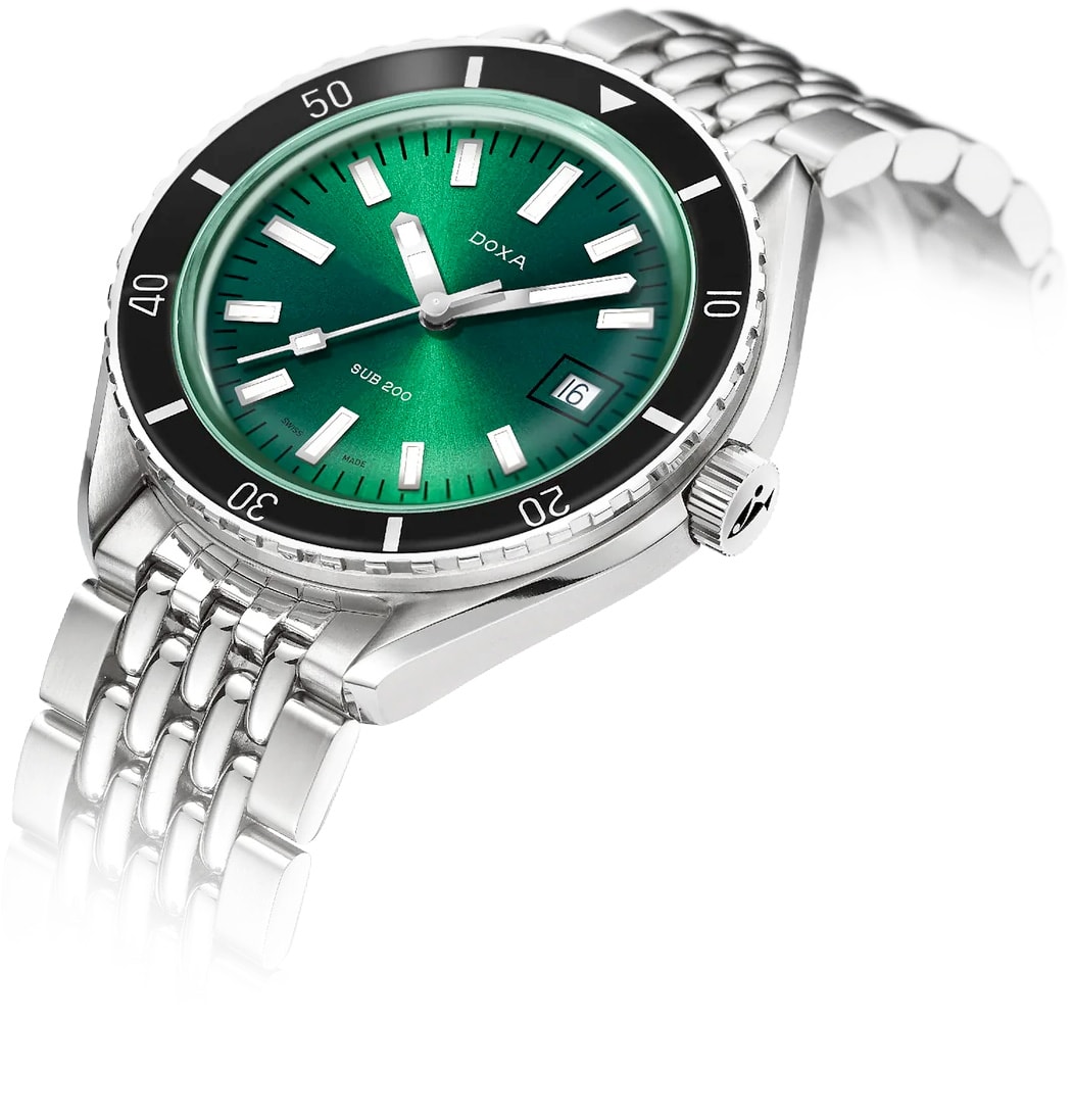Unveiled at Baselworld 2019, this 3-hand diver's watch has a case made of highest-quality 316L stainless steel. At a diameter of 42 mm, the SUB 200 is topped by a scratch-resistant sapphire crystal with an anti-reflective coating and the distinctive curvature of the domed plexiglass used back in the day. Waterproof to a depth of 200 meters (20 ATM), the model features a unidirectional rotating bezel. All the elements providing dive-relevant information, including the bezel, have a Super‑LumiNova® luminescent coating. The bracelet is 316L stainless steel and features a folding clasp with the DOXA fish symbol.