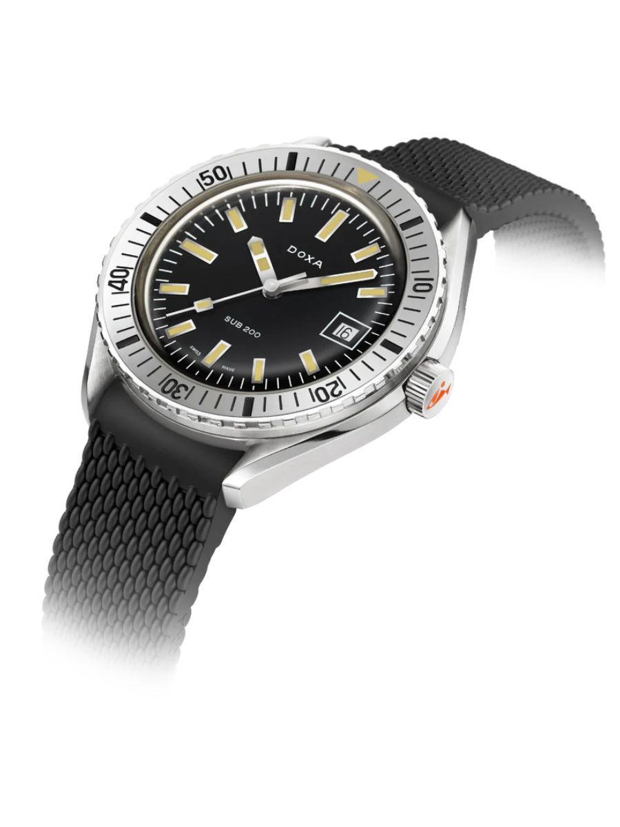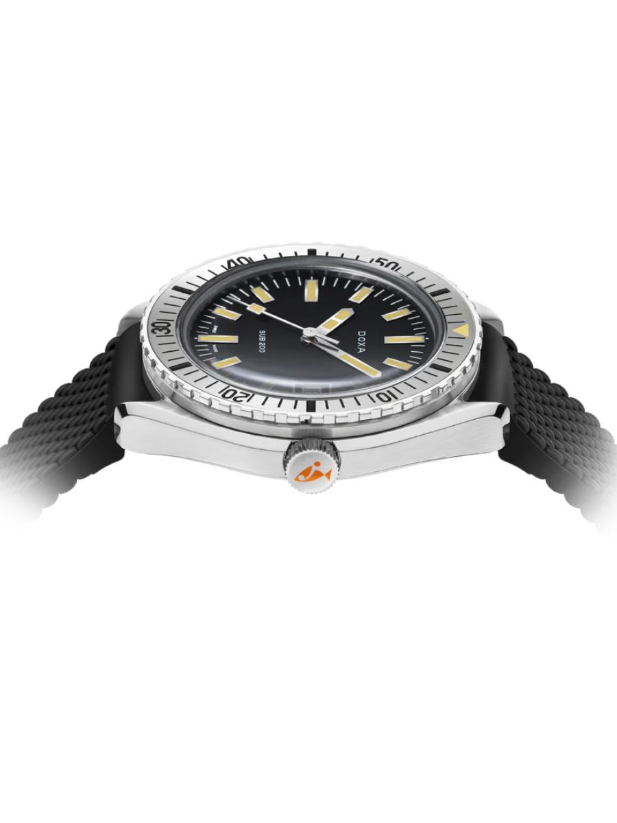 Unveiled at Baselworld 2019, this 3-hand diver's watch has a case made of highest-quality 316L stainless steel. At a diameter of 42 mm, the SUB 200 is topped by a scratch-resistant sapphire crystal with an anti-reflective coating and the distinctive curvature of the domed plexiglass used back in the day. Waterproof to a depth of 200 meters (20 ATM), the model features a unidirectional rotating bezel. All the elements providing dive-relevant information, including the bezel, have a Super‑LumiNova® luminescent coating. The bracelet is 316L stainless steel and features a folding clasp with the DOXA fish symbol.